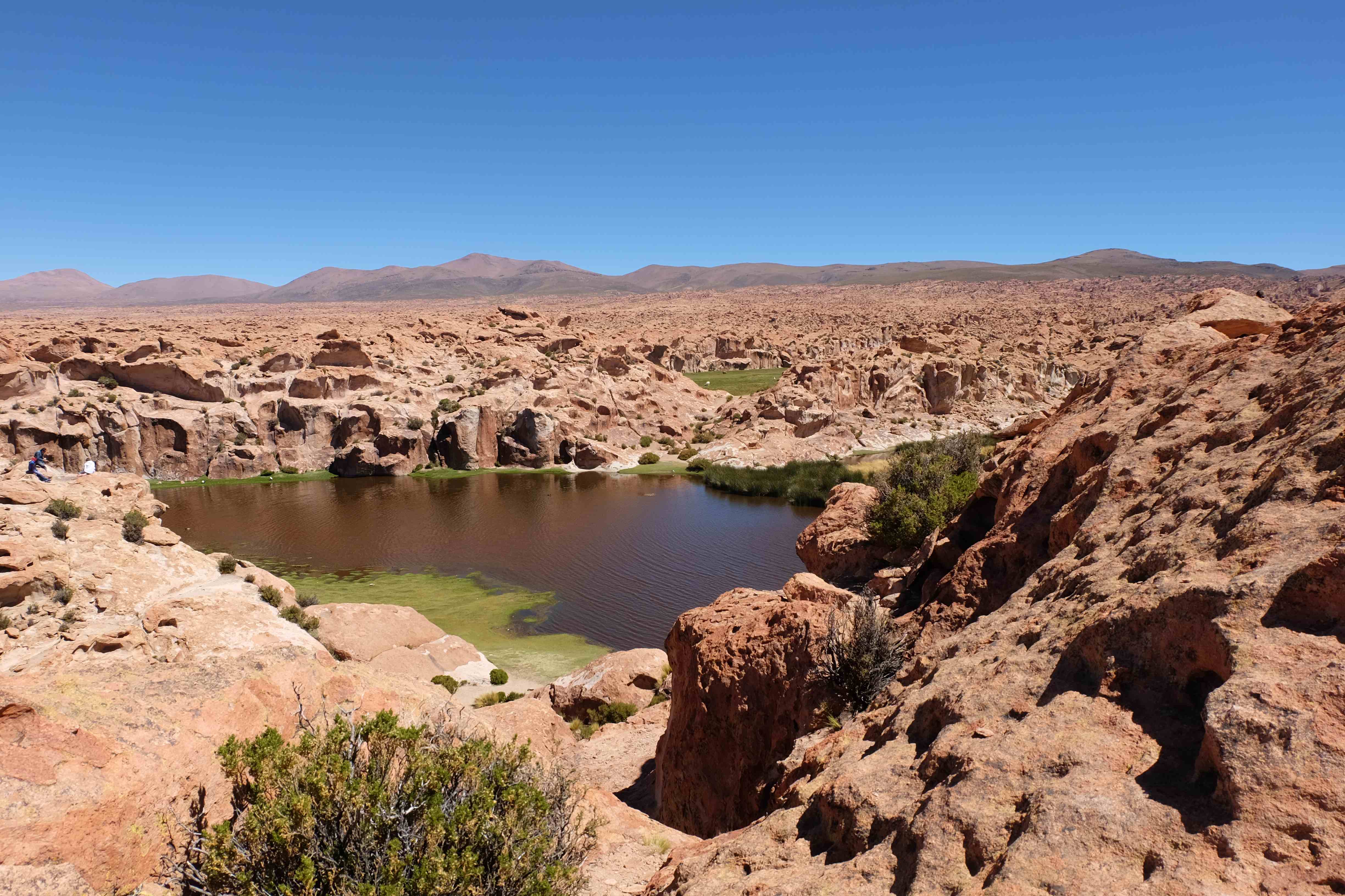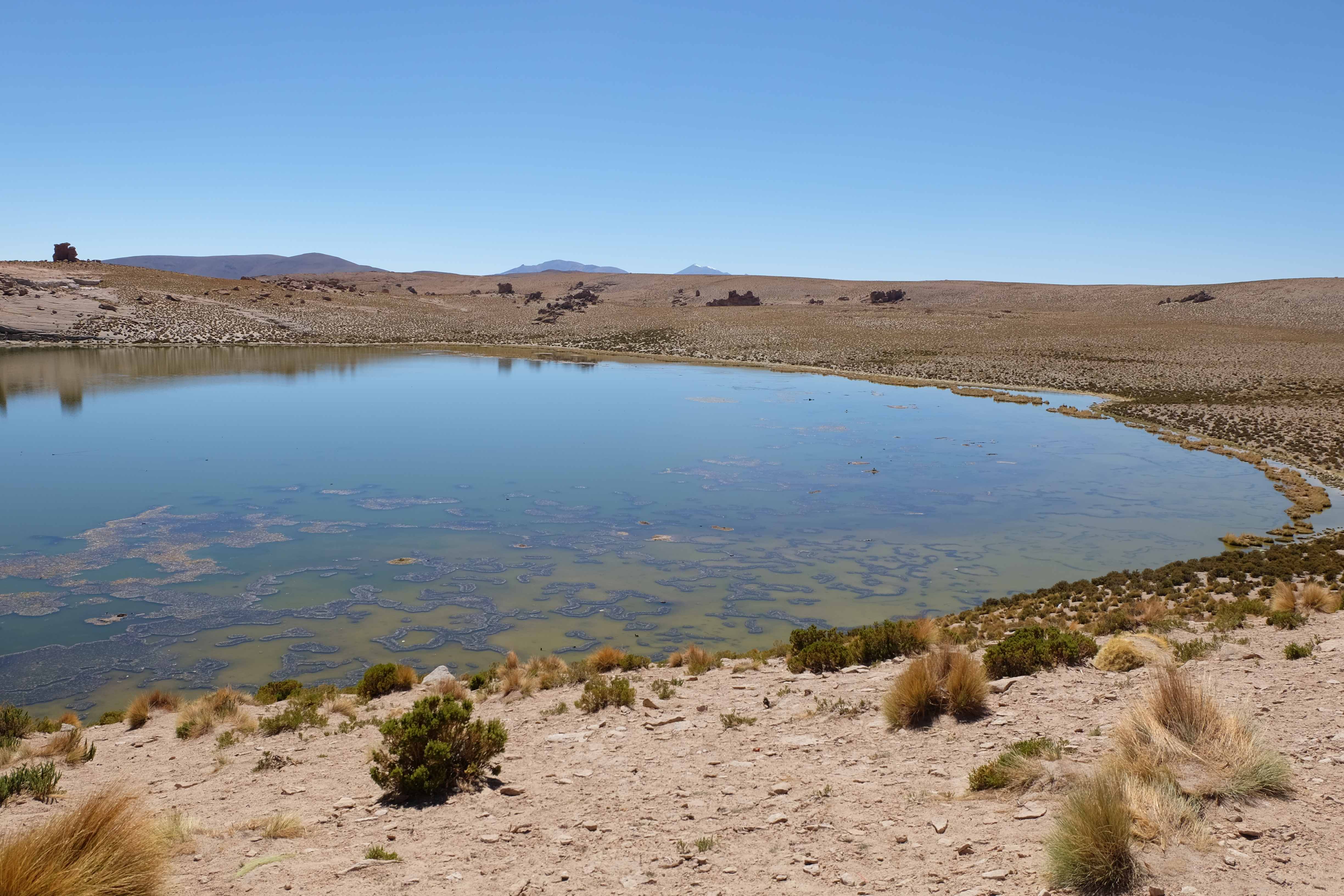 Langsam aber sicher sollte das Wunder vorbei sein, dachten wir uns. Wir mussten ja zurück, zurück in die reale Welt, zurück nach Uyuni, zurück auf Planet Erde. Aber das Märchen wollte kein Ende nehmen… die Natur wollte sich von uns mit einem friedlichen, magischen Ort verabschieden. Vielleicht um uns zu verführen? Um uns immer wieder zurückrufen zu können? Waren wir nun Gefangene dieser Schönheit? Wen kümmert es? Bei solchen Anblicken stören die Ketten gar nicht mehr! Zurück in Uyuni wurden wir von Allreisenden wieder zu normalen Menschen, welche ihren Alltagsbeschäftigungen und Bedürfnissen nachgehen mussten. Patric musste ein Ladegerät für seine Kamera finden – welches er tatsächlich in der alles enthaltende „la bolsita“ eines Kioskverkäufers fand, wir alle mussten uns diesmal mit Fleisch und nicht nur mit Naturschönheiten ernähren… und zu guter Letzt mussten wir unser Hab und Gut auf den Bus nach La Paz bringen, da eine Nachtreise uns bevorstand.