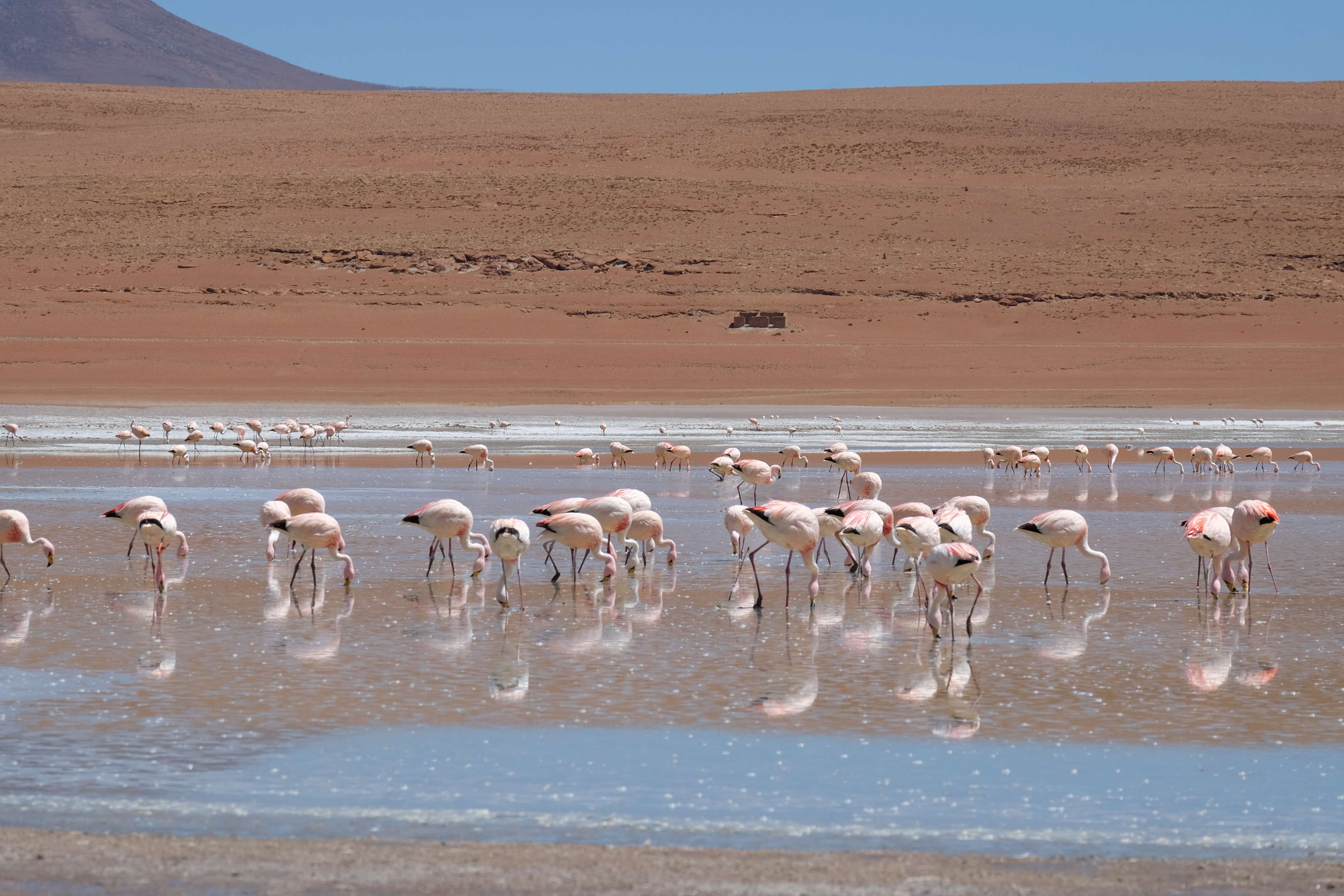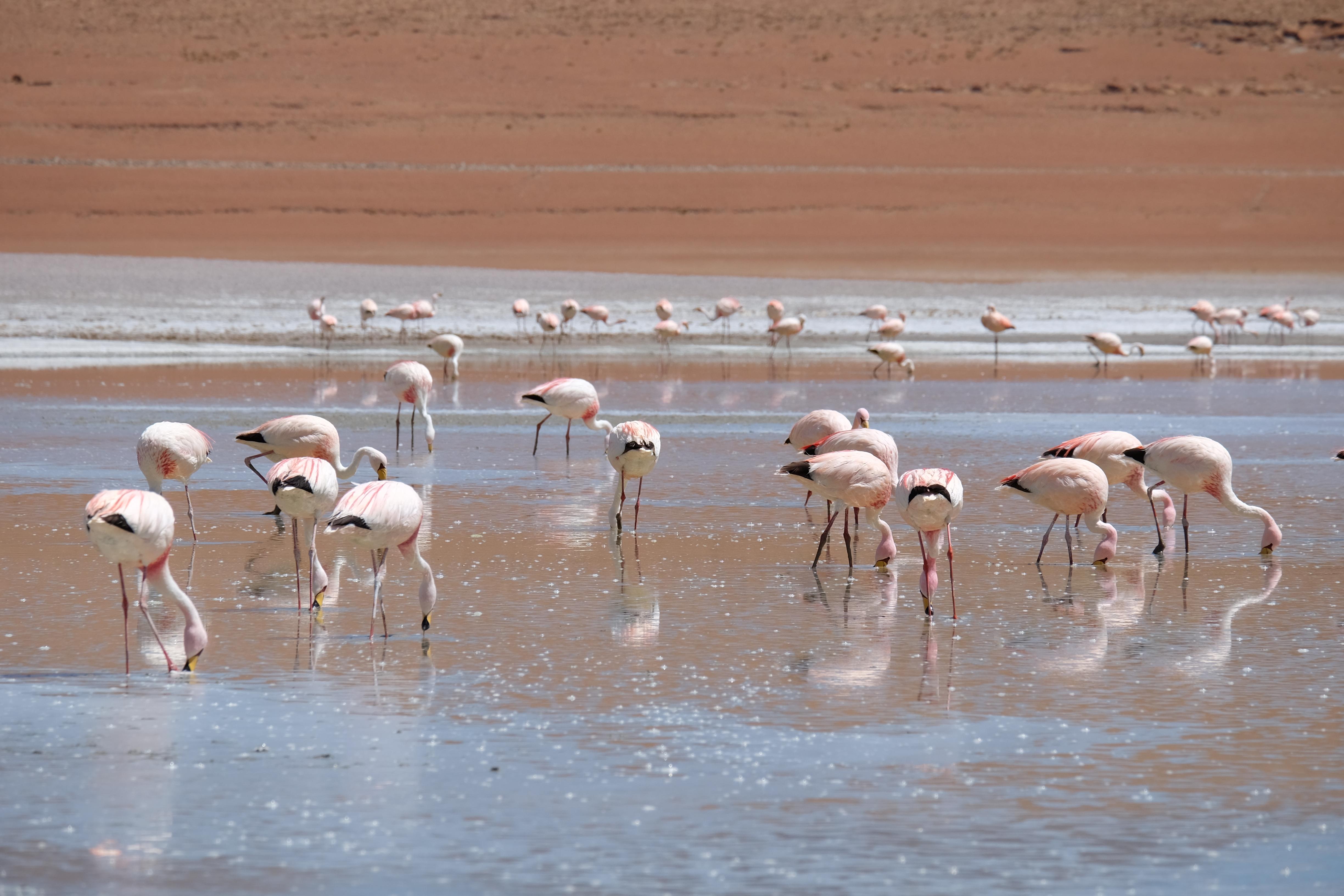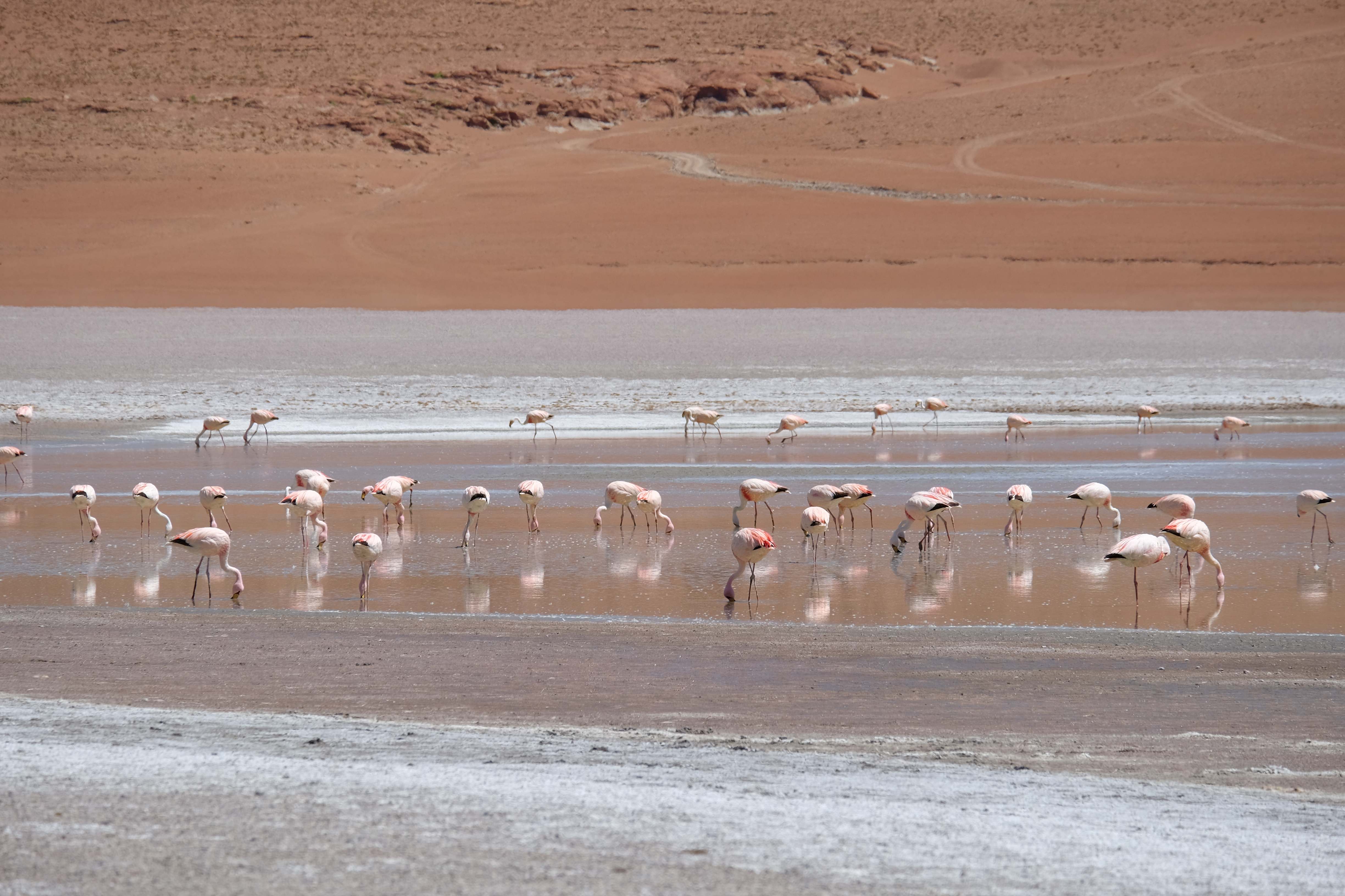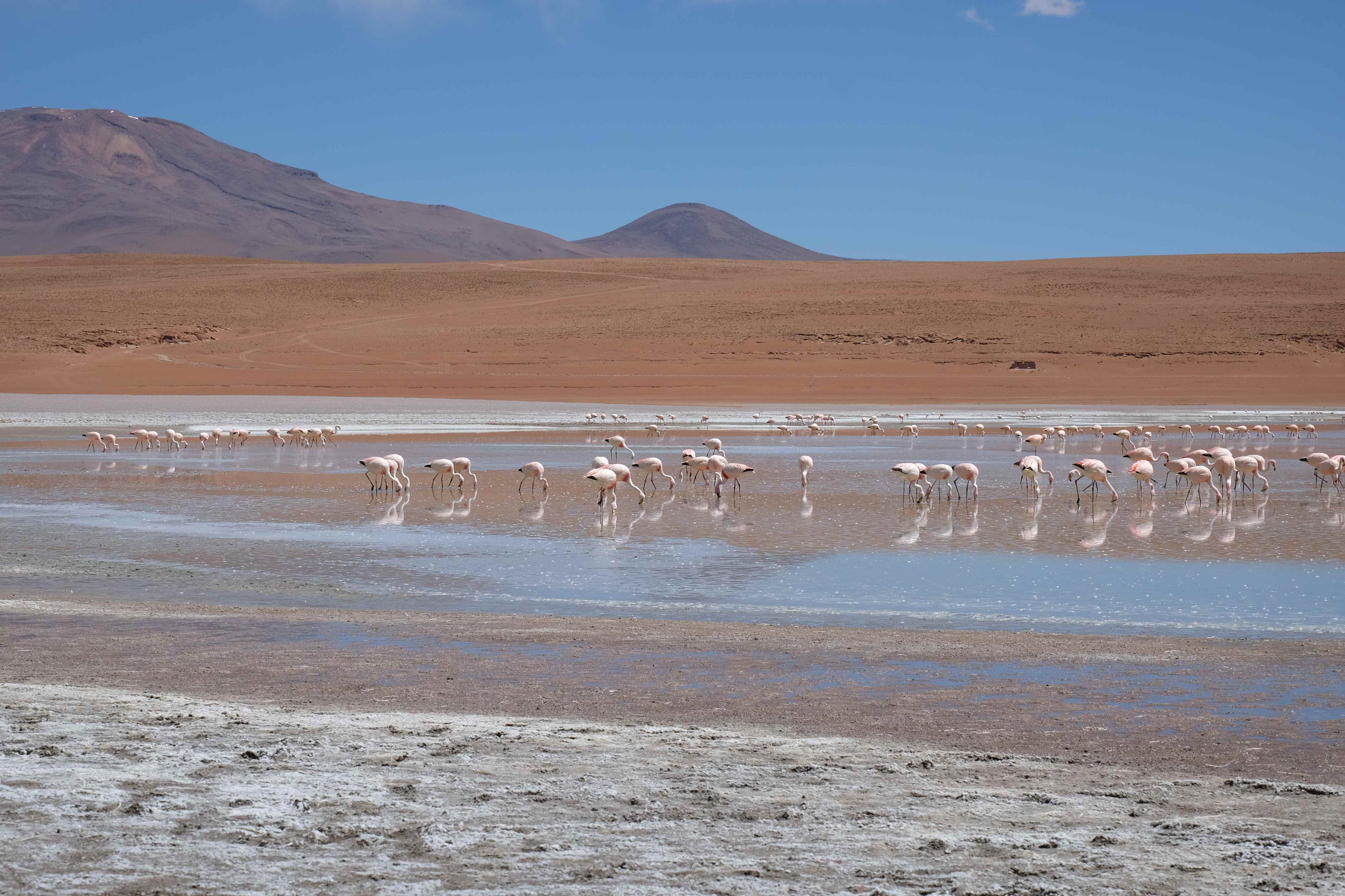 Oare putea sa devina si mai interesant? Putea sa intreaca ceva ceea ce deja vazuseram? Exista ceva si mai si? Ziua urmatoare incepuse in mod promitator: dupa o sumedenie de formatiuni de stanci si roci, care faceau dovada ca vantul isi incercase talentul de sculptor de-a lungul secolelor, au urmat ele: pasarile flamingo. Acele creaturi cu eleganta lor caracteristica si pata de culoare necesara pentru a transforma peisajul in ceva magnific care parca nu se potriveau deloc cu singuratatea si ariditatea acestor meleaguri, prezenta lor fiind astfel cu atat mai incredibila. Bineinteles ca ne-am lasat dusi de val si am inceput sa ne jucam cu aparatele de fotografiat asemeni unor copii care erau pe punctul de a descoperi lumea – si noi la randul nostru o descopeream, si inca ce lume! Una care isi ducea veacul in inaltimi uimitoare (intregul tur se desfasurase intre 4000 si 5000 m deasupra nivelului marii, insa parca nici nu iti dadeai seama ca te aflai la o asemenea altitudine, totul parea atat de plan, doar respiratia greoaie dupa cateva miscari mai solicitante iti aminteau unde te aflai), o lume de vis, o minune ascunsa undeva in indepartarile din Bolivia, o lume nebanuita de nimeni si probabil subestimata de multi care acum ni se asternea in fata ochilor in toata frumusetea sa. Ne indragostiseram… si ziua nici macar nu se terminase!