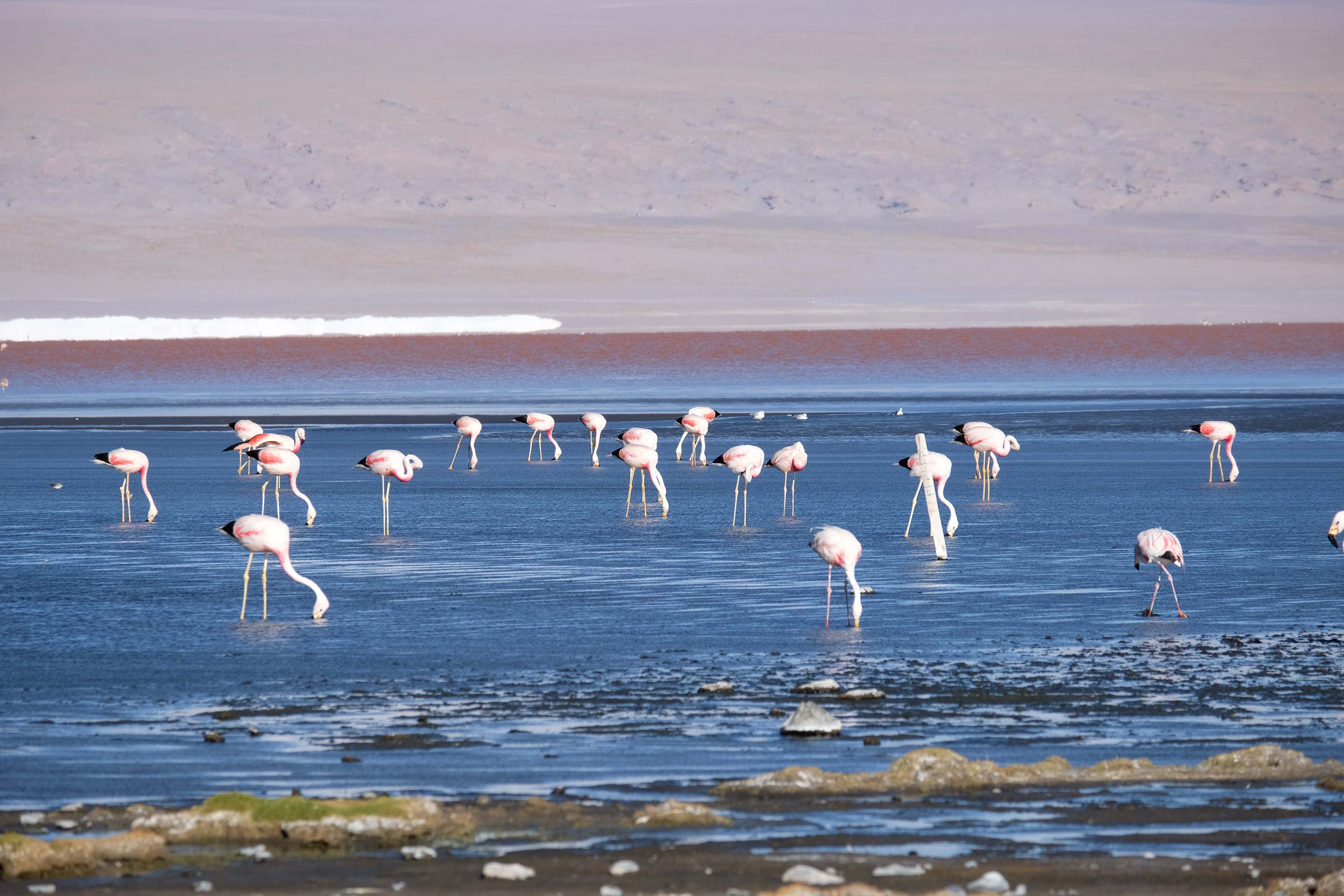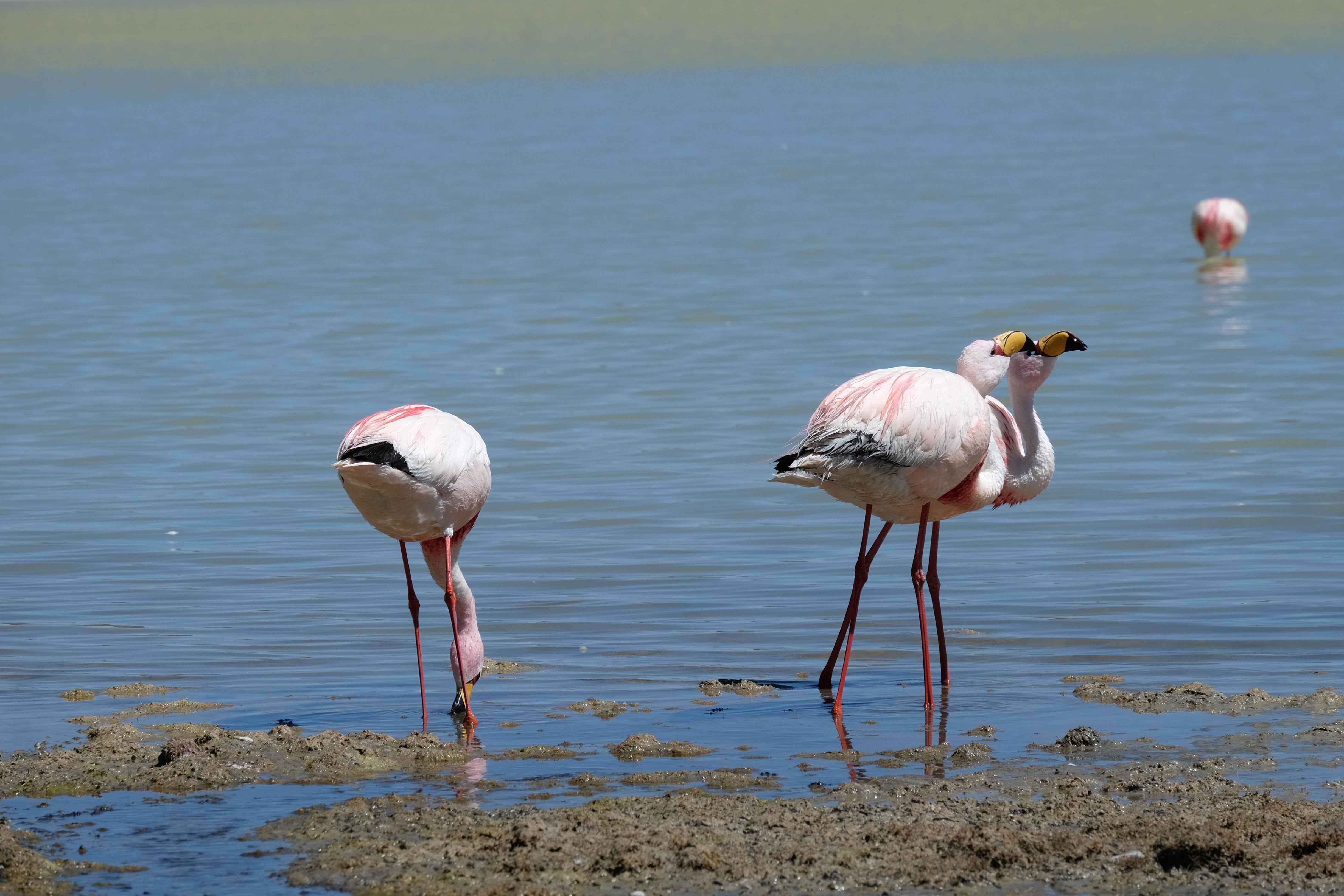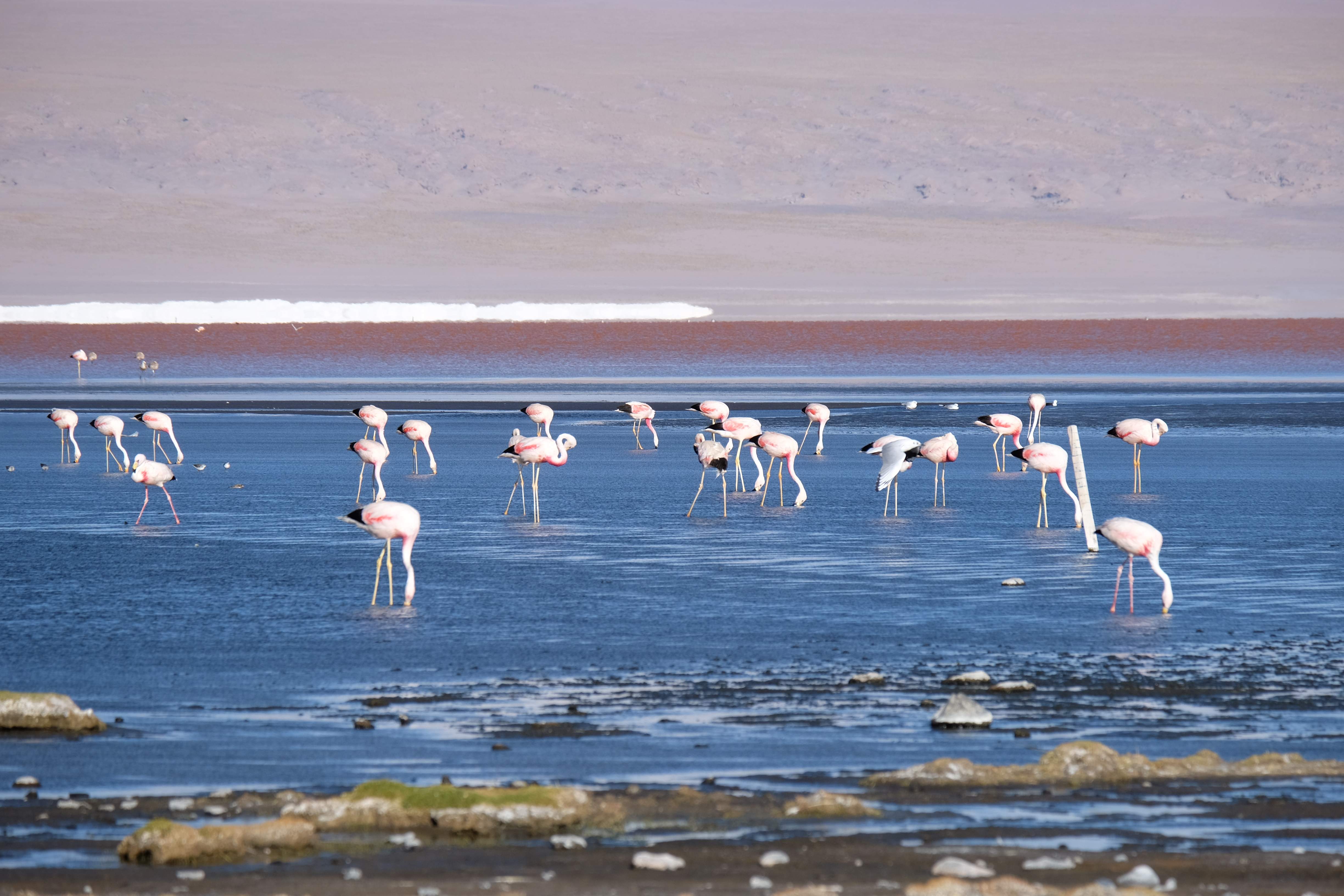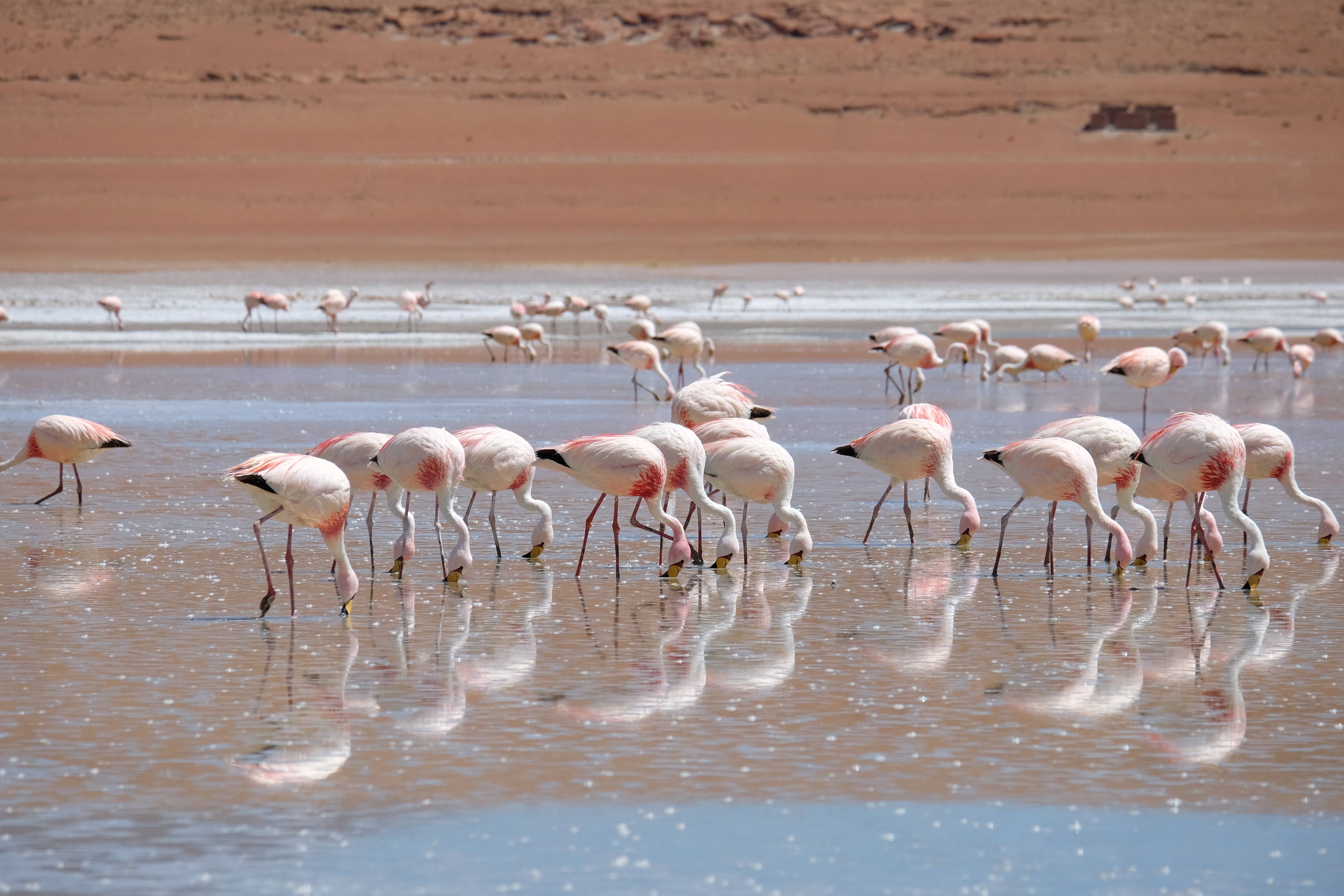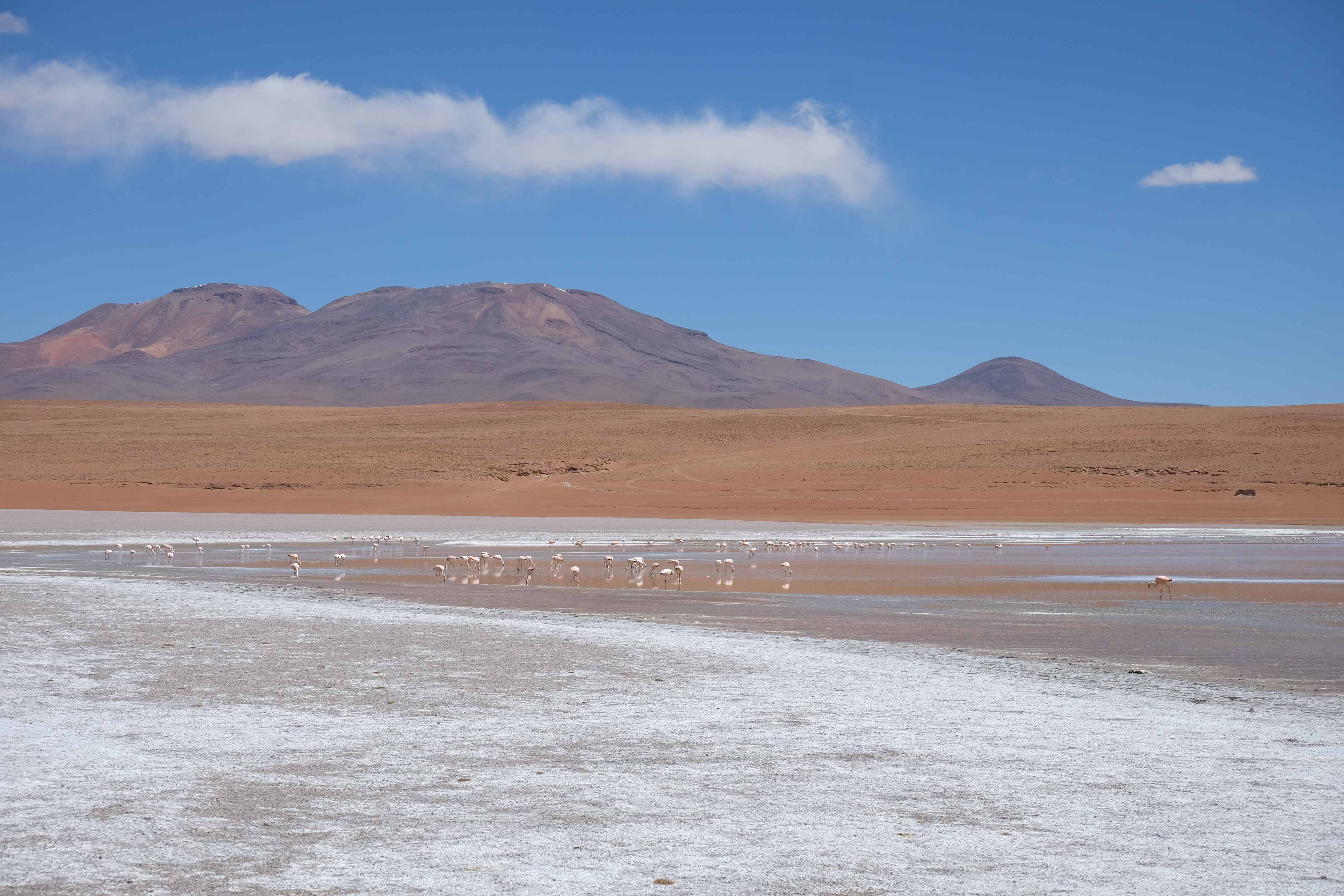 Oare putea sa devina si mai interesant? Putea sa intreaca ceva ceea ce deja vazuseram? Exista ceva si mai si? Ziua urmatoare incepuse in mod promitator: dupa o sumedenie de formatiuni de stanci si roci, care faceau dovada ca vantul isi incercase talentul de sculptor de-a lungul secolelor, au urmat ele: pasarile flamingo. Acele creaturi cu eleganta lor caracteristica si pata de culoare necesara pentru a transforma peisajul in ceva magnific care parca nu se potriveau deloc cu singuratatea si ariditatea acestor meleaguri, prezenta lor fiind astfel cu atat mai incredibila. Bineinteles ca ne-am lasat dusi de val si am inceput sa ne jucam cu aparatele de fotografiat asemeni unor copii care erau pe punctul de a descoperi lumea – si noi la randul nostru o descopeream, si inca ce lume! Una care isi ducea veacul in inaltimi uimitoare (intregul tur se desfasurase intre 4000 si 5000 m deasupra nivelului marii, insa parca nici nu iti dadeai seama ca te aflai la o asemenea altitudine, totul parea atat de plan, doar respiratia greoaie dupa cateva miscari mai solicitante iti aminteau unde te aflai), o lume de vis, o minune ascunsa undeva in indepartarile din Bolivia, o lume nebanuita de nimeni si probabil subestimata de multi care acum ni se asternea in fata ochilor in toata frumusetea sa. Ne indragostiseram… si ziua nici macar nu se terminase!