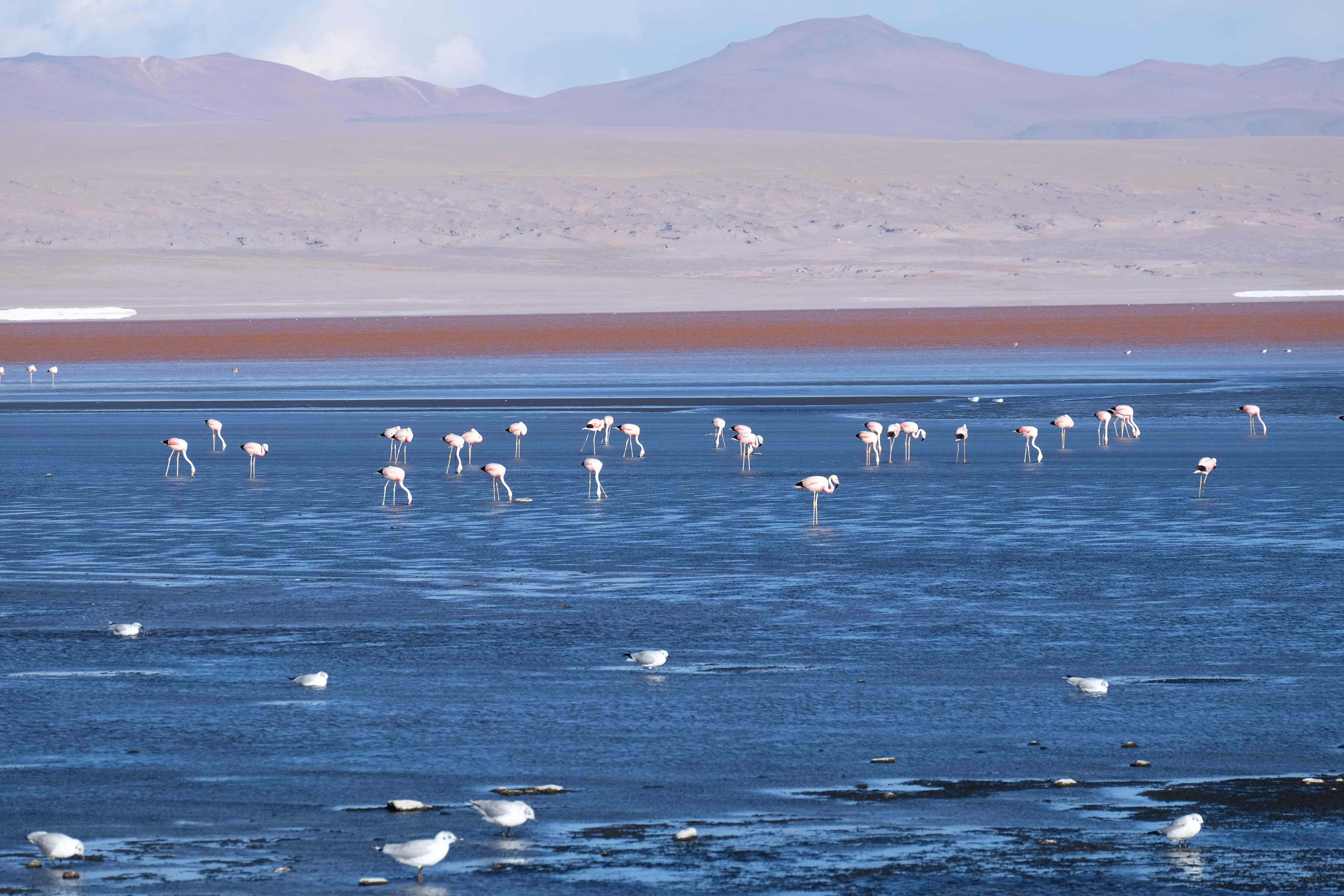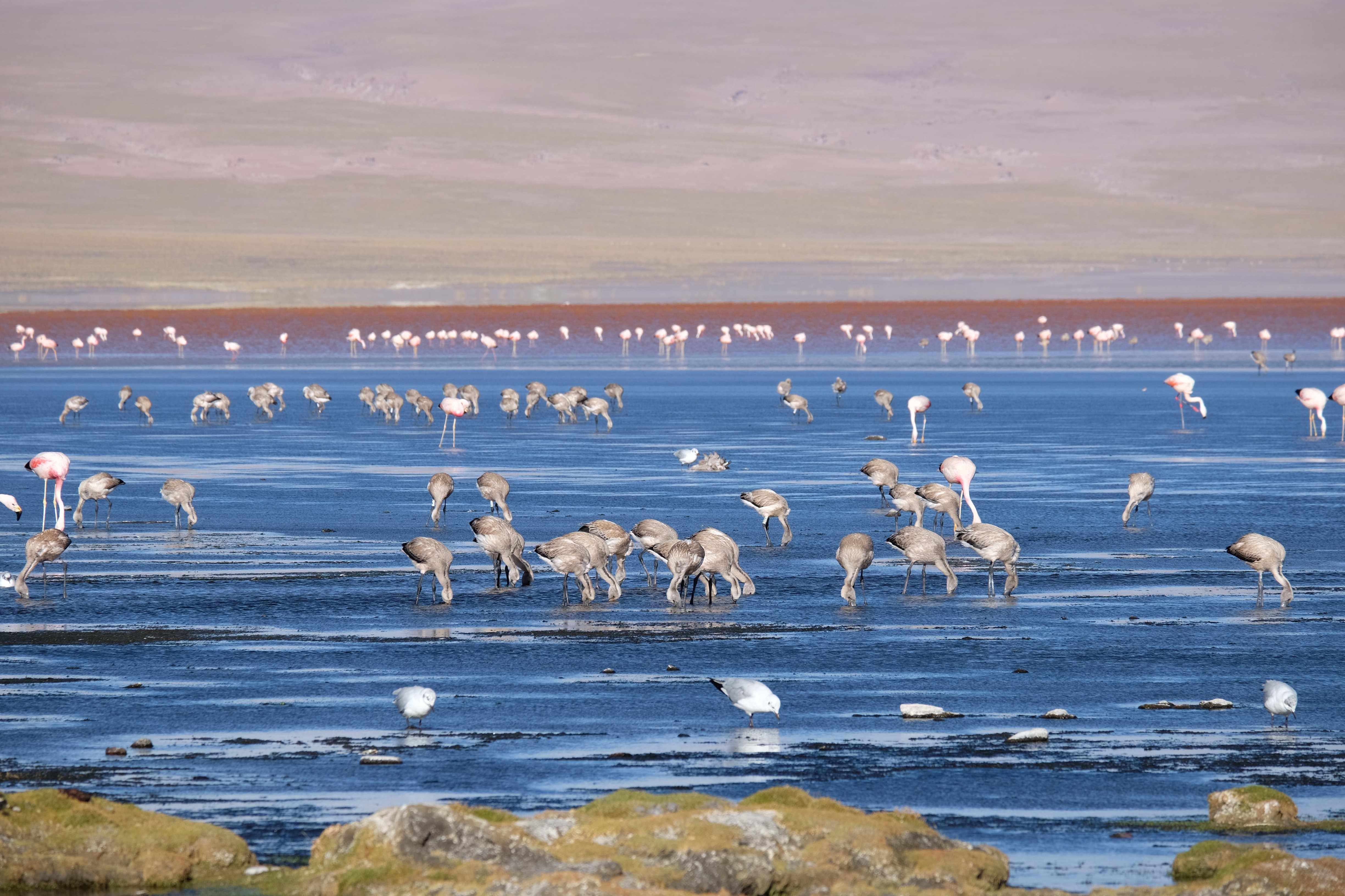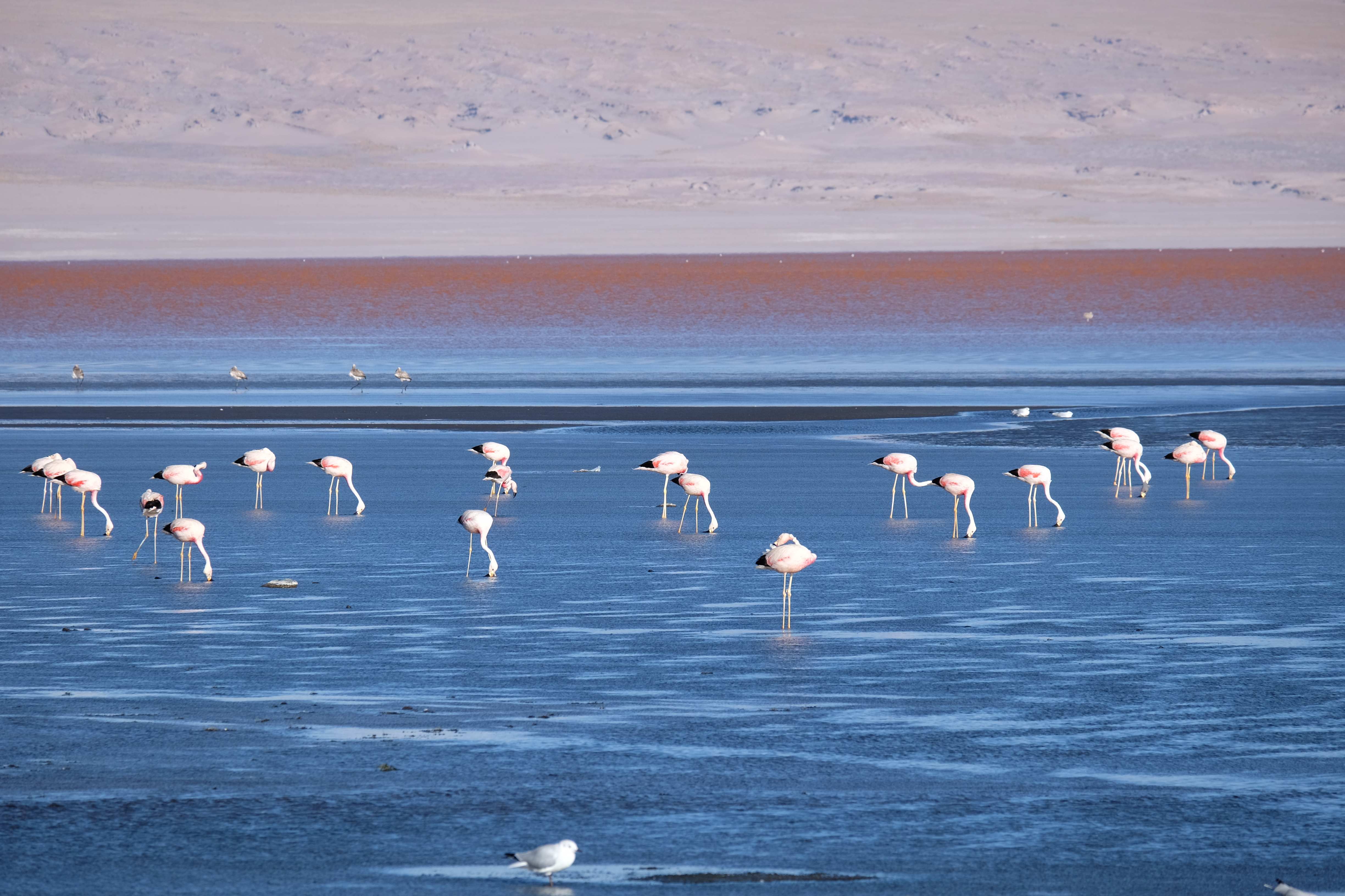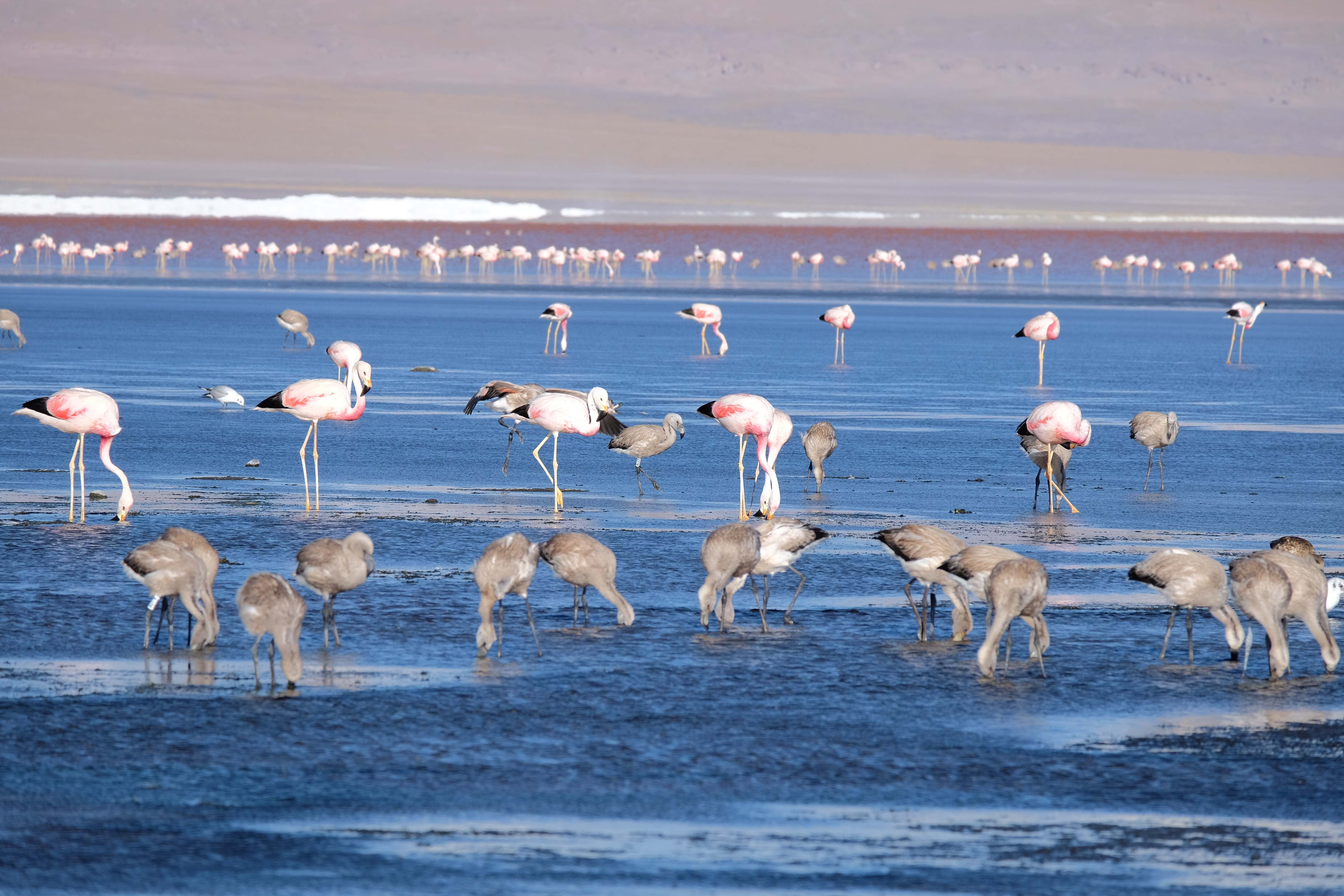 Oare putea sa devina si mai interesant? Putea sa intreaca ceva ceea ce deja vazuseram? Exista ceva si mai si? Ziua urmatoare incepuse in mod promitator: dupa o sumedenie de formatiuni de stanci si roci, care faceau dovada ca vantul isi incercase talentul de sculptor de-a lungul secolelor, au urmat ele: pasarile flamingo. Acele creaturi cu eleganta lor caracteristica si pata de culoare necesara pentru a transforma peisajul in ceva magnific care parca nu se potriveau deloc cu singuratatea si ariditatea acestor meleaguri, prezenta lor fiind astfel cu atat mai incredibila. Bineinteles ca ne-am lasat dusi de val si am inceput sa ne jucam cu aparatele de fotografiat asemeni unor copii care erau pe punctul de a descoperi lumea – si noi la randul nostru o descopeream, si inca ce lume! Una care isi ducea veacul in inaltimi uimitoare (intregul tur se desfasurase intre 4000 si 5000 m deasupra nivelului marii, insa parca nici nu iti dadeai seama ca te aflai la o asemenea altitudine, totul parea atat de plan, doar respiratia greoaie dupa cateva miscari mai solicitante iti aminteau unde te aflai), o lume de vis, o minune ascunsa undeva in indepartarile din Bolivia, o lume nebanuita de nimeni si probabil subestimata de multi care acum ni se asternea in fata ochilor in toata frumusetea sa. Ne indragostiseram… si ziua nici macar nu se terminase!
