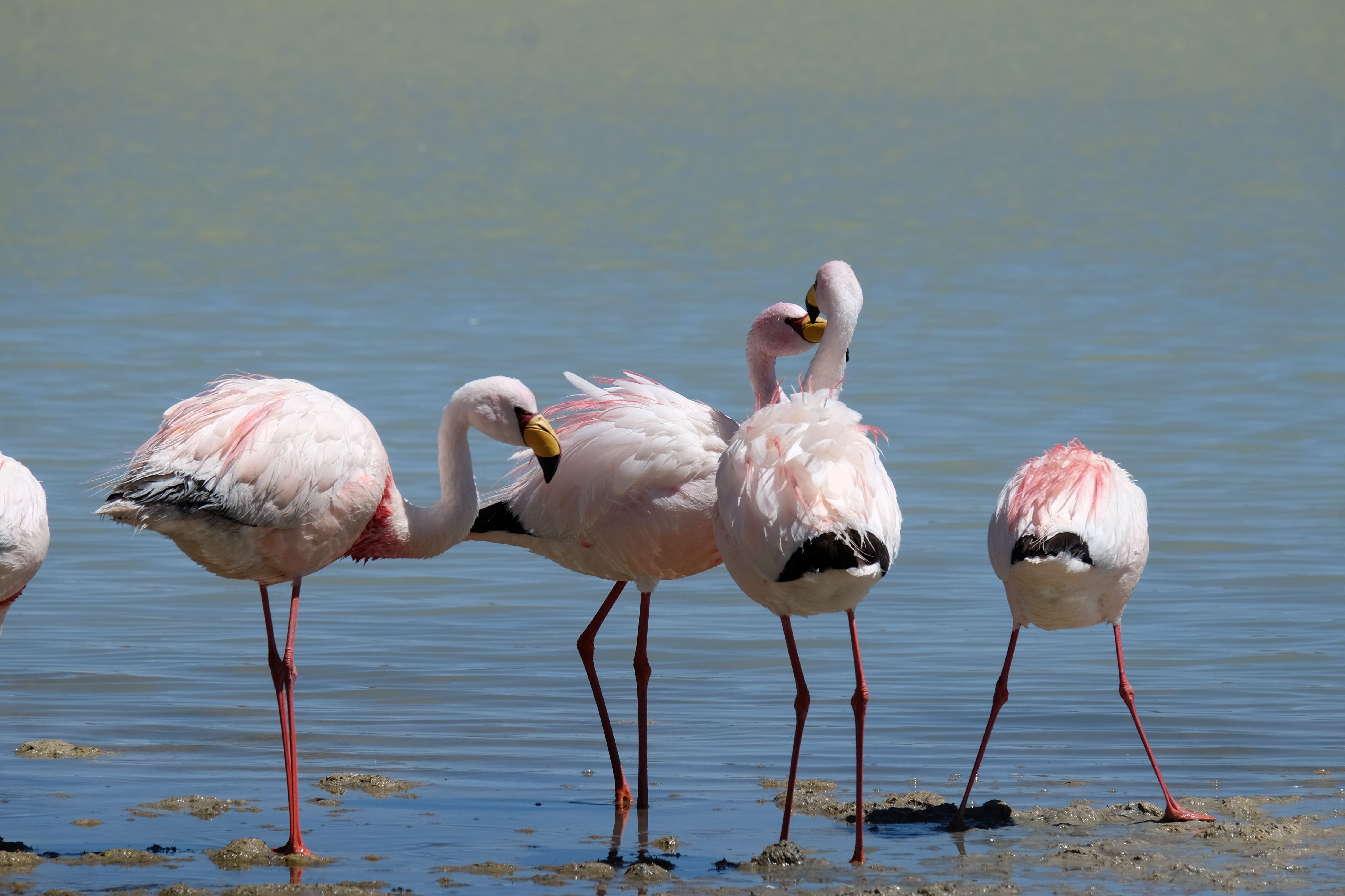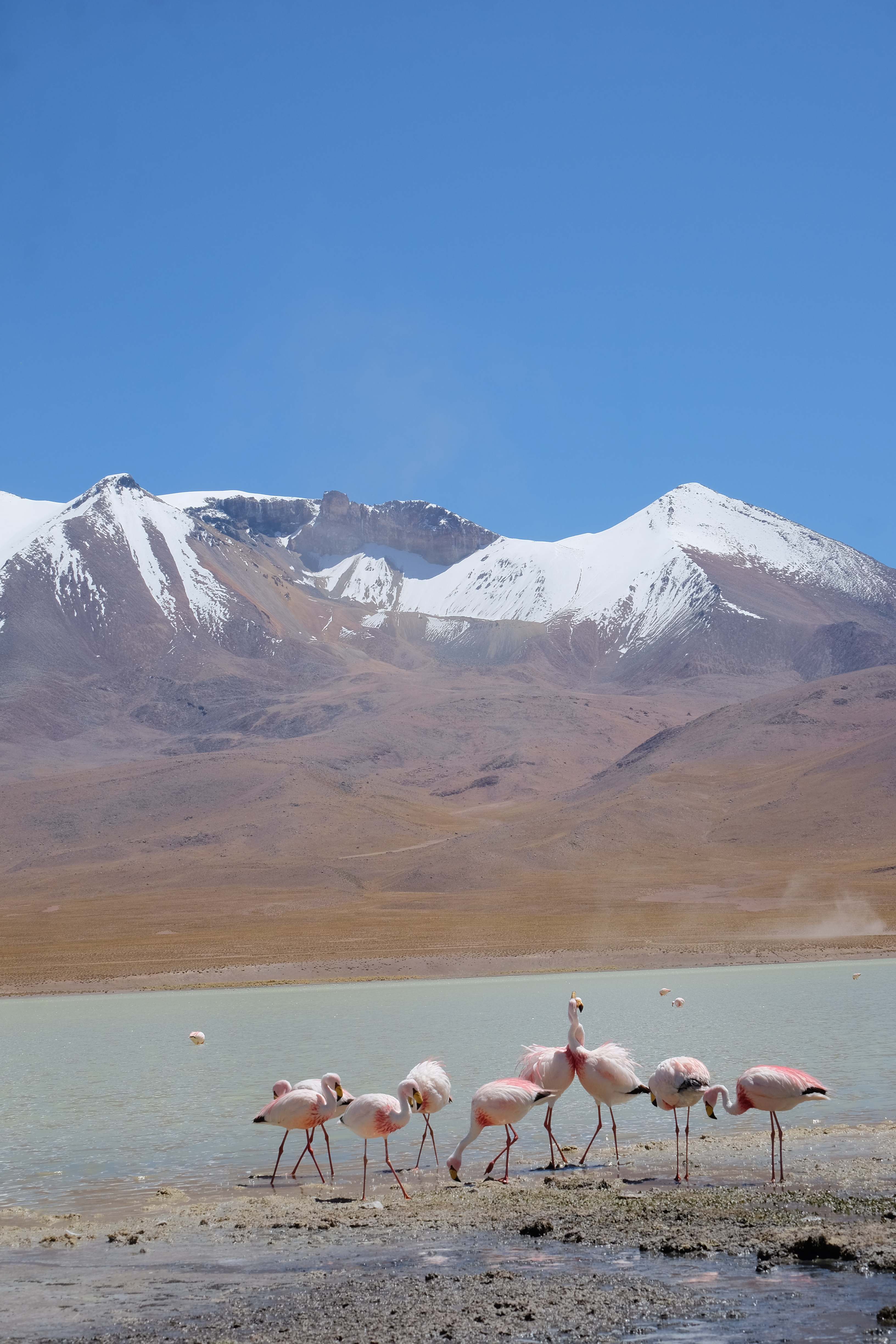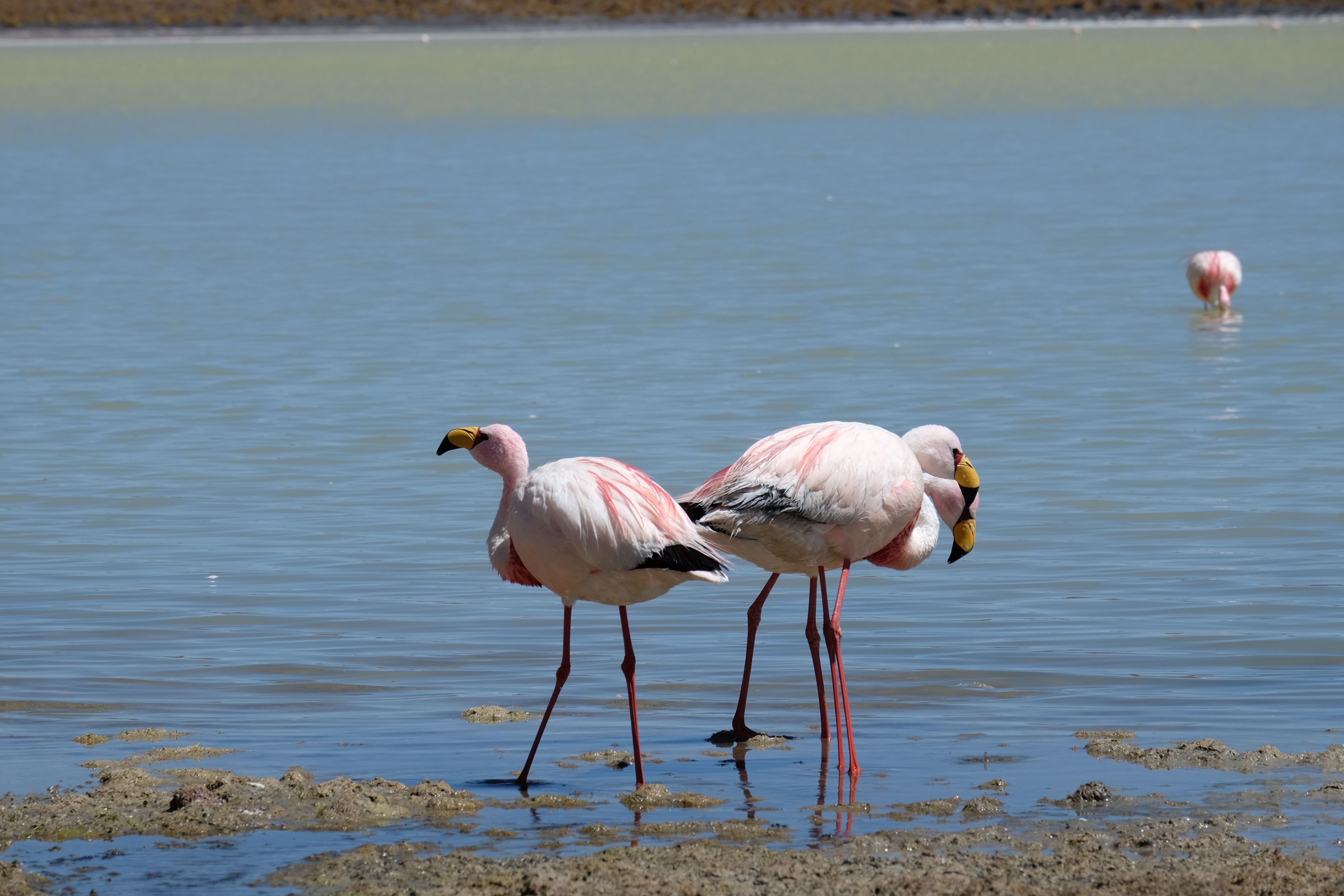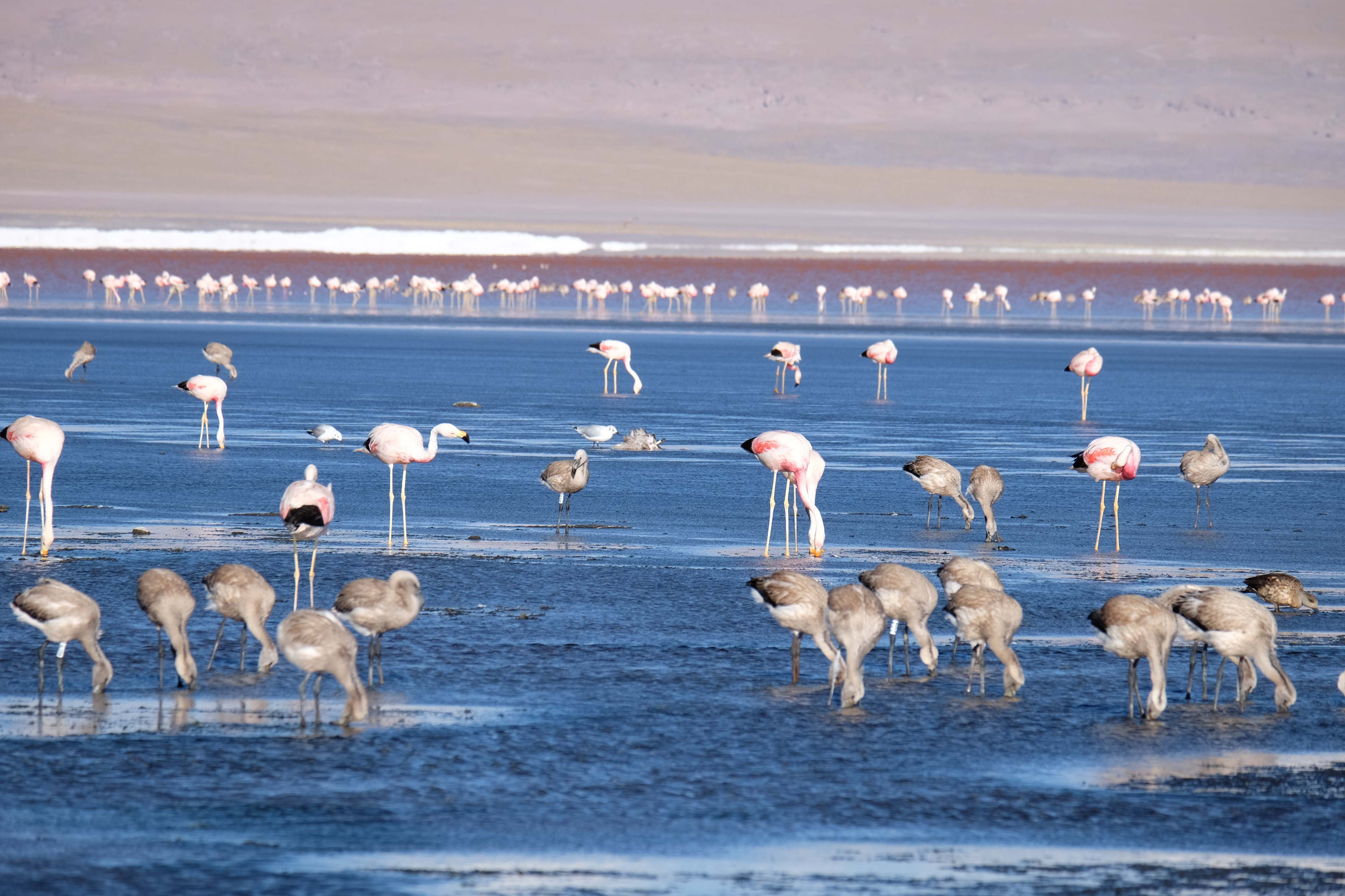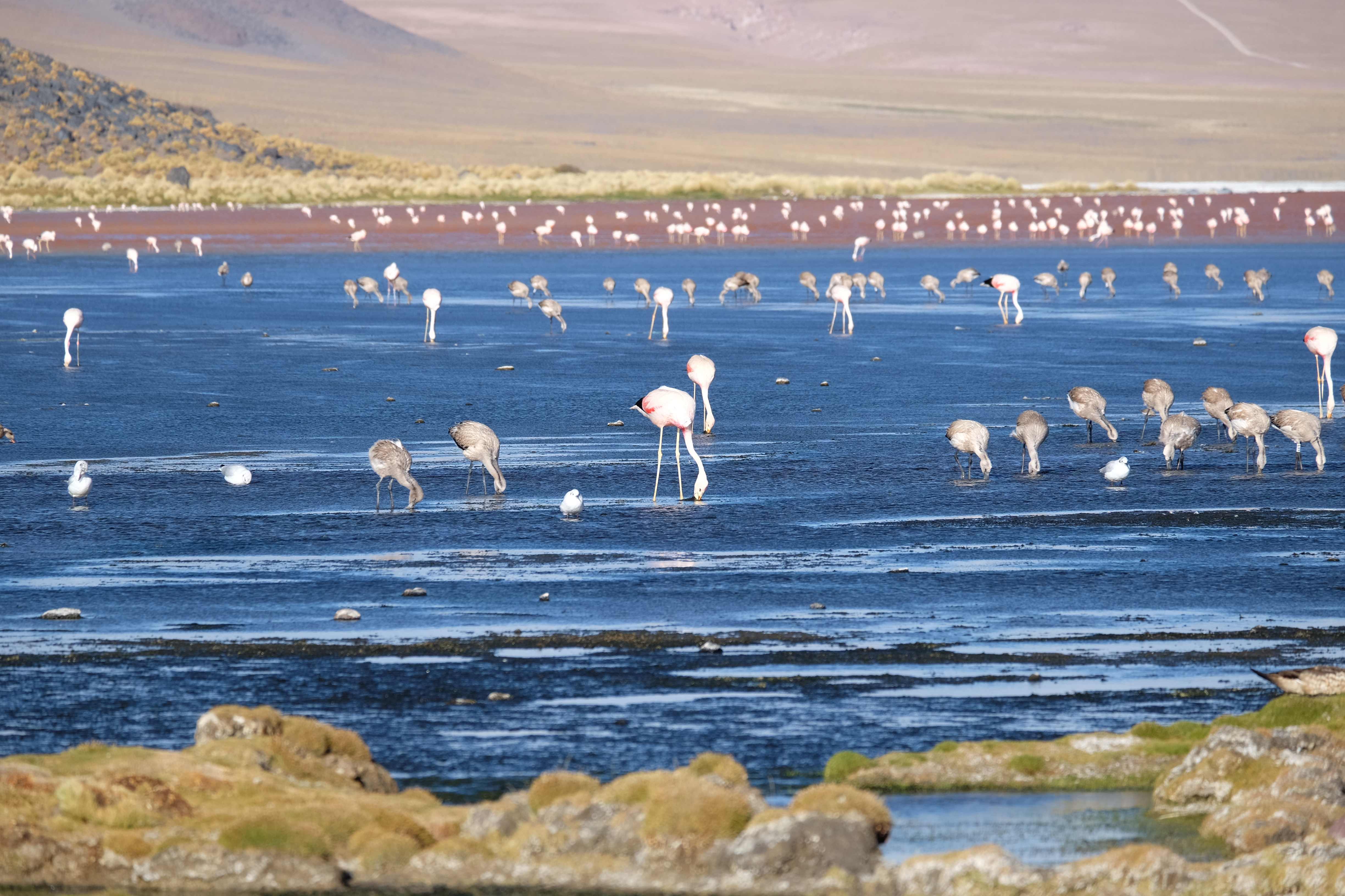 Oare putea sa devina si mai interesant? Putea sa intreaca ceva ceea ce deja vazuseram? Exista ceva si mai si? Ziua urmatoare incepuse in mod promitator: dupa o sumedenie de formatiuni de stanci si roci, care faceau dovada ca vantul isi incercase talentul de sculptor de-a lungul secolelor, au urmat ele: pasarile flamingo. Acele creaturi cu eleganta lor caracteristica si pata de culoare necesara pentru a transforma peisajul in ceva magnific care parca nu se potriveau deloc cu singuratatea si ariditatea acestor meleaguri, prezenta lor fiind astfel cu atat mai incredibila. Bineinteles ca ne-am lasat dusi de val si am inceput sa ne jucam cu aparatele de fotografiat asemeni unor copii care erau pe punctul de a descoperi lumea – si noi la randul nostru o descopeream, si inca ce lume! Una care isi ducea veacul in inaltimi uimitoare (intregul tur se desfasurase intre 4000 si 5000 m deasupra nivelului marii, insa parca nici nu iti dadeai seama ca te aflai la o asemenea altitudine, totul parea atat de plan, doar respiratia greoaie dupa cateva miscari mai solicitante iti aminteau unde te aflai), o lume de vis, o minune ascunsa undeva in indepartarile din Bolivia, o lume nebanuita de nimeni si probabil subestimata de multi care acum ni se asternea in fata ochilor in toata frumusetea sa. Ne indragostiseram… si ziua nici macar nu se terminase!