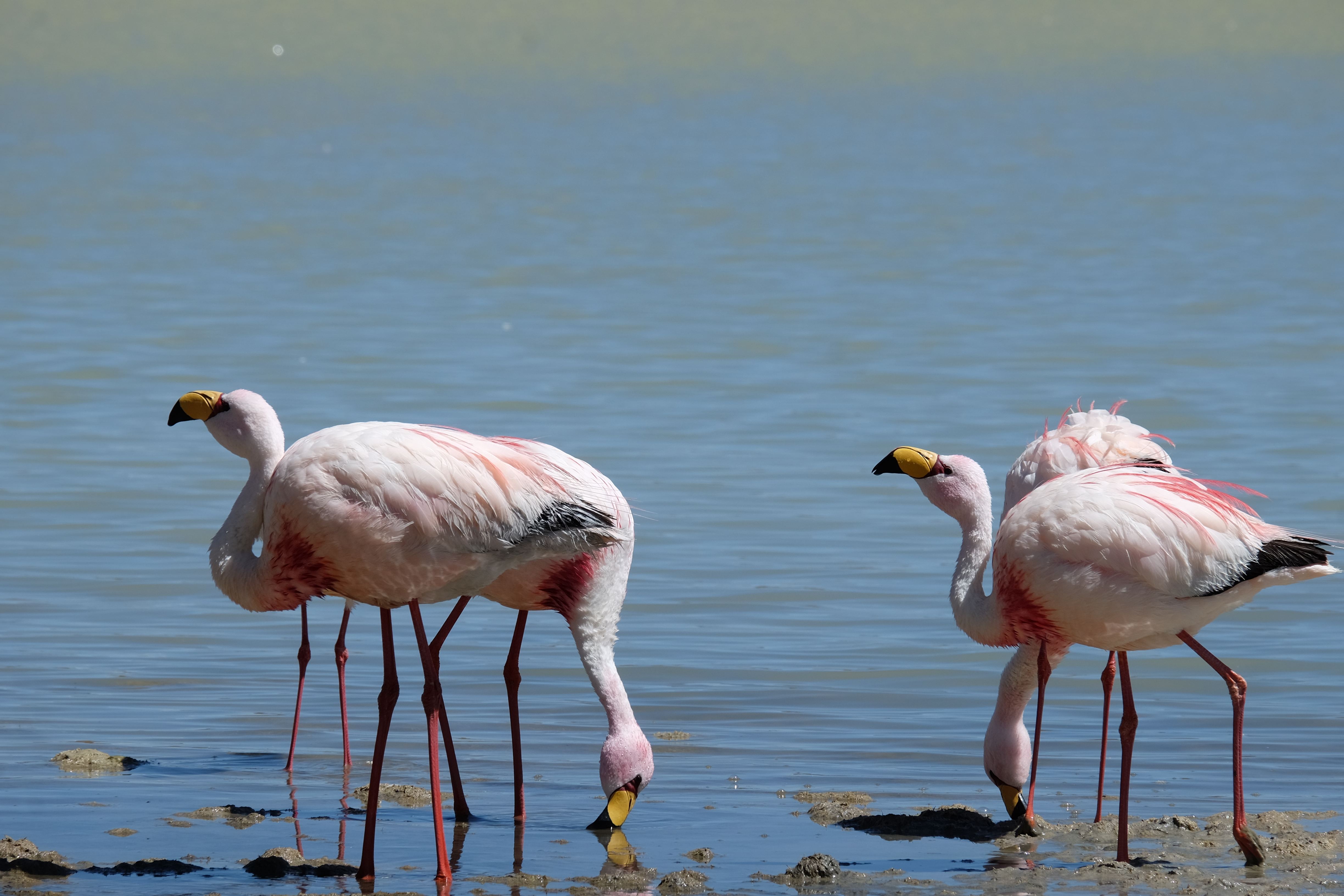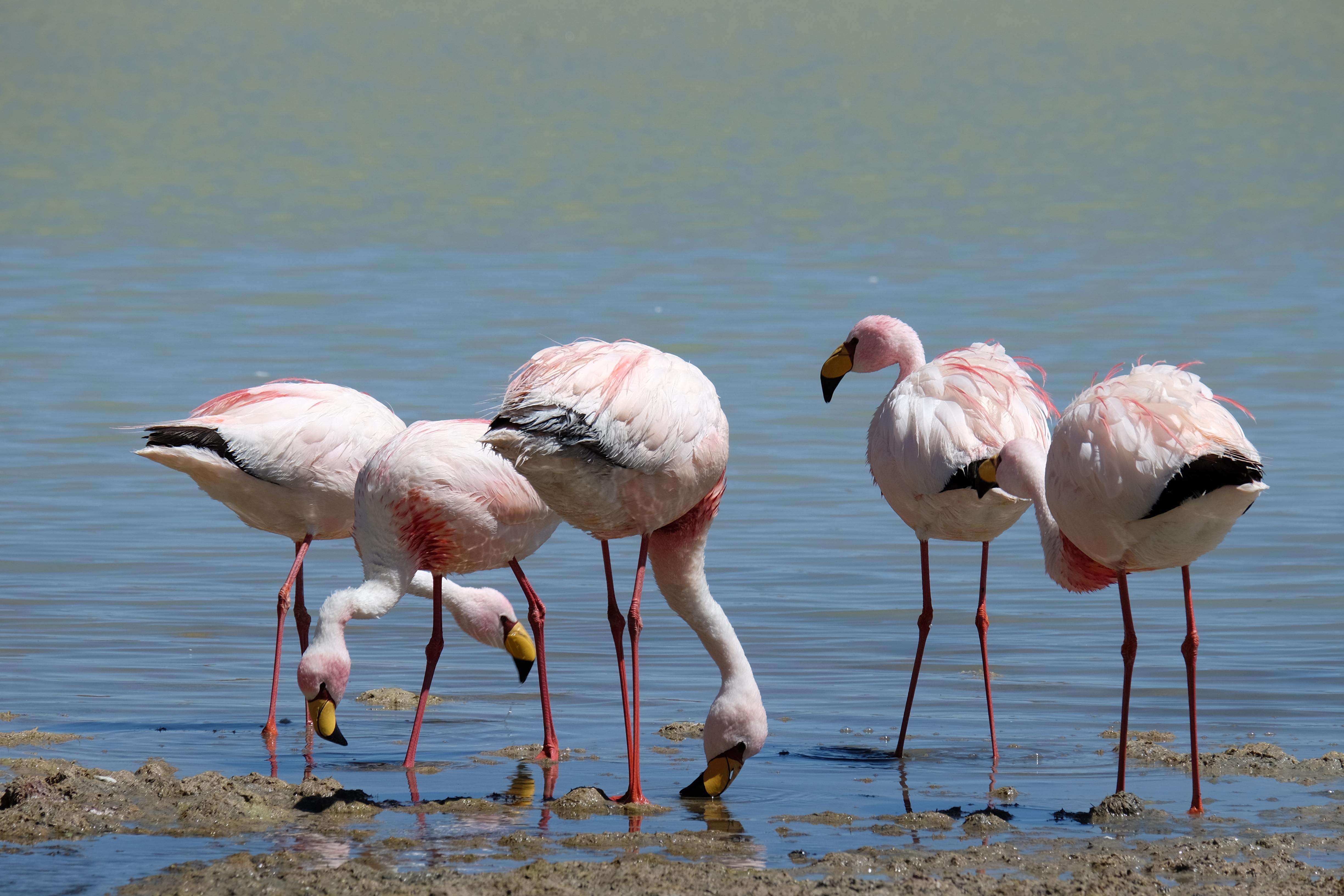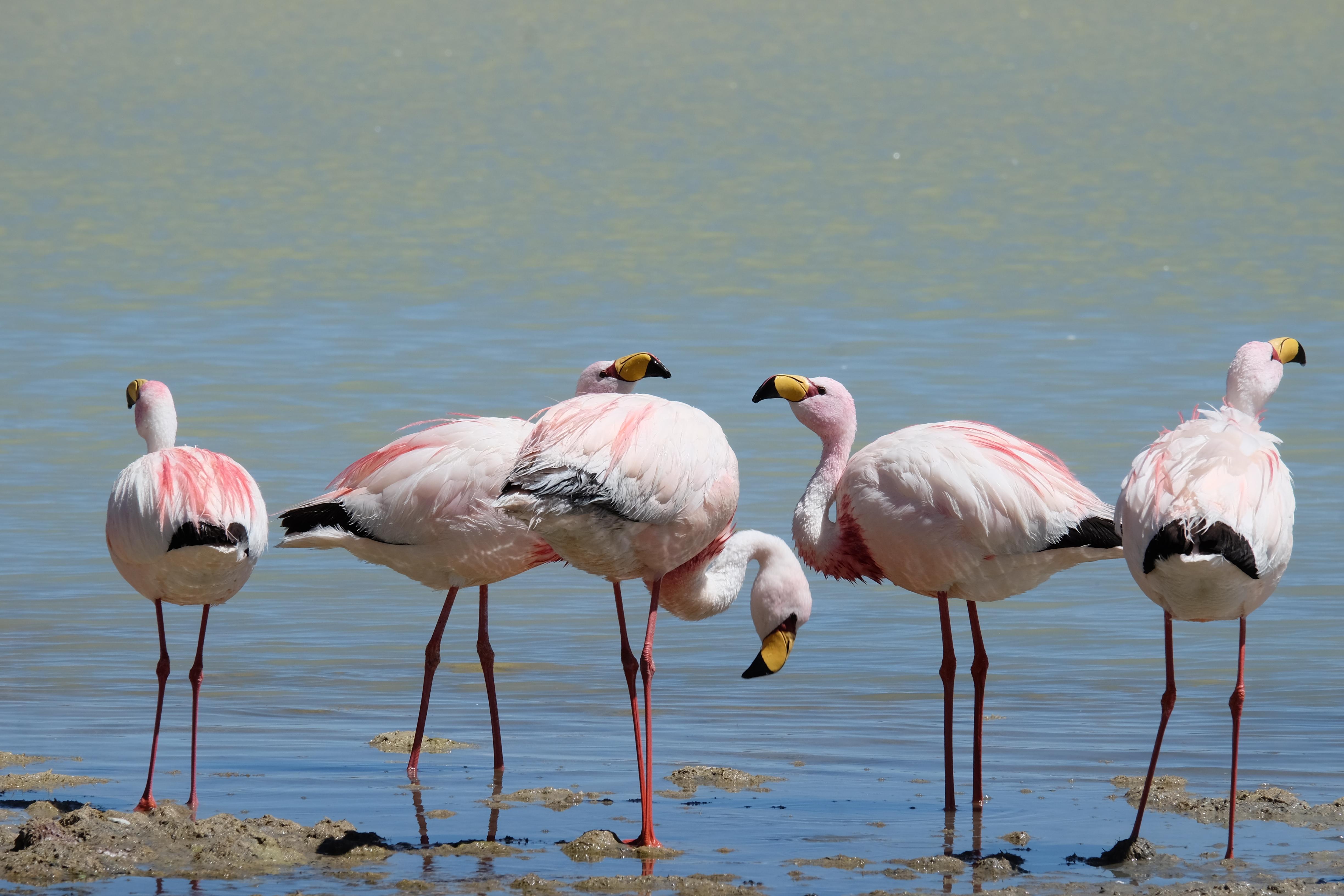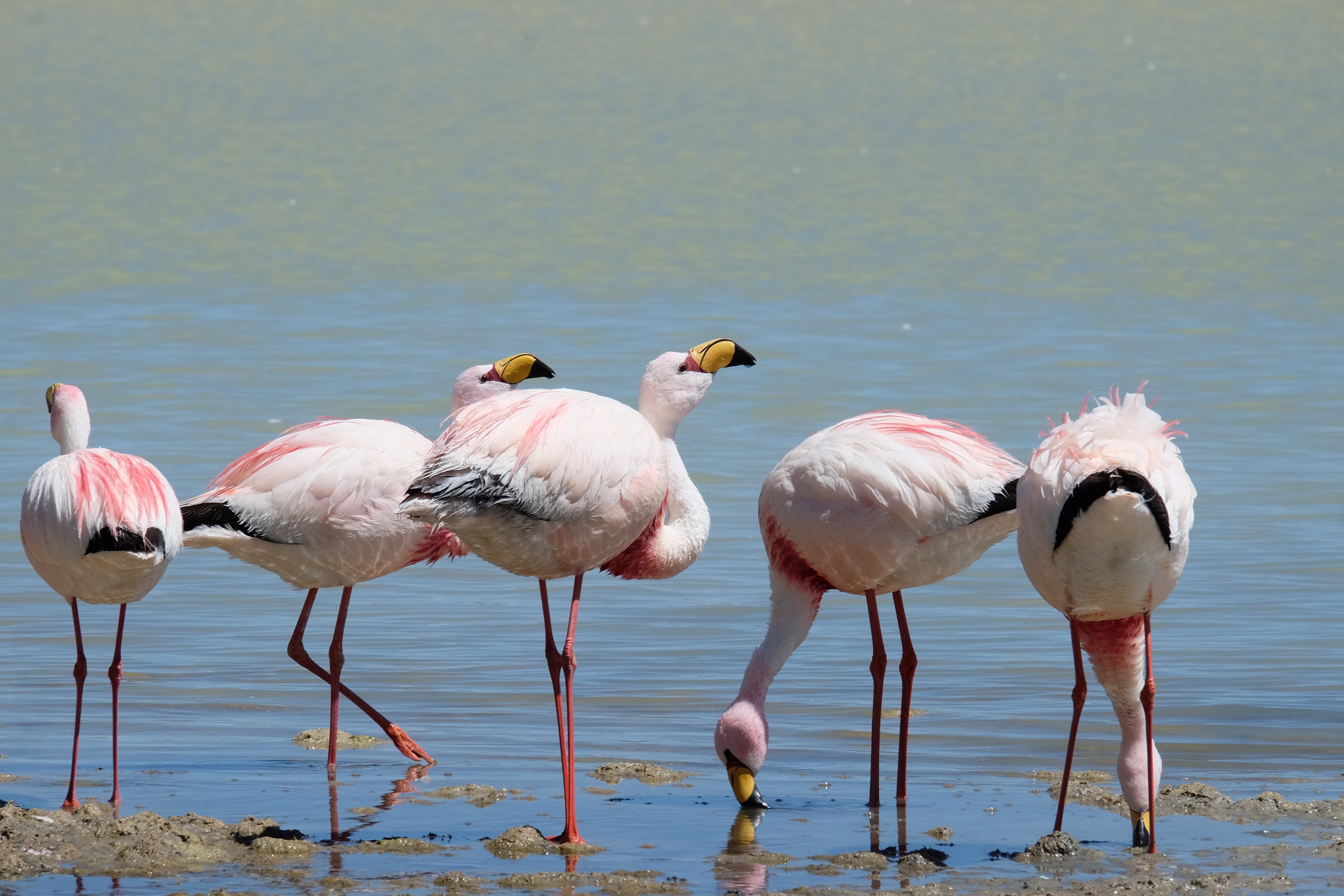 Oare putea sa devina si mai interesant? Putea sa intreaca ceva ceea ce deja vazuseram? Exista ceva si mai si? Ziua urmatoare incepuse in mod promitator: dupa o sumedenie de formatiuni de stanci si roci, care faceau dovada ca vantul isi incercase talentul de sculptor de-a lungul secolelor, au urmat ele: pasarile flamingo. Acele creaturi cu eleganta lor caracteristica si pata de culoare necesara pentru a transforma peisajul in ceva magnific care parca nu se potriveau deloc cu singuratatea si ariditatea acestor meleaguri, prezenta lor fiind astfel cu atat mai incredibila. Bineinteles ca ne-am lasat dusi de val si am inceput sa ne jucam cu aparatele de fotografiat asemeni unor copii care erau pe punctul de a descoperi lumea – si noi la randul nostru o descopeream, si inca ce lume! Una care isi ducea veacul in inaltimi uimitoare (intregul tur se desfasurase intre 4000 si 5000 m deasupra nivelului marii, insa parca nici nu iti dadeai seama ca te aflai la o asemenea altitudine, totul parea atat de plan, doar respiratia greoaie dupa cateva miscari mai solicitante iti aminteau unde te aflai), o lume de vis, o minune ascunsa undeva in indepartarile din Bolivia, o lume nebanuita de nimeni si probabil subestimata de multi care acum ni se asternea in fata ochilor in toata frumusetea sa. Ne indragostiseram… si ziua nici macar nu se terminase!