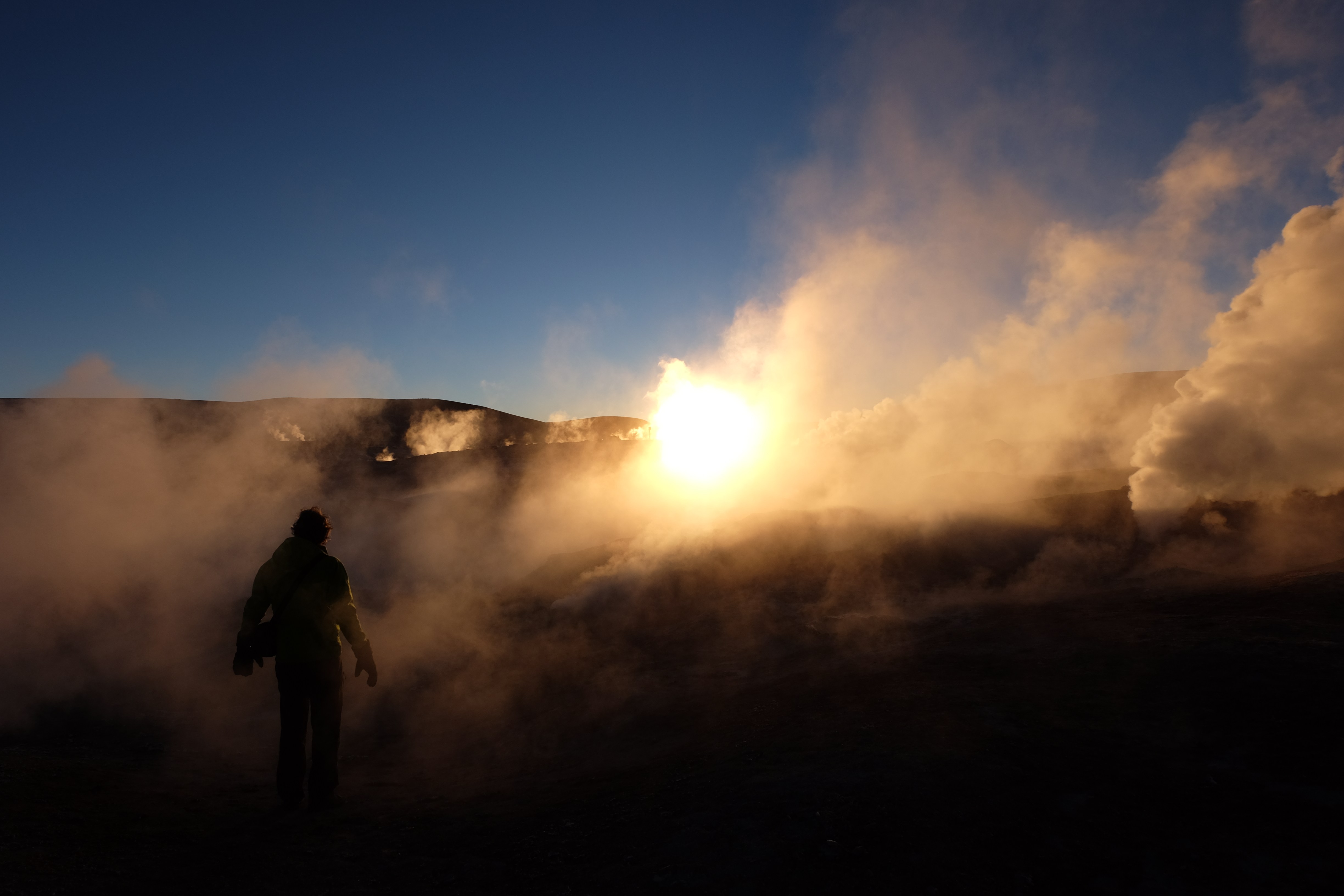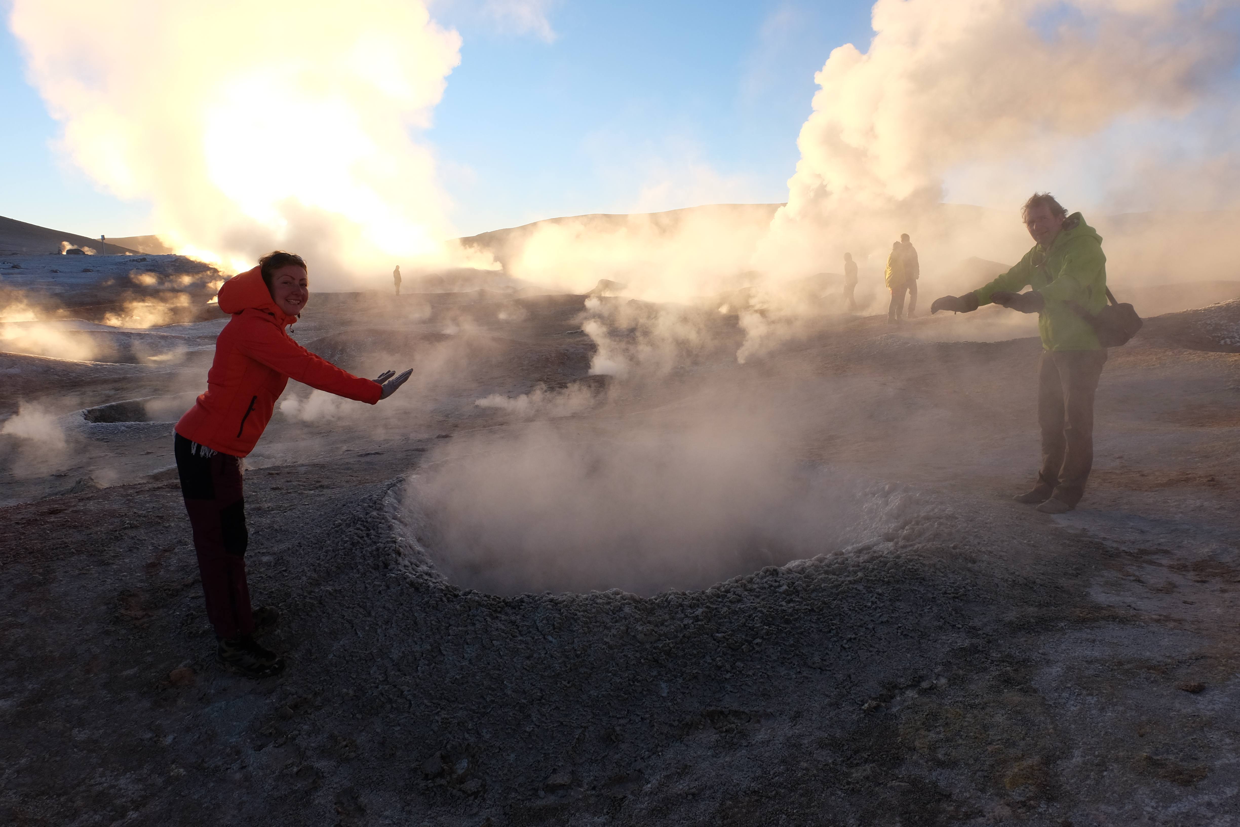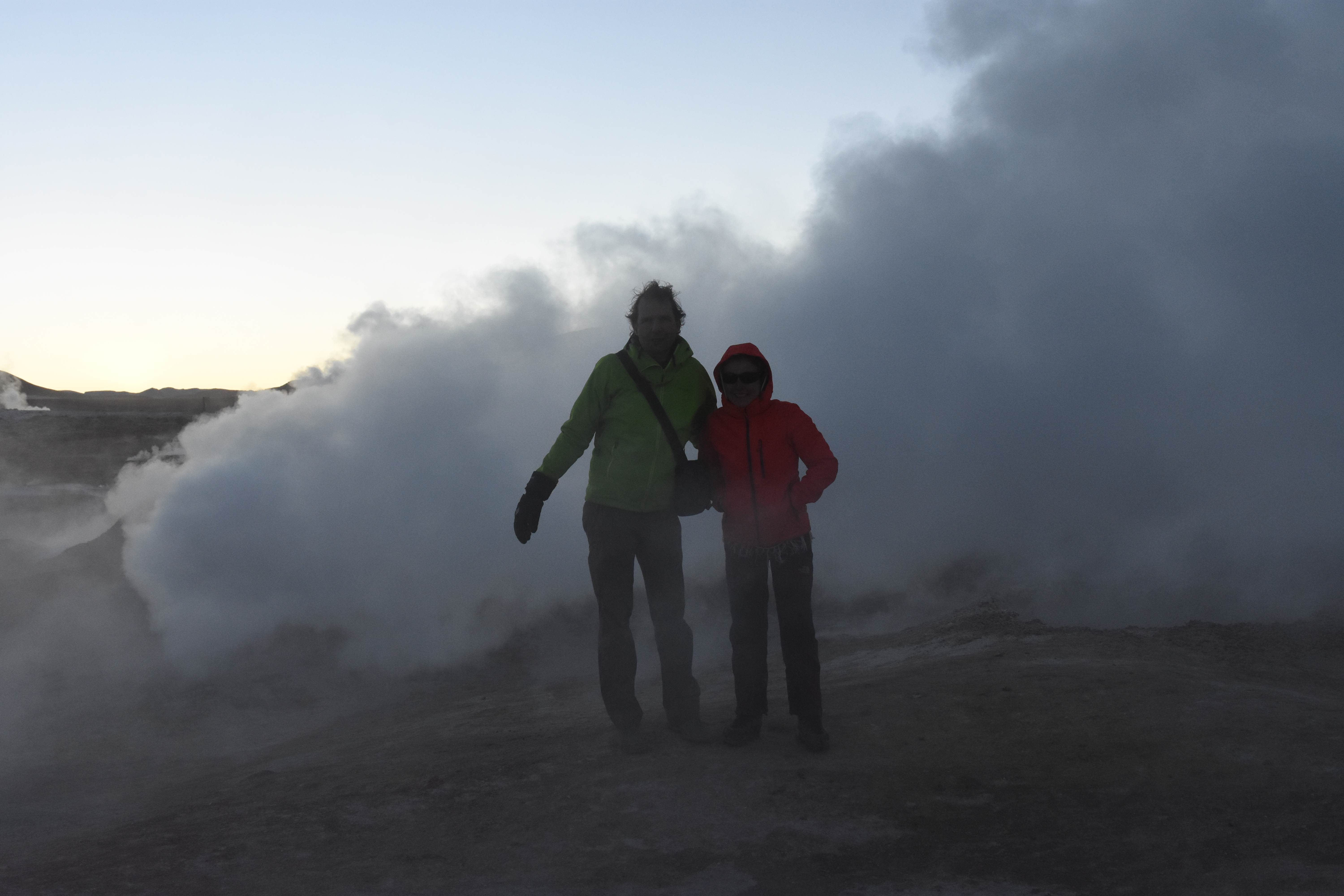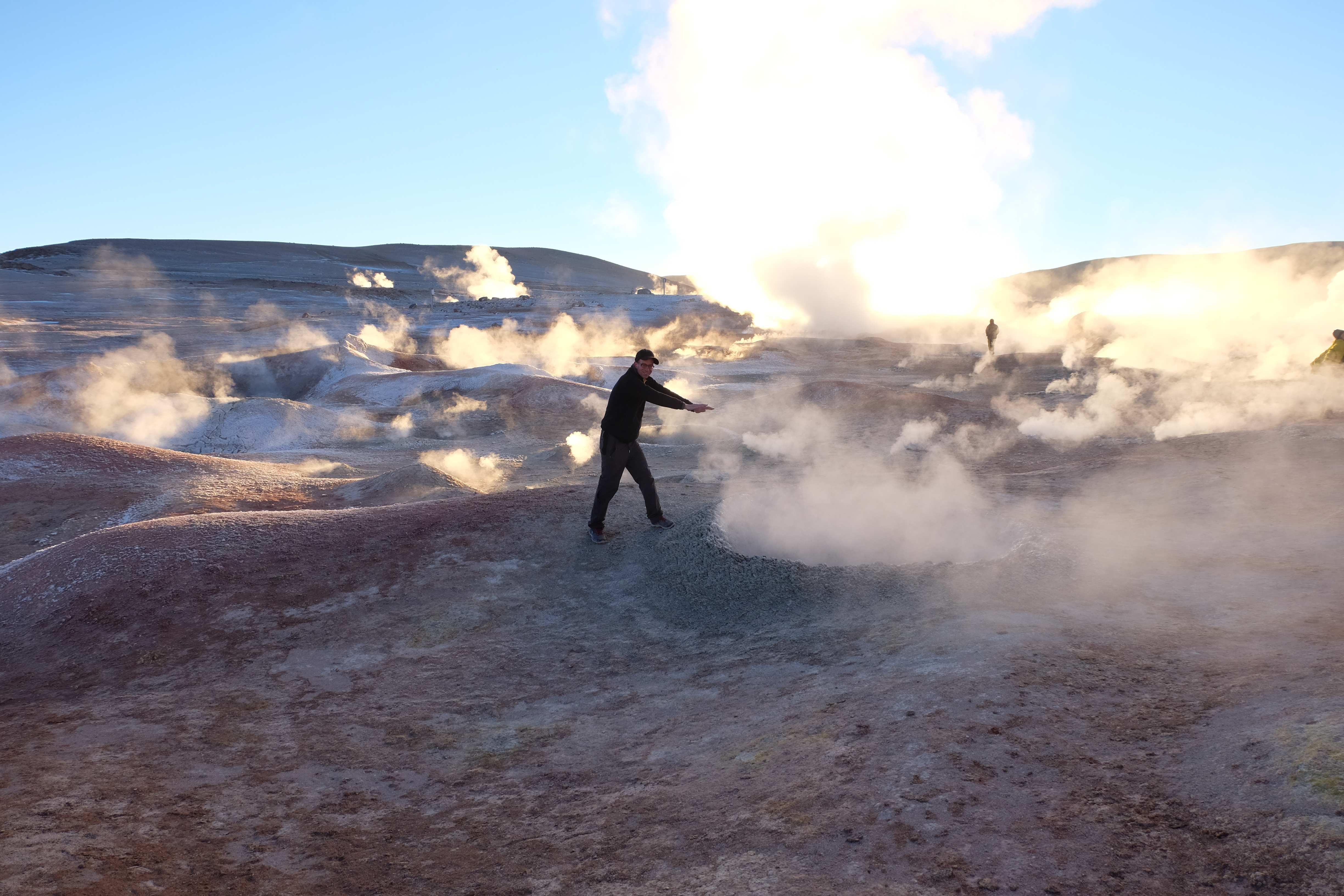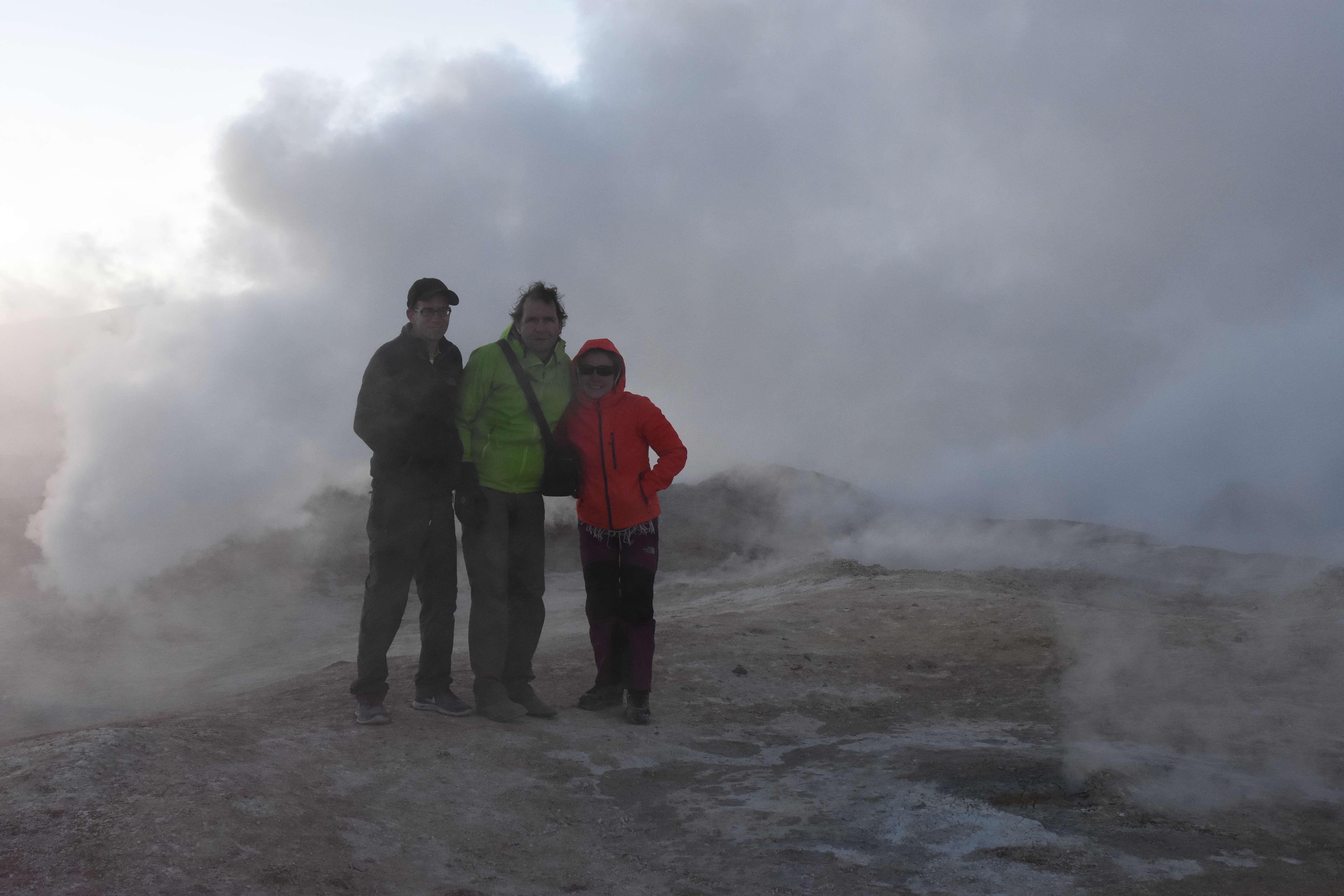 Gerne trotzten wir hiesiger Bedingungen, den prekär eingerichteten Zimmern und den eisigen Temperaturen. Wir waren ja gespannt, wie das Märchen zu Ende gehen würde: was käme denn noch? Ein Tag war noch übrig, wie würde er es schaffen, die vergangenen zu toppen? Schaut euch aber diese Bilder an, schaut euch diesen Guten-Morgen-Weckruf von der Sonne mitten in dieser surrealen und ausserirdischen Geysir-Landschaft. Es war, als hätte die Erde selber sich geöffnet und schreien wollen, dass sie auch eine Künstlerin sei. Jahrtausende alte Liebesbriefe, welche sich die Erde nie zu verschicken traute, entkamen nun und begaben sich in Dampfform Richtung Himmel. Es war vollbracht, der Himmel wusste nun von seiner ewigen heimlichen Verehrerin, die Erde… sein Herz schmilz vor Freude und er begann mit den Sonnenstrahlen die Erde mit Küssen zu überhäufen. Eine ewige Liebesgeschichte mit glücklichem Ende… und wir als privilegierte Zeugen.