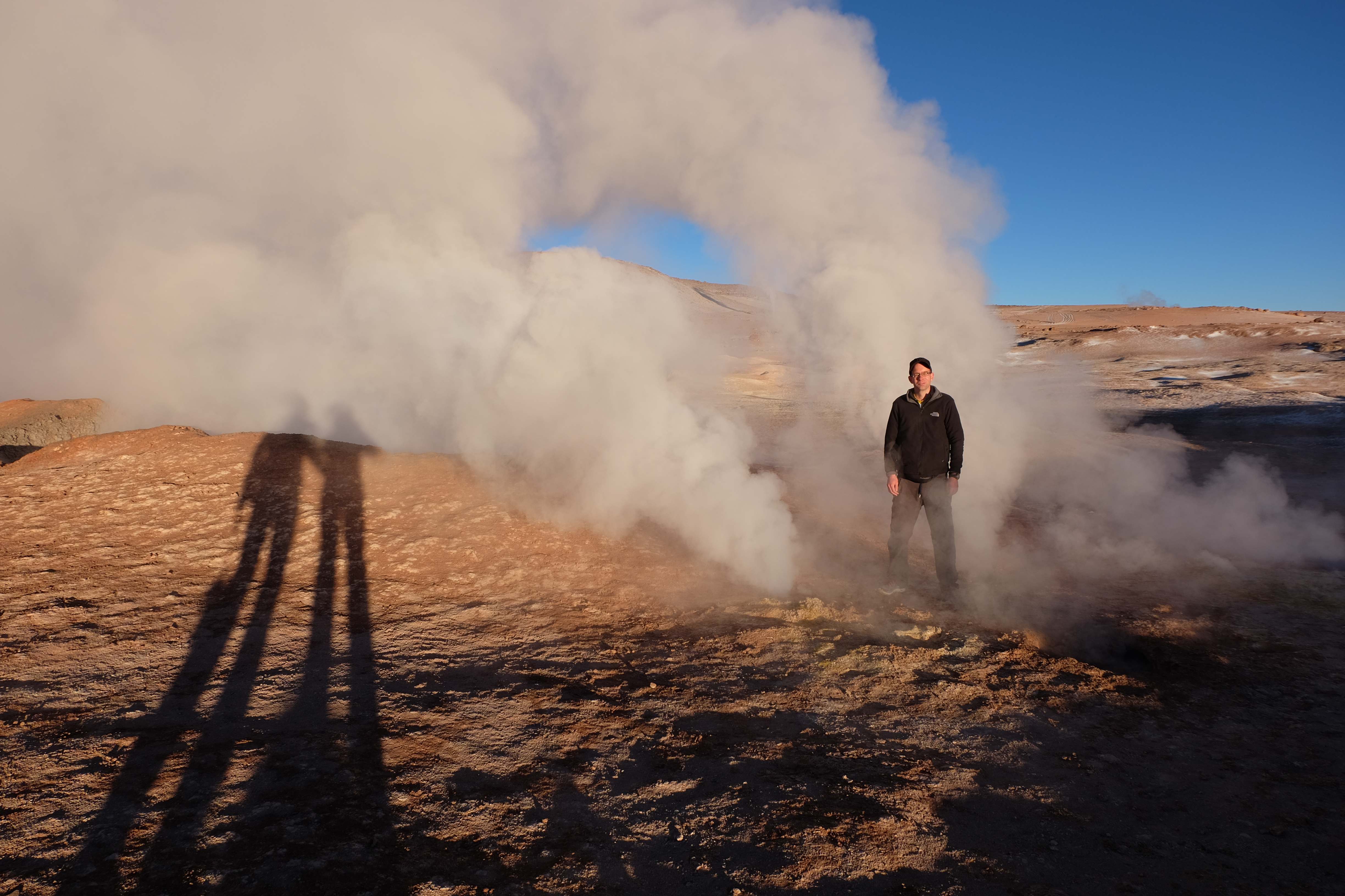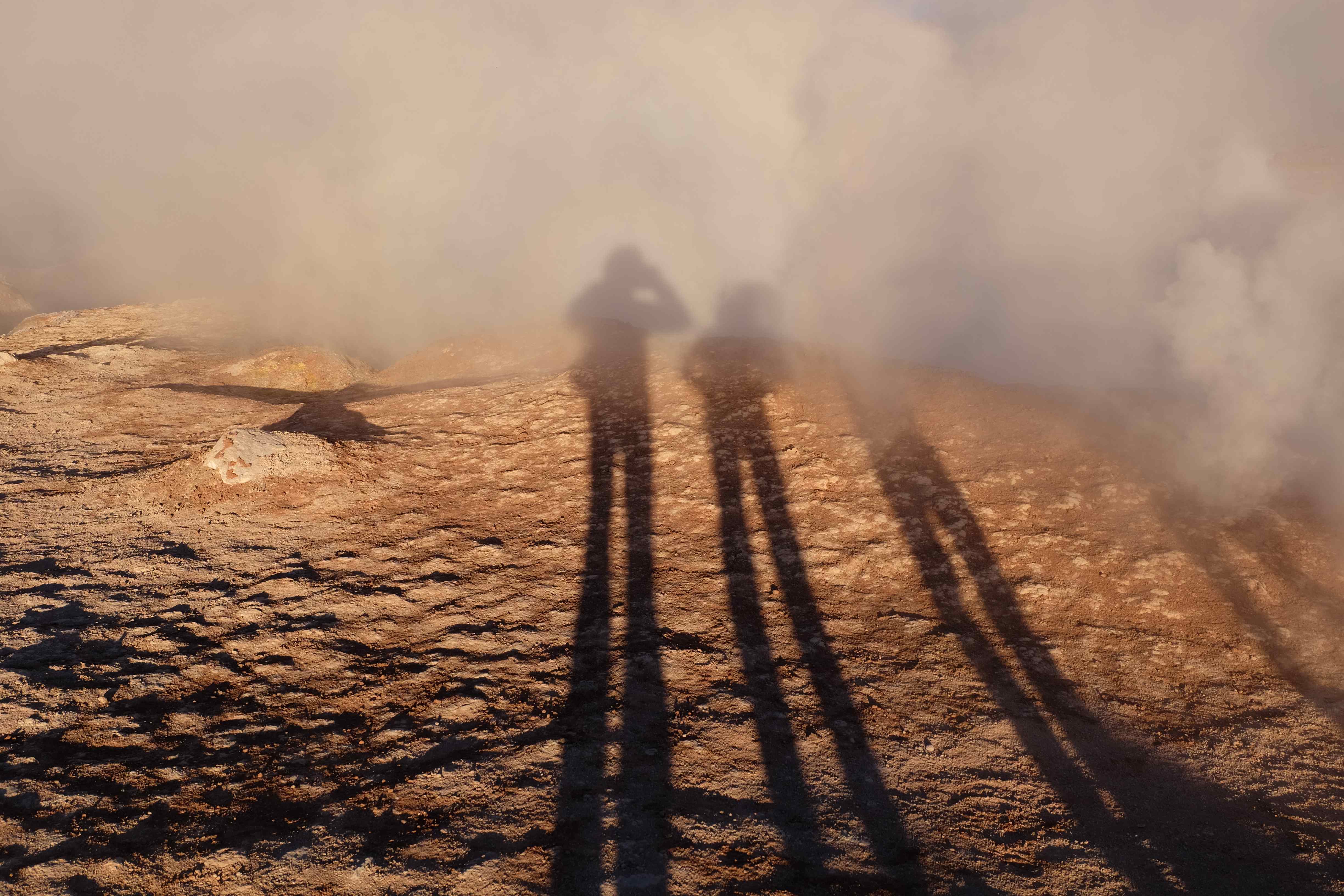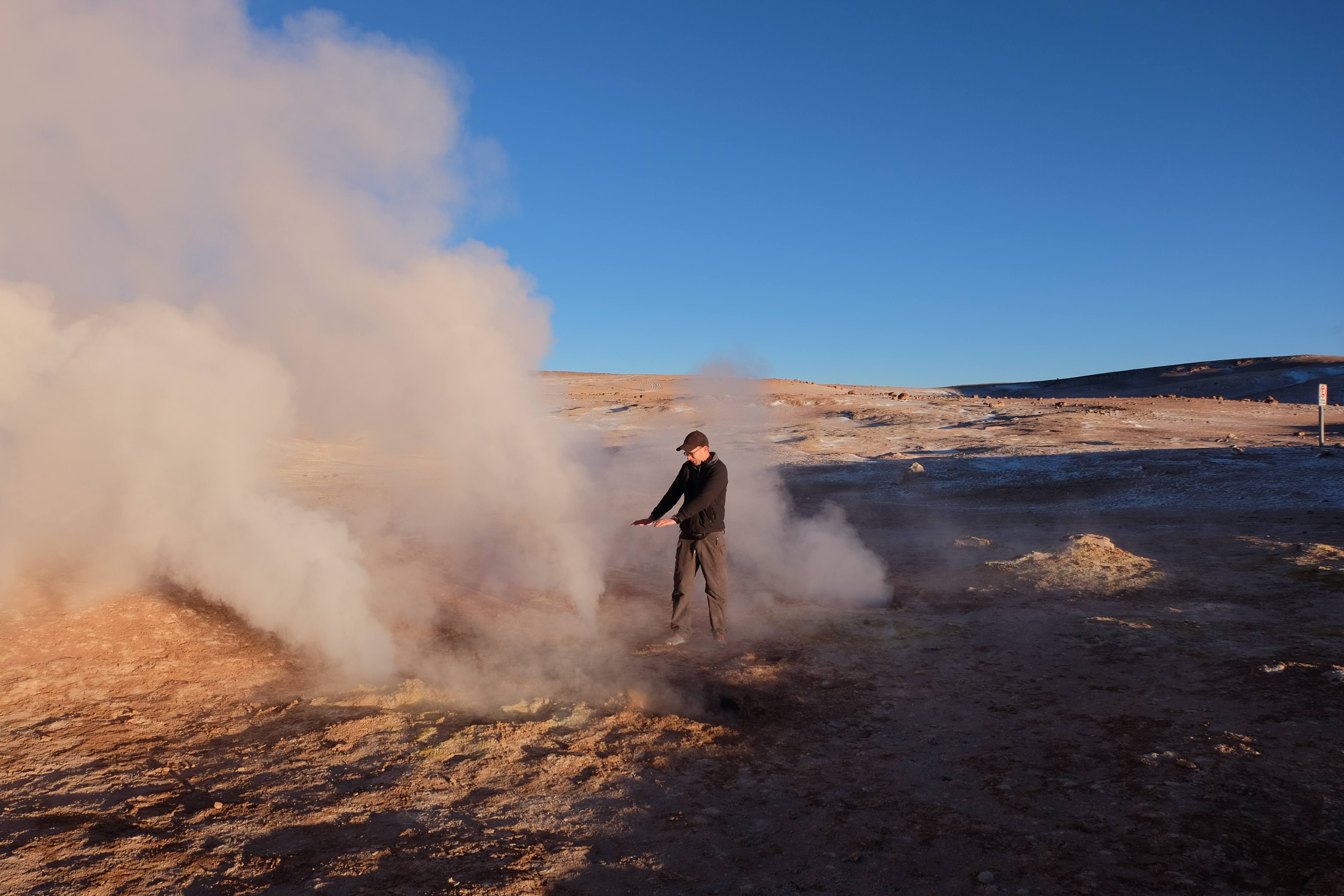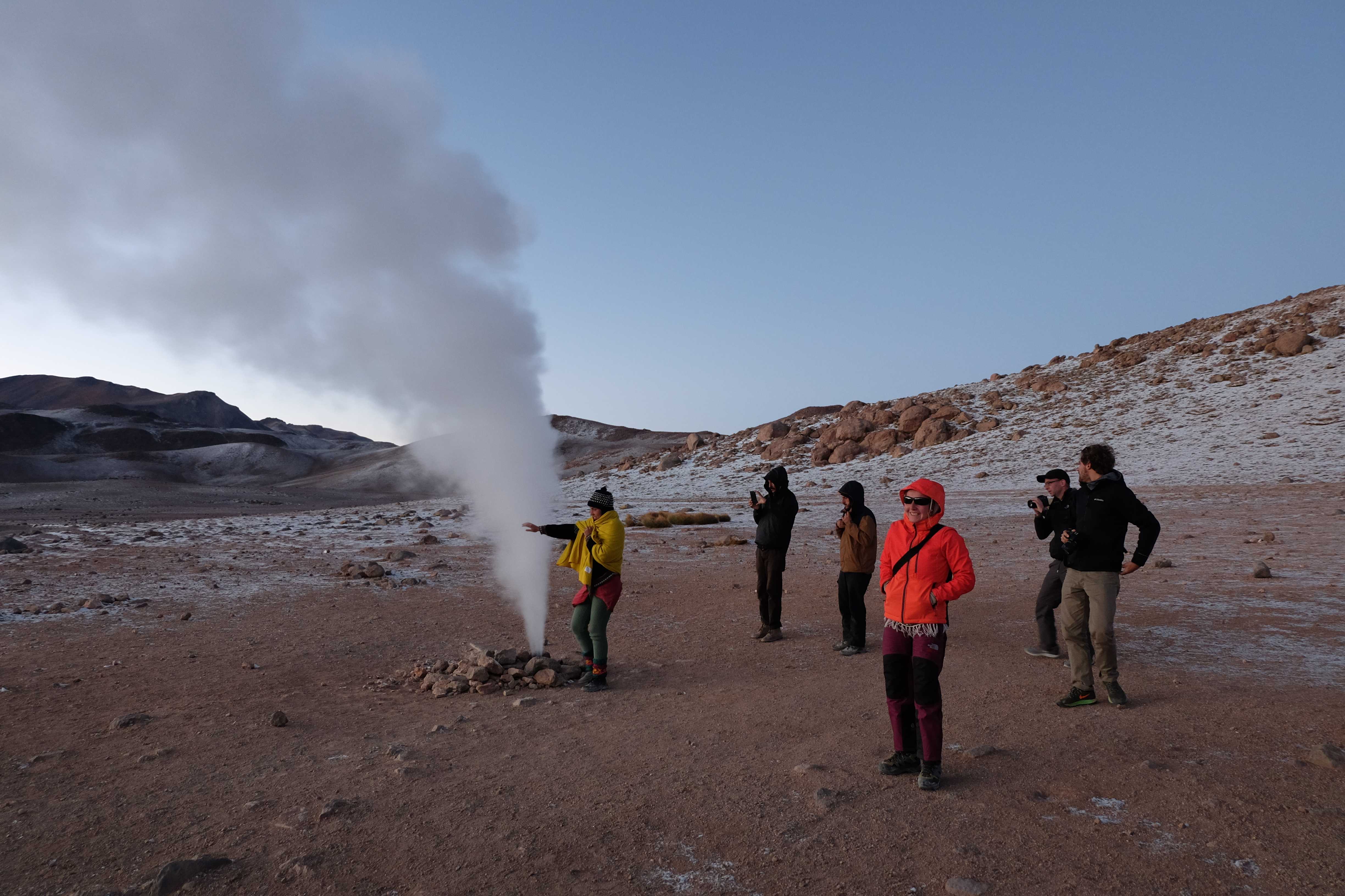 Gerne trotzten wir hiesiger Bedingungen, den prekär eingerichteten Zimmern und den eisigen Temperaturen. Wir waren ja gespannt, wie das Märchen zu Ende gehen würde: was käme denn noch? Ein Tag war noch übrig, wie würde er es schaffen, die vergangenen zu toppen? Schaut euch aber diese Bilder an, schaut euch diesen Guten-Morgen-Weckruf von der Sonne mitten in dieser surrealen und ausserirdischen Geysir-Landschaft. Es war, als hätte die Erde selber sich geöffnet und schreien wollen, dass sie auch eine Künstlerin sei. Jahrtausende alte Liebesbriefe, welche sich die Erde nie zu verschicken traute, entkamen nun und begaben sich in Dampfform Richtung Himmel. Es war vollbracht, der Himmel wusste nun von seiner ewigen heimlichen Verehrerin, die Erde… sein Herz schmilz vor Freude und er begann mit den Sonnenstrahlen die Erde mit Küssen zu überhäufen. Eine ewige Liebesgeschichte mit glücklichem Ende… und wir als privilegierte Zeugen.