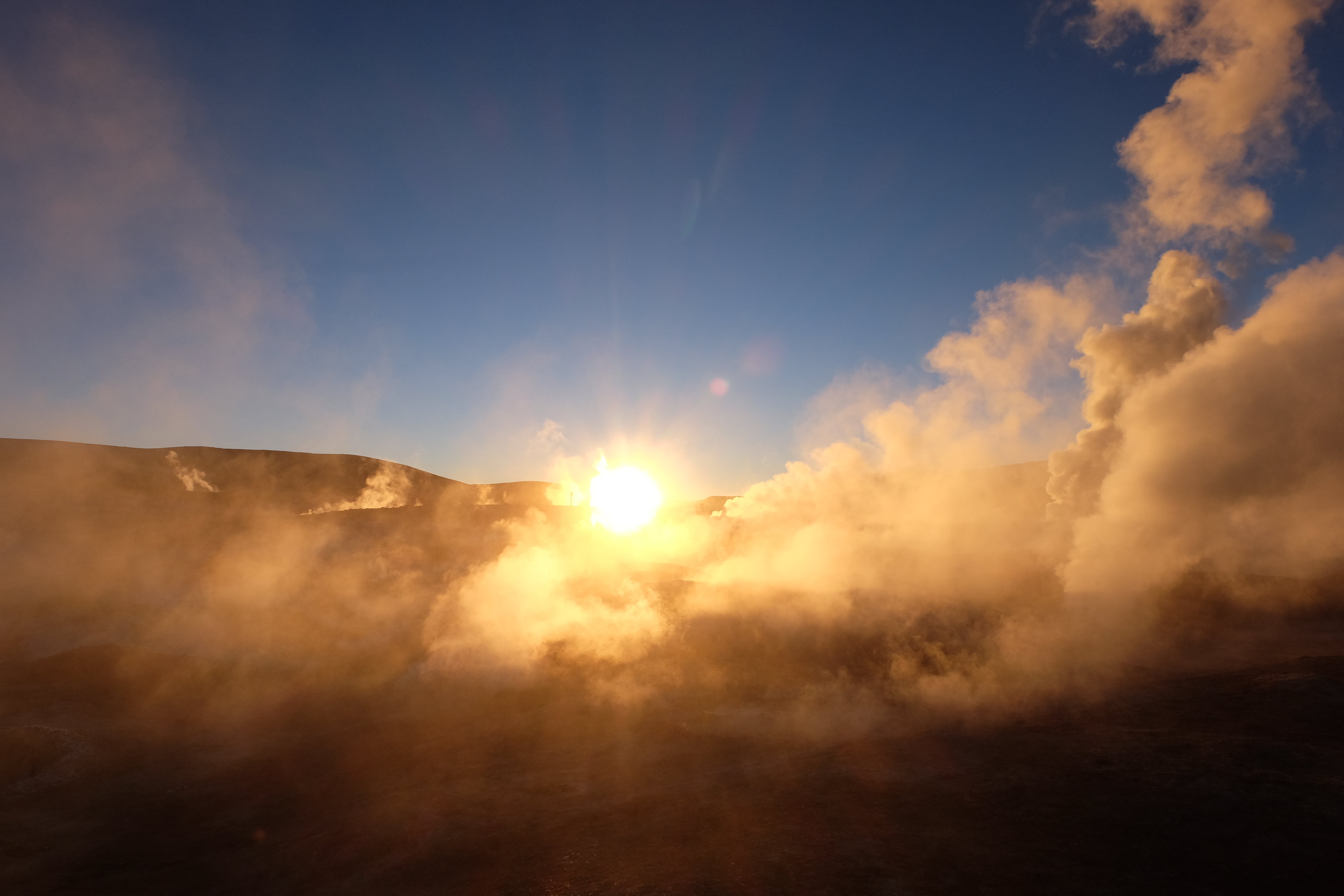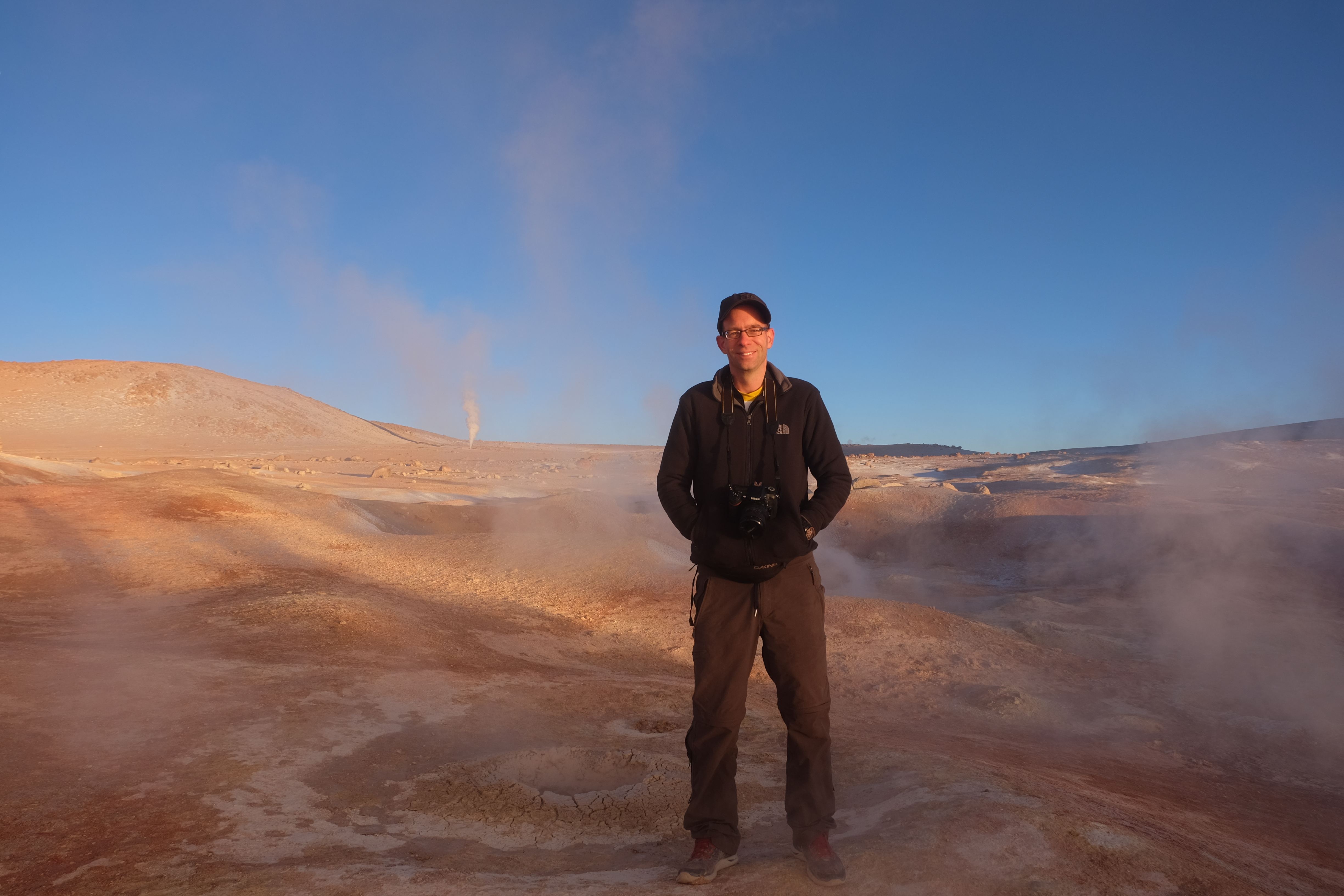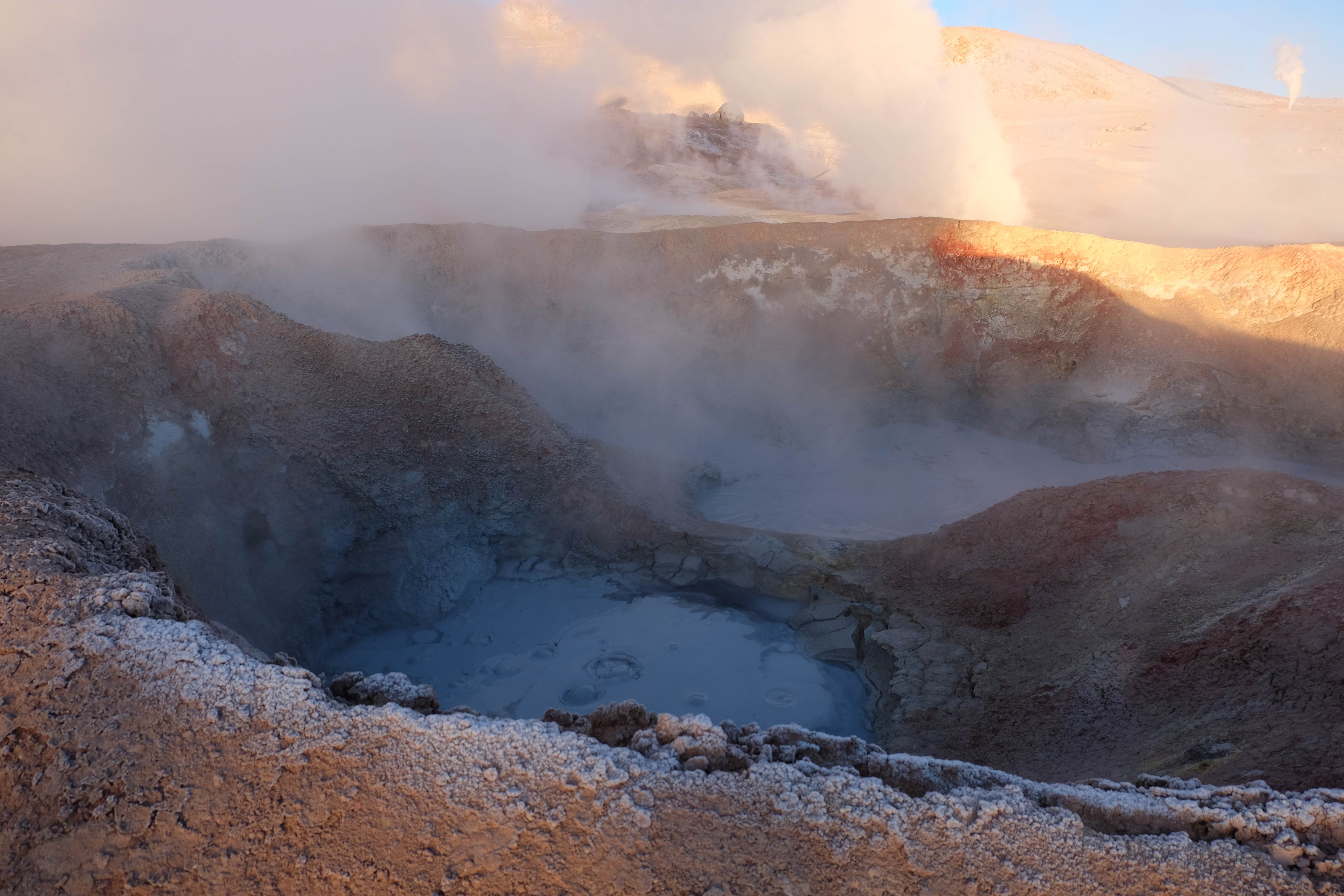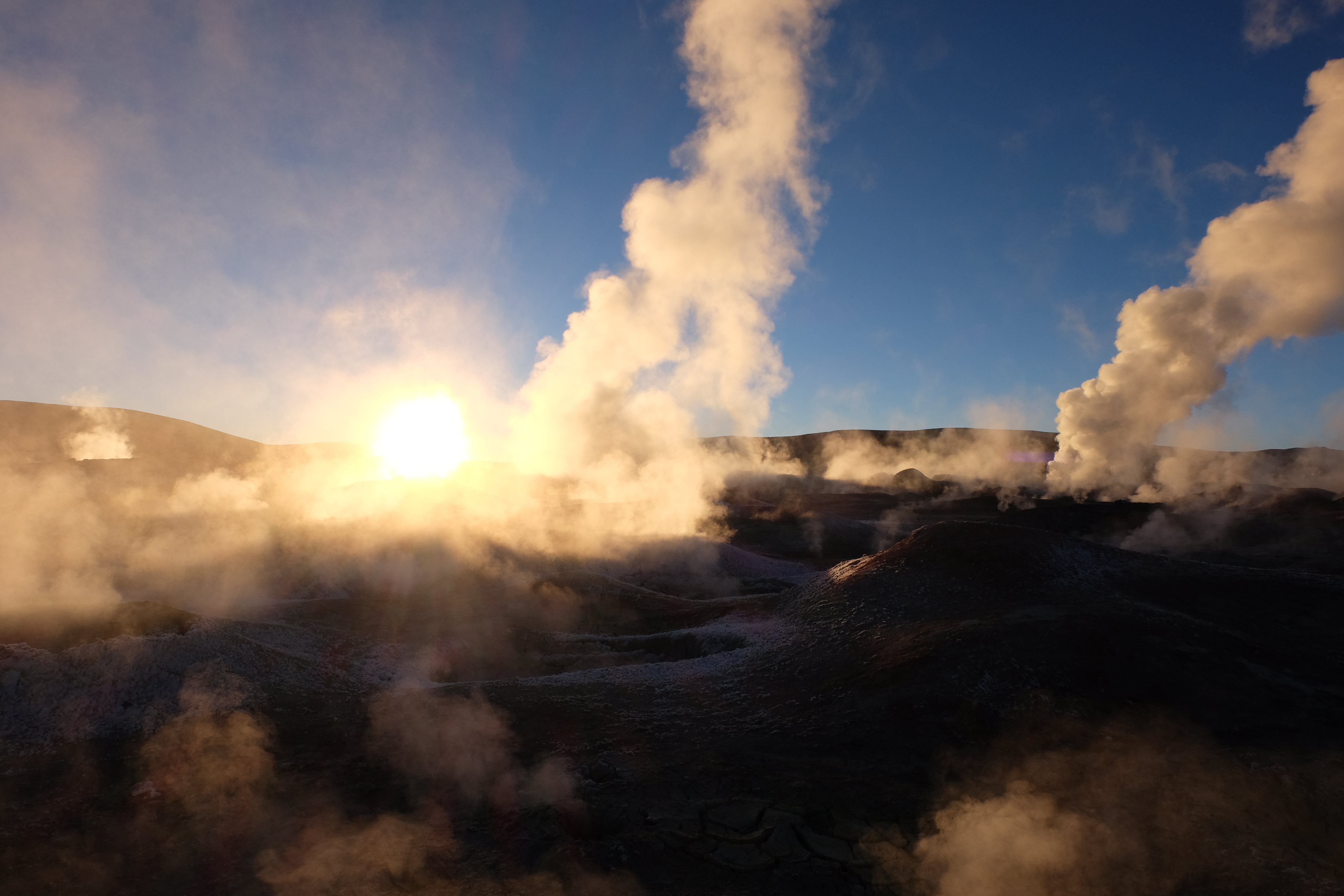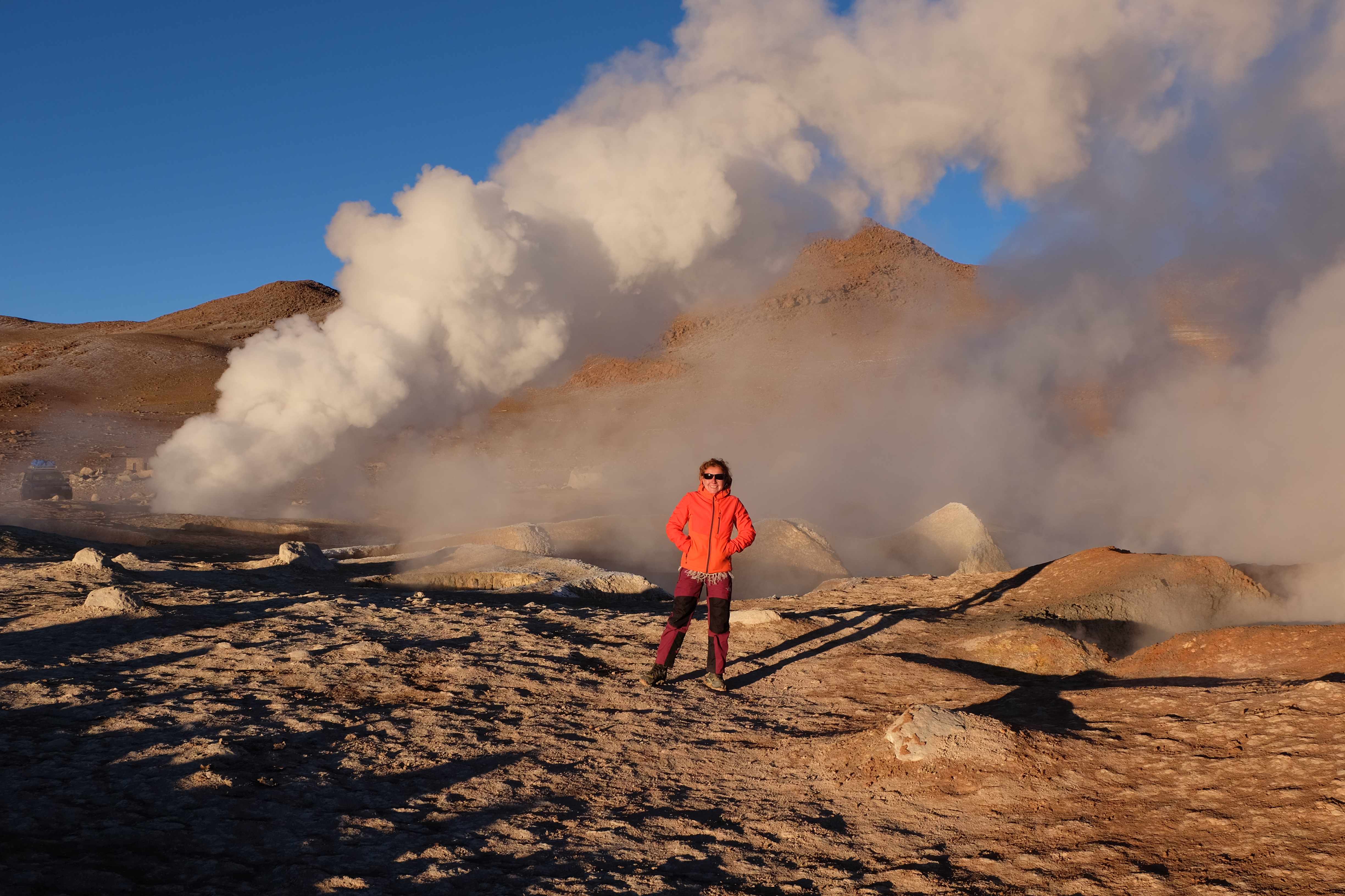 Gerne trotzten wir hiesiger Bedingungen, den prekär eingerichteten Zimmern und den eisigen Temperaturen. Wir waren ja gespannt, wie das Märchen zu Ende gehen würde: was käme denn noch? Ein Tag war noch übrig, wie würde er es schaffen, die vergangenen zu toppen? Schaut euch aber diese Bilder an, schaut euch diesen Guten-Morgen-Weckruf von der Sonne mitten in dieser surrealen und ausserirdischen Geysir-Landschaft. Es war, als hätte die Erde selber sich geöffnet und schreien wollen, dass sie auch eine Künstlerin sei. Jahrtausende alte Liebesbriefe, welche sich die Erde nie zu verschicken traute, entkamen nun und begaben sich in Dampfform Richtung Himmel. Es war vollbracht, der Himmel wusste nun von seiner ewigen heimlichen Verehrerin, die Erde… sein Herz schmilz vor Freude und er begann mit den Sonnenstrahlen die Erde mit Küssen zu überhäufen. Eine ewige Liebesgeschichte mit glücklichem Ende… und wir als privilegierte Zeugen.