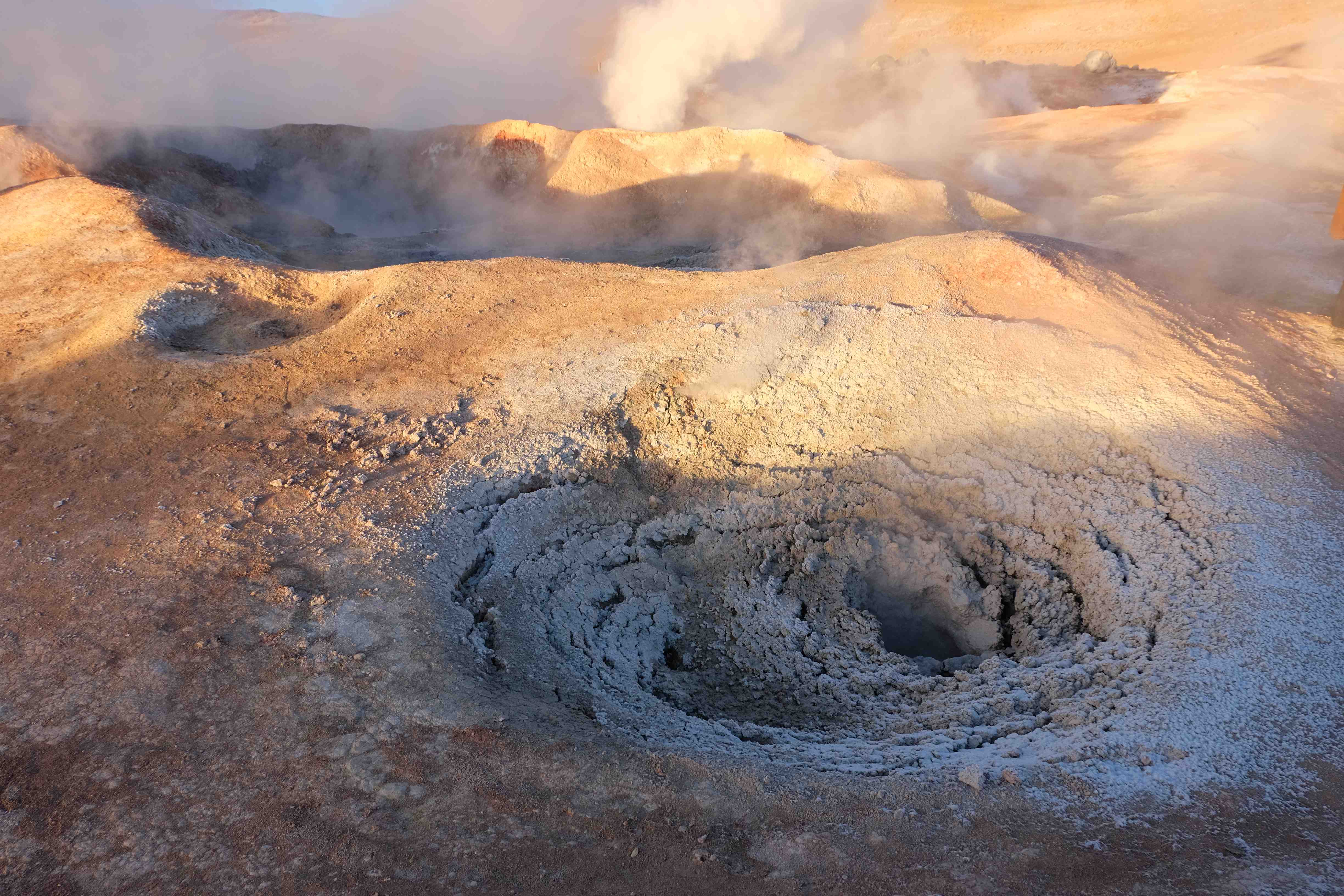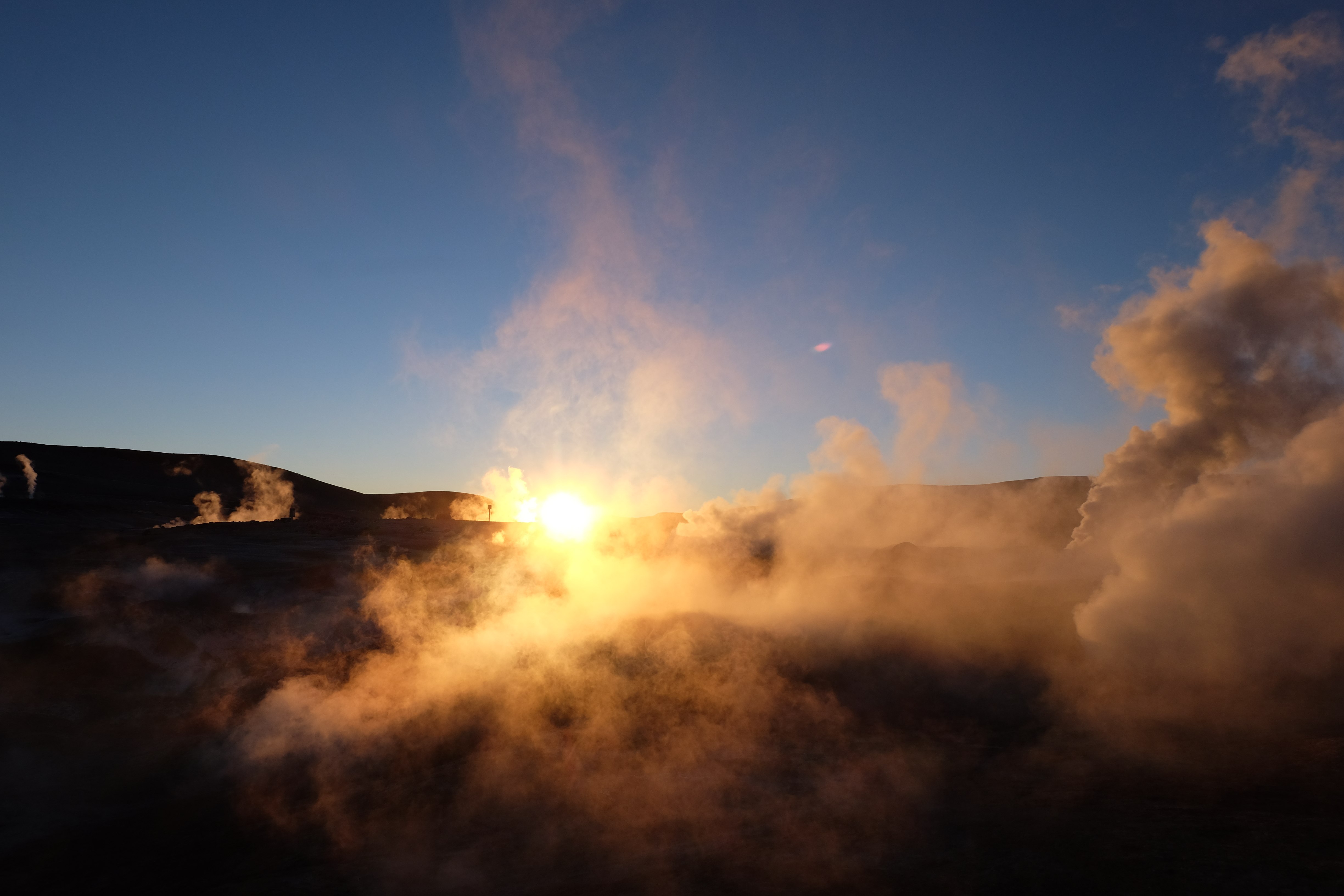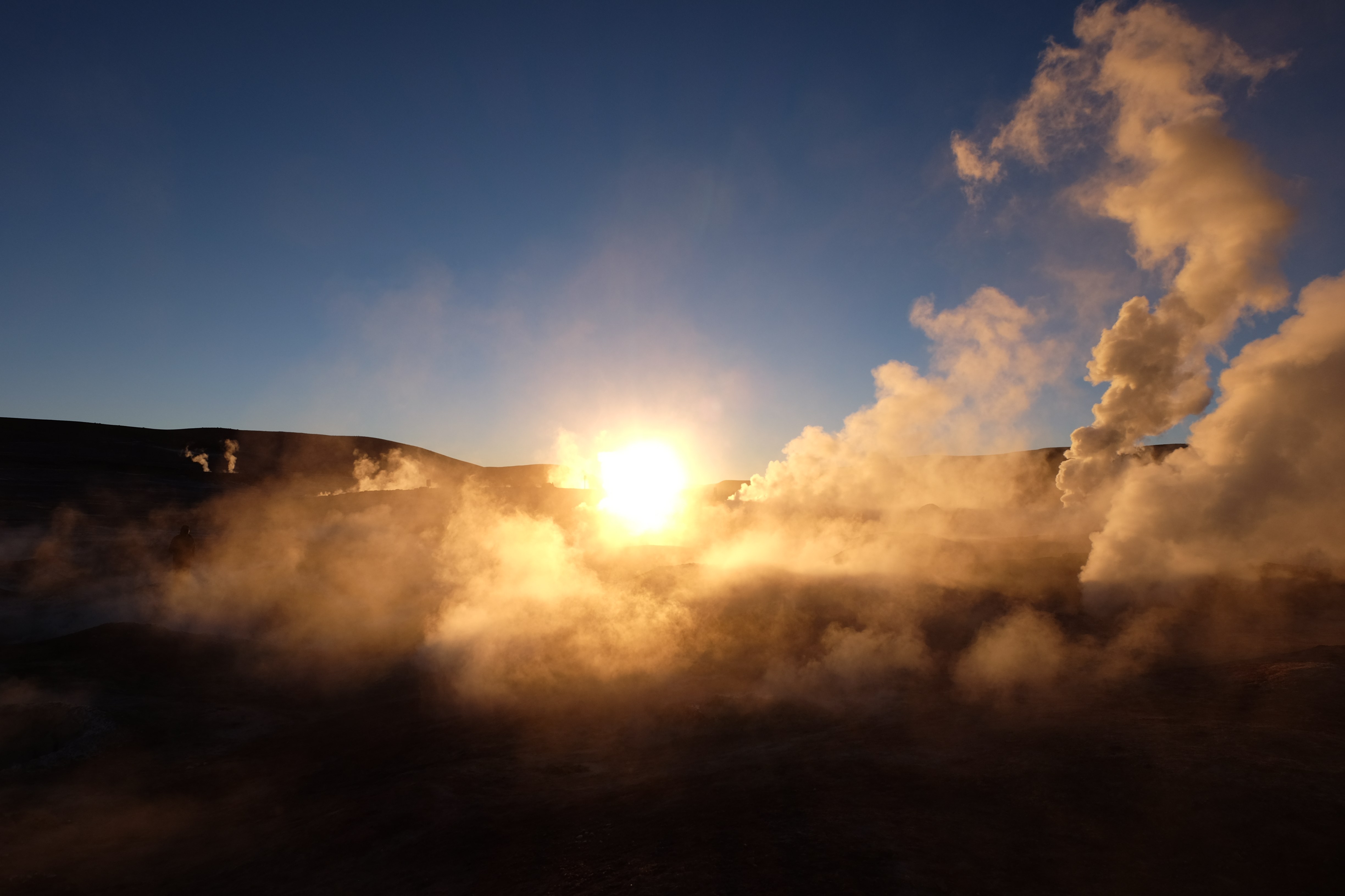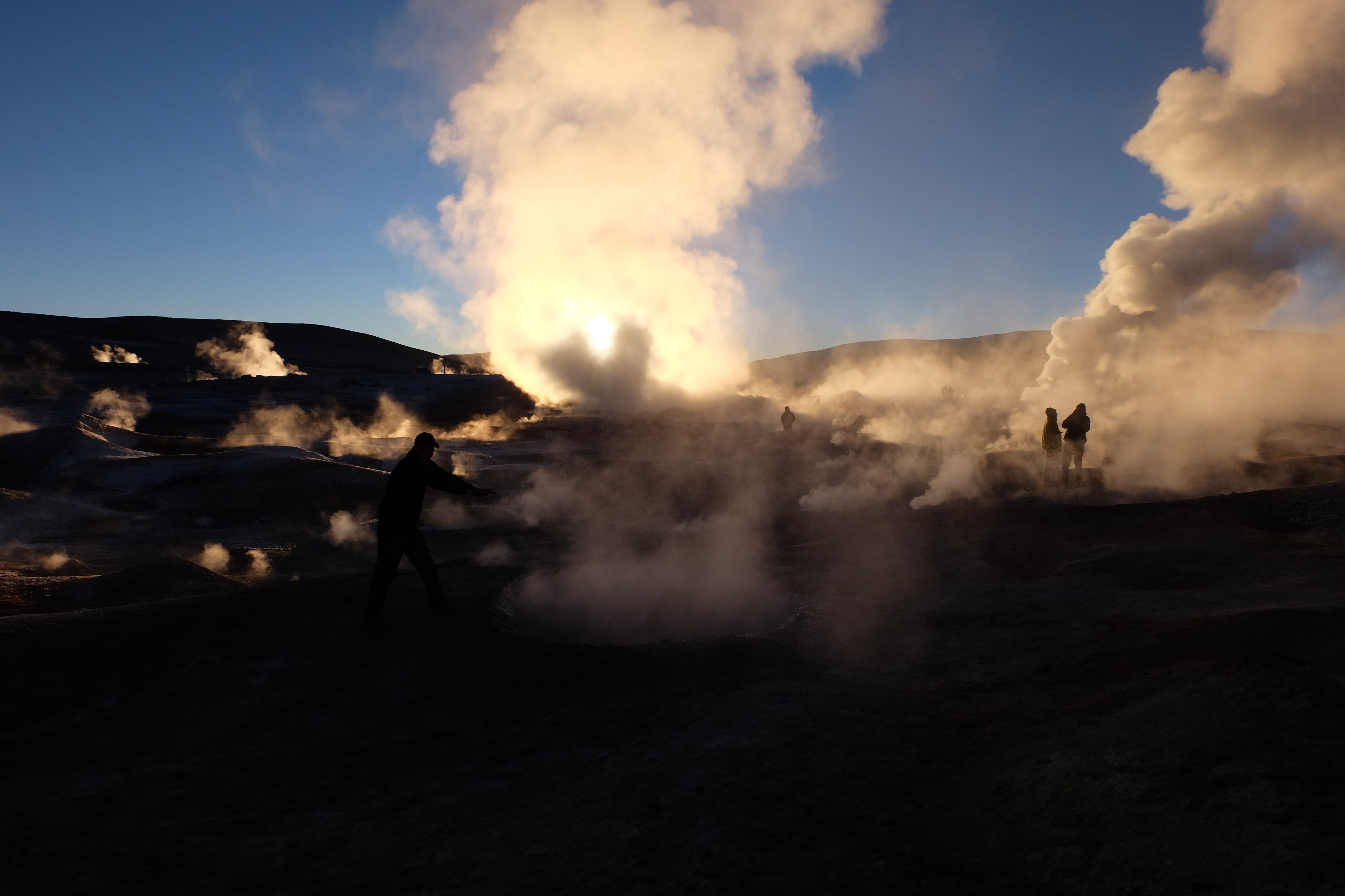 Gerne trotzten wir hiesiger Bedingungen, den prekär eingerichteten Zimmern und den eisigen Temperaturen. Wir waren ja gespannt, wie das Märchen zu Ende gehen würde: was käme denn noch? Ein Tag war noch übrig, wie würde er es schaffen, die vergangenen zu toppen? Schaut euch aber diese Bilder an, schaut euch diesen Guten-Morgen-Weckruf von der Sonne mitten in dieser surrealen und ausserirdischen Geysir-Landschaft. Es war, als hätte die Erde selber sich geöffnet und schreien wollen, dass sie auch eine Künstlerin sei. Jahrtausende alte Liebesbriefe, welche sich die Erde nie zu verschicken traute, entkamen nun und begaben sich in Dampfform Richtung Himmel. Es war vollbracht, der Himmel wusste nun von seiner ewigen heimlichen Verehrerin, die Erde… sein Herz schmilz vor Freude und er begann mit den Sonnenstrahlen die Erde mit Küssen zu überhäufen. Eine ewige Liebesgeschichte mit glücklichem Ende… und wir als privilegierte Zeugen.