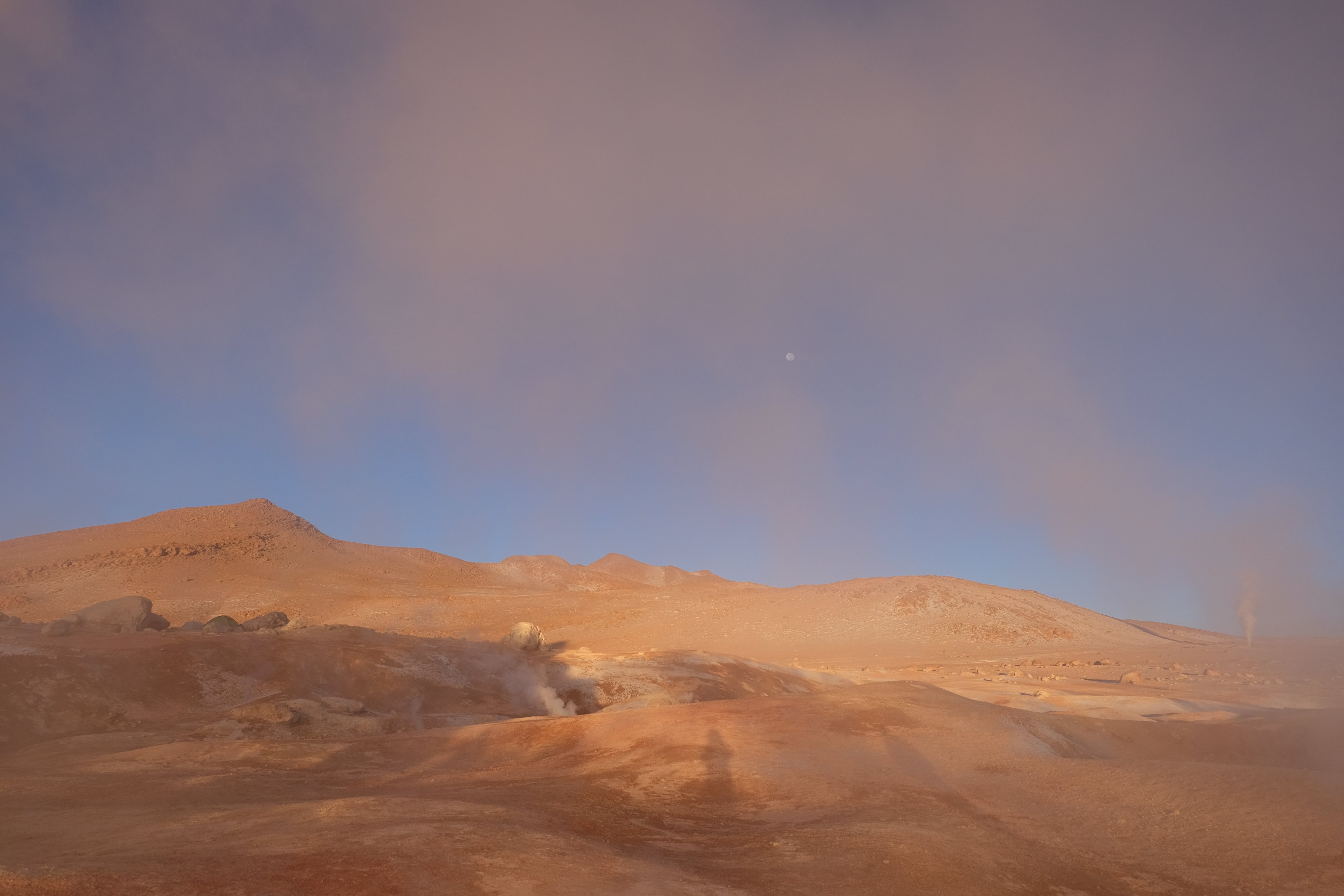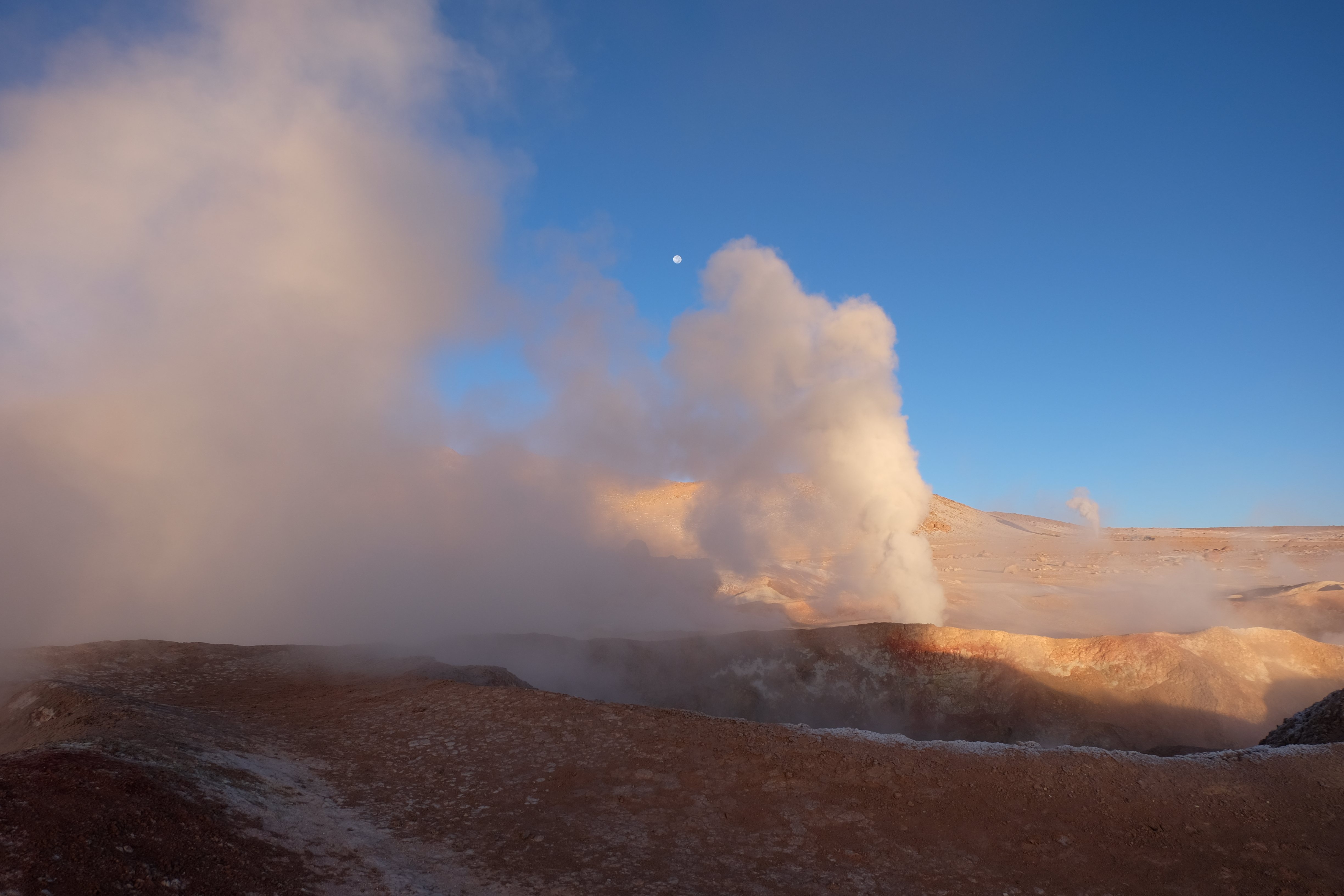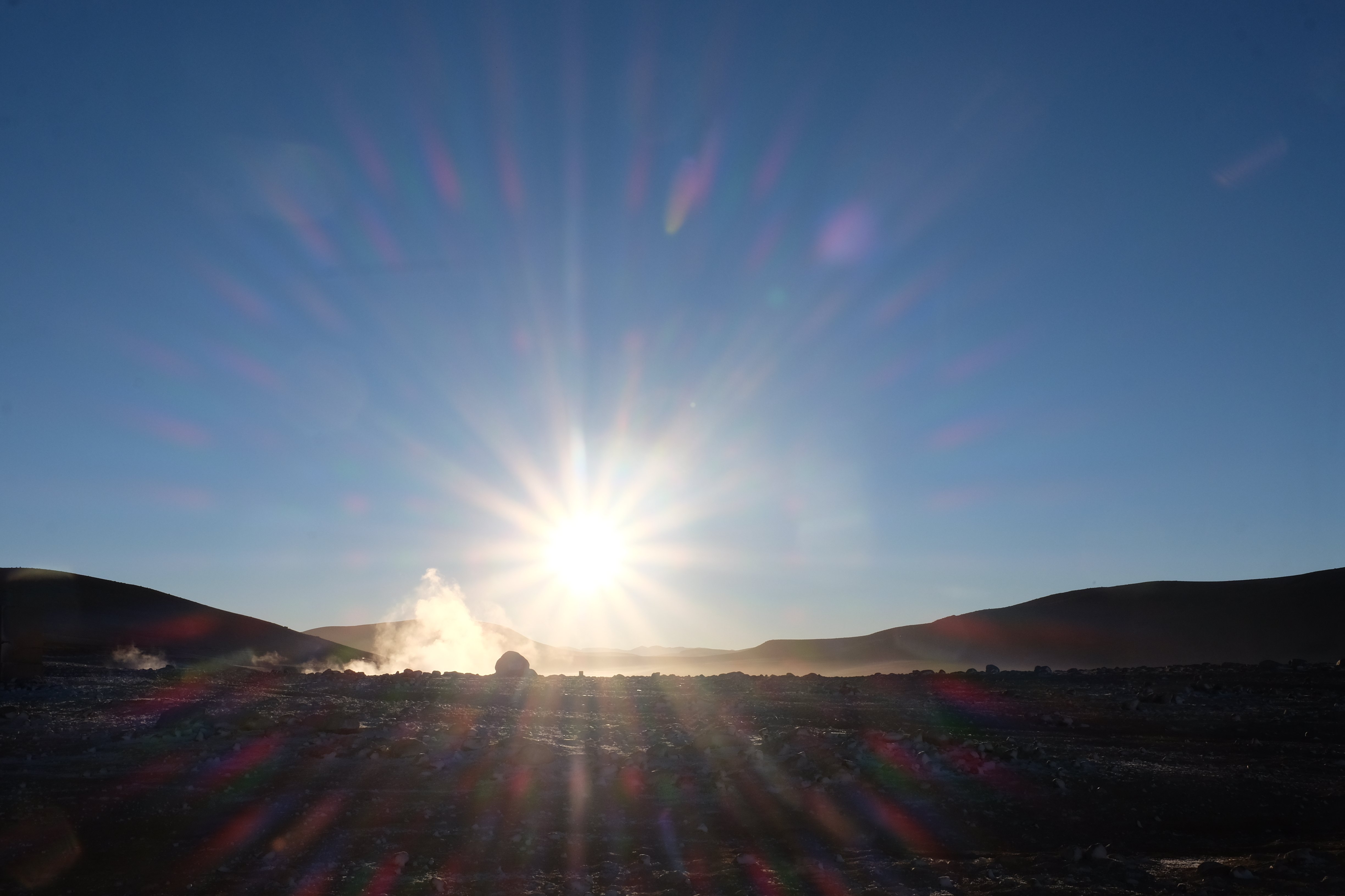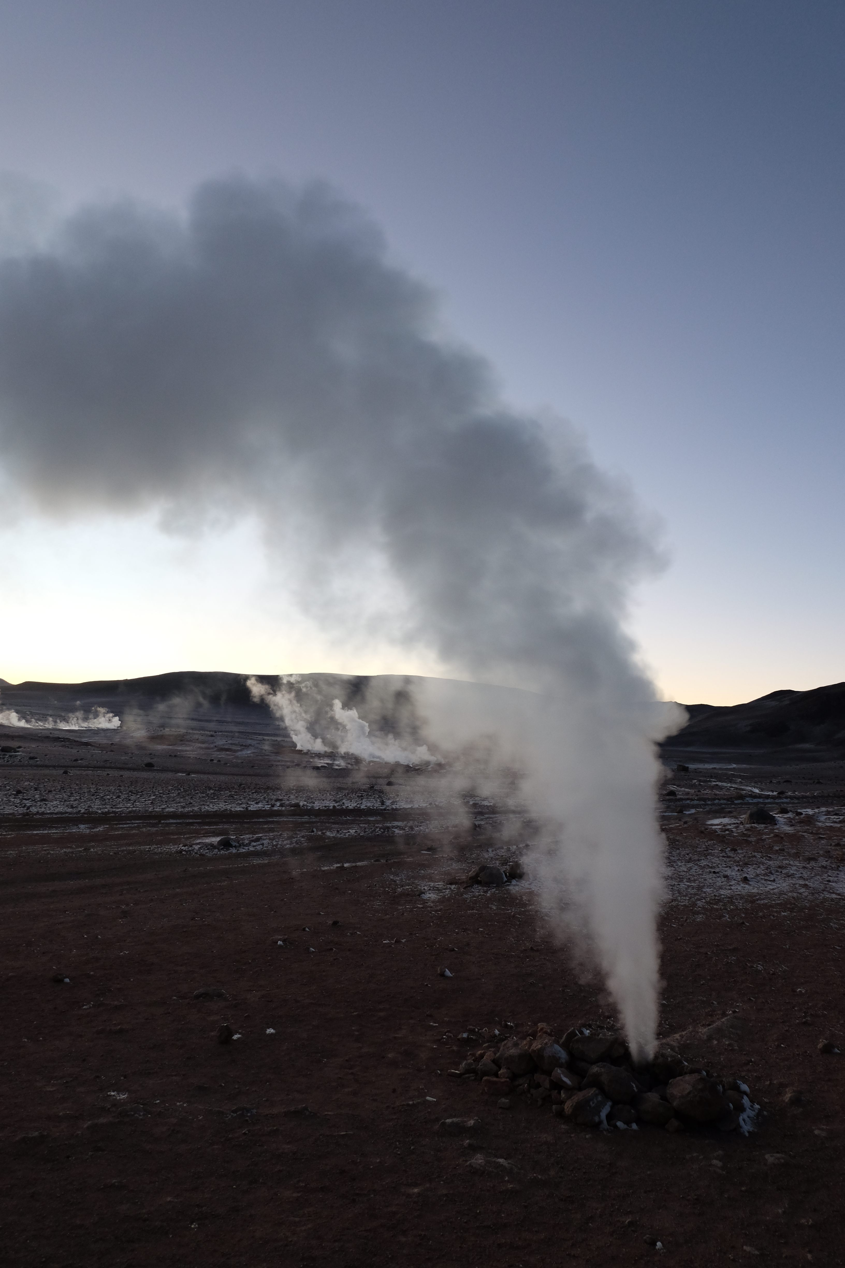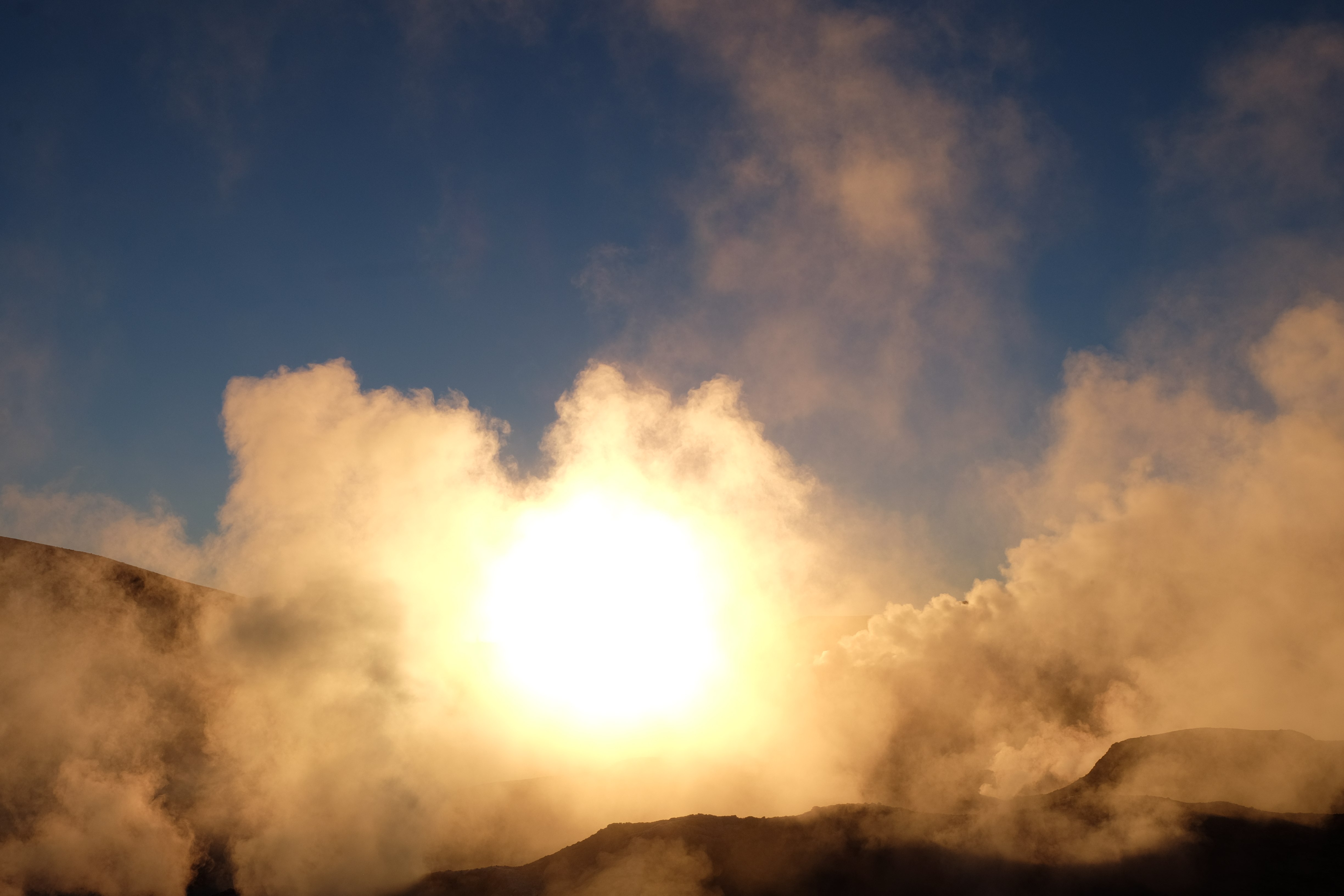 Gerne trotzten wir hiesiger Bedingungen, den prekär eingerichteten Zimmern und den eisigen Temperaturen. Wir waren ja gespannt, wie das Märchen zu Ende gehen würde: was käme denn noch? Ein Tag war noch übrig, wie würde er es schaffen, die vergangenen zu toppen? Schaut euch aber diese Bilder an, schaut euch diesen Guten-Morgen-Weckruf von der Sonne mitten in dieser surrealen und ausserirdischen Geysir-Landschaft. Es war, als hätte die Erde selber sich geöffnet und schreien wollen, dass sie auch eine Künstlerin sei. Jahrtausende alte Liebesbriefe, welche sich die Erde nie zu verschicken traute, entkamen nun und begaben sich in Dampfform Richtung Himmel. Es war vollbracht, der Himmel wusste nun von seiner ewigen heimlichen Verehrerin, die Erde… sein Herz schmilz vor Freude und er begann mit den Sonnenstrahlen die Erde mit Küssen zu überhäufen. Eine ewige Liebesgeschichte mit glücklichem Ende… und wir als privilegierte Zeugen.