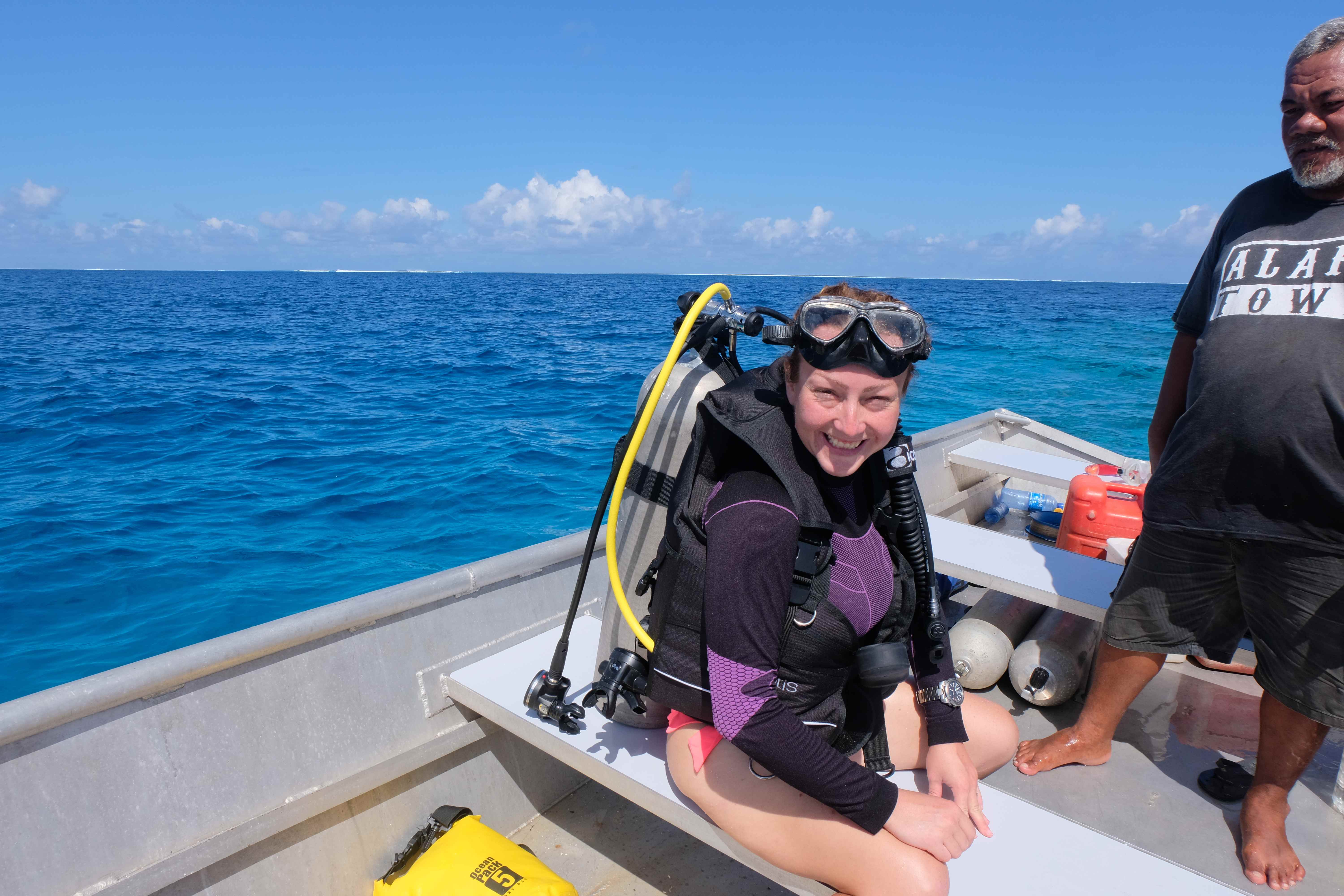 Dem Beispiel der Einheimischen folgend beabsichtigten wir ebenfalls das Meiste aus den zwei letzten Tagen herauszuholen, also ging es noch einmal aufs Boot – ab ins Wasser zum Tauchen und in eine Marine-Schule auf einer anderen Insel. Wenn man für den Besuch dieser eine telefonische Erlaubnis des Kapitäns höchstpersönlich einholen musste und wenn einem während des Besuches nicht nur tonnenweise frisches Kokosnusswasser angeboten, sondern auch die Fliegen vom diensthabenden Offizier persönlich mit einem Ast weggefächert wurden, dann wusste man, man befand sich in Tuvalu, in einer Welt, welche nicht unbedingt den Koordinaten der uns Bekannten entspricht. Spätestens wenn man nach dem letzten Tauchgang mit einem Menschen, der seinen Lebensunterhalt mehrere Jahre lang sicherte, indem er in unglaublichen Tiefen von über 150 m sein Leben riskierte um Seegurken einzusammeln, behaupten konnte, dass wenn Schneewittchen oder Dornröschen unter Wasser gelebt hätten, hier ihr magischer Wald gewesen wäre, wusste man ganz genau, dass man glücklich und privilegiert ist. Und wenn man – wie Rafi – noch vom einheimischen Bootsfahrer-Assistenten täglich danach mit einer persönlichen Lieferung von frischen Kokosnüssen beschenkt wurde, kann man noch laut dazu schreien: Das ist ja cool! 🙂