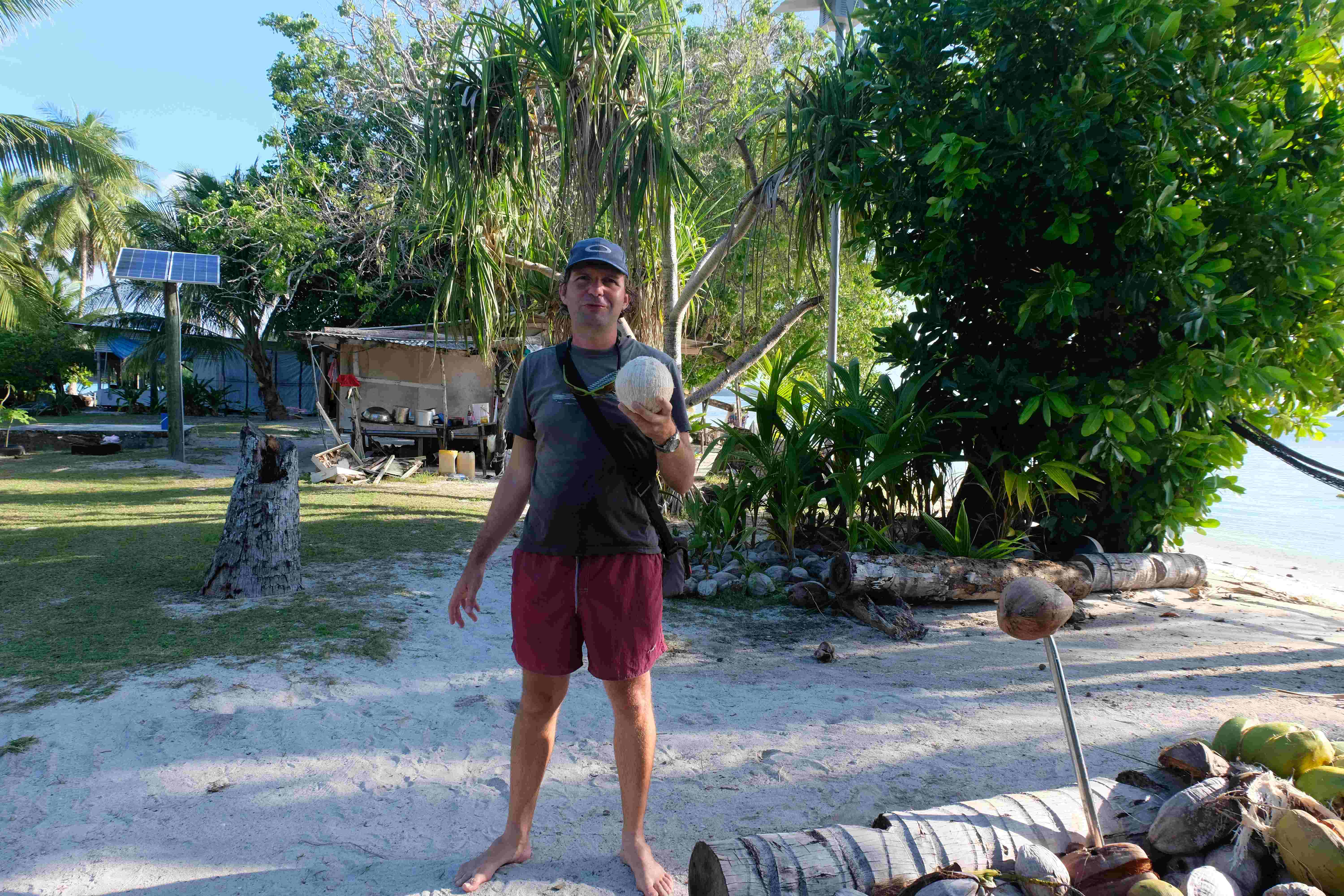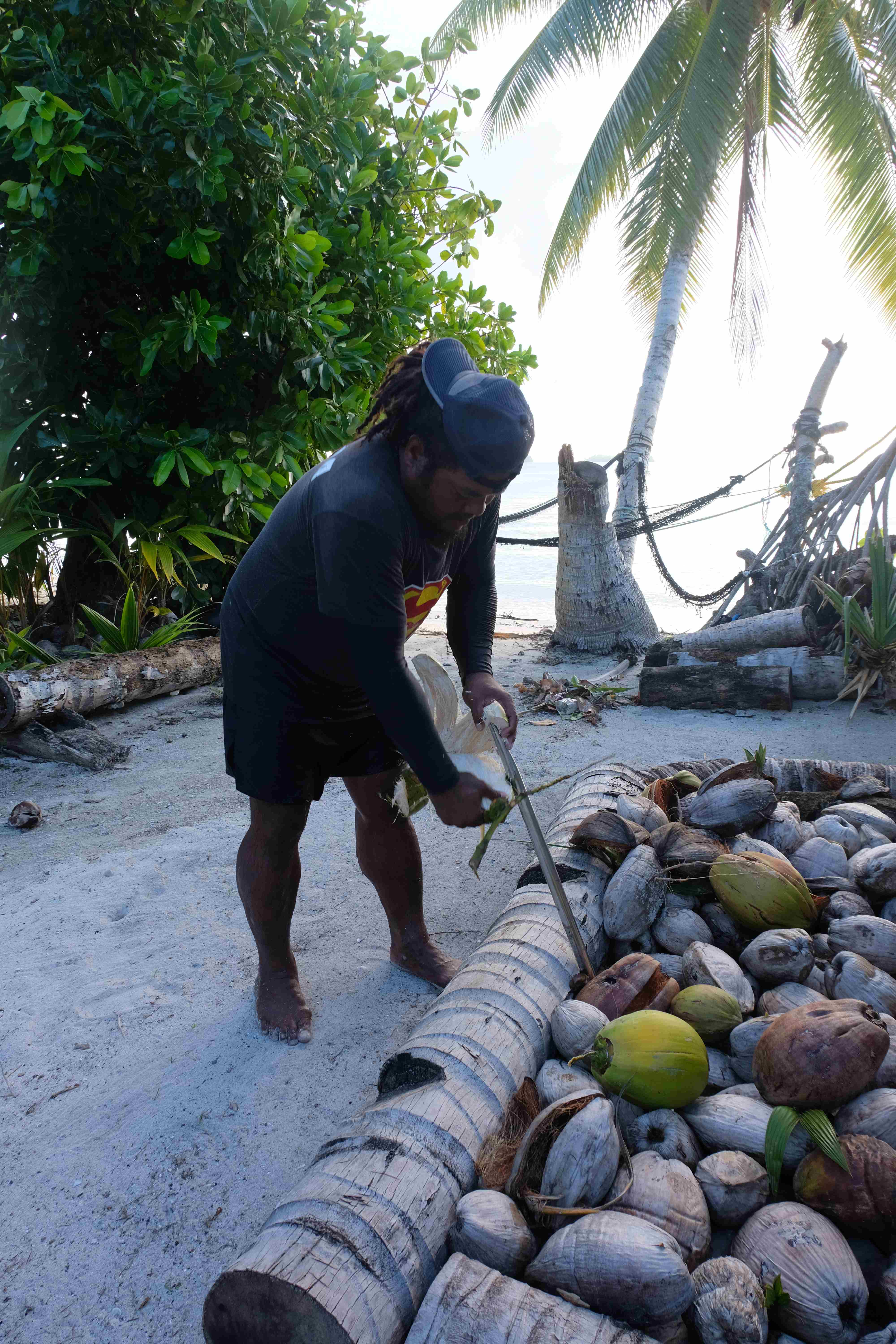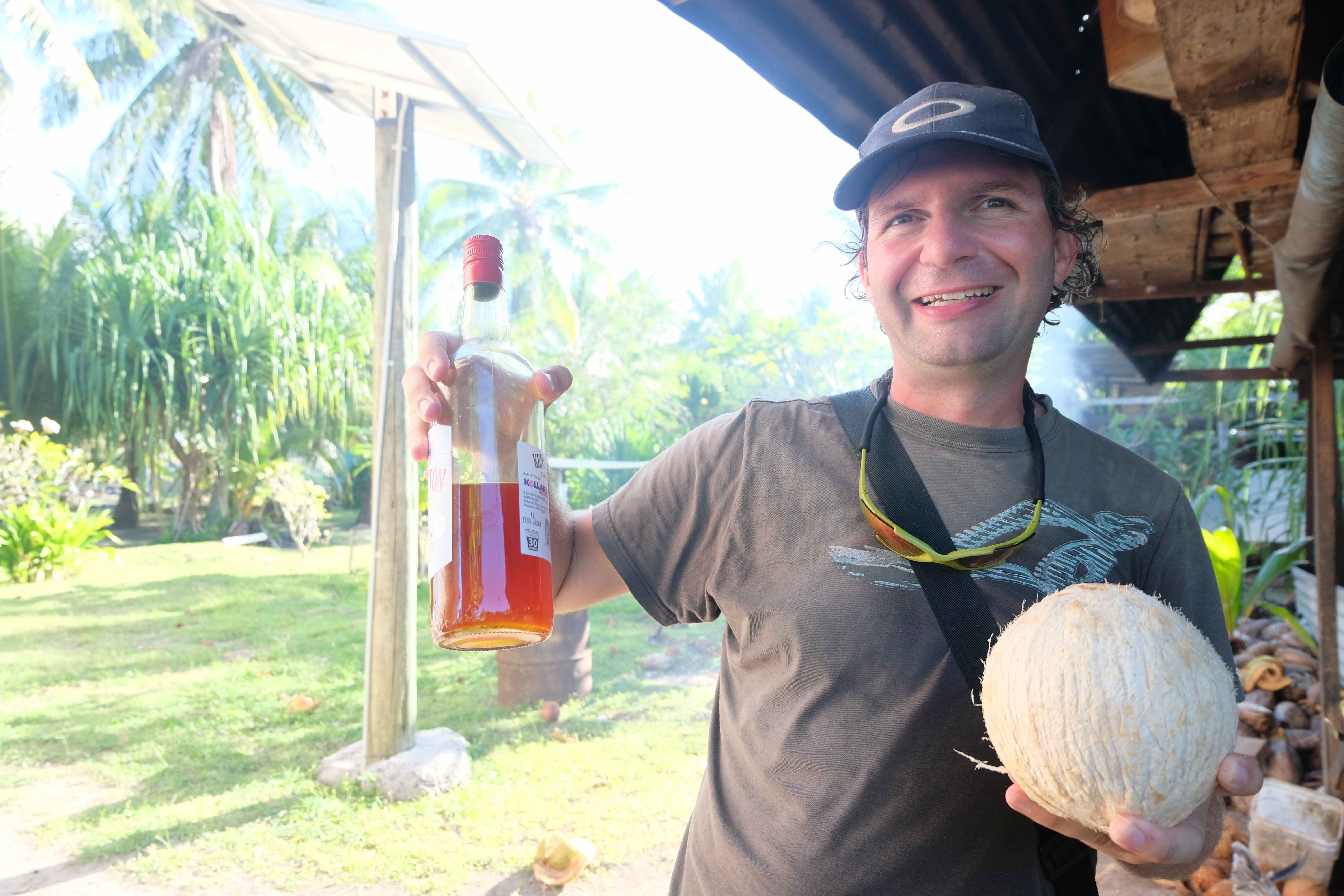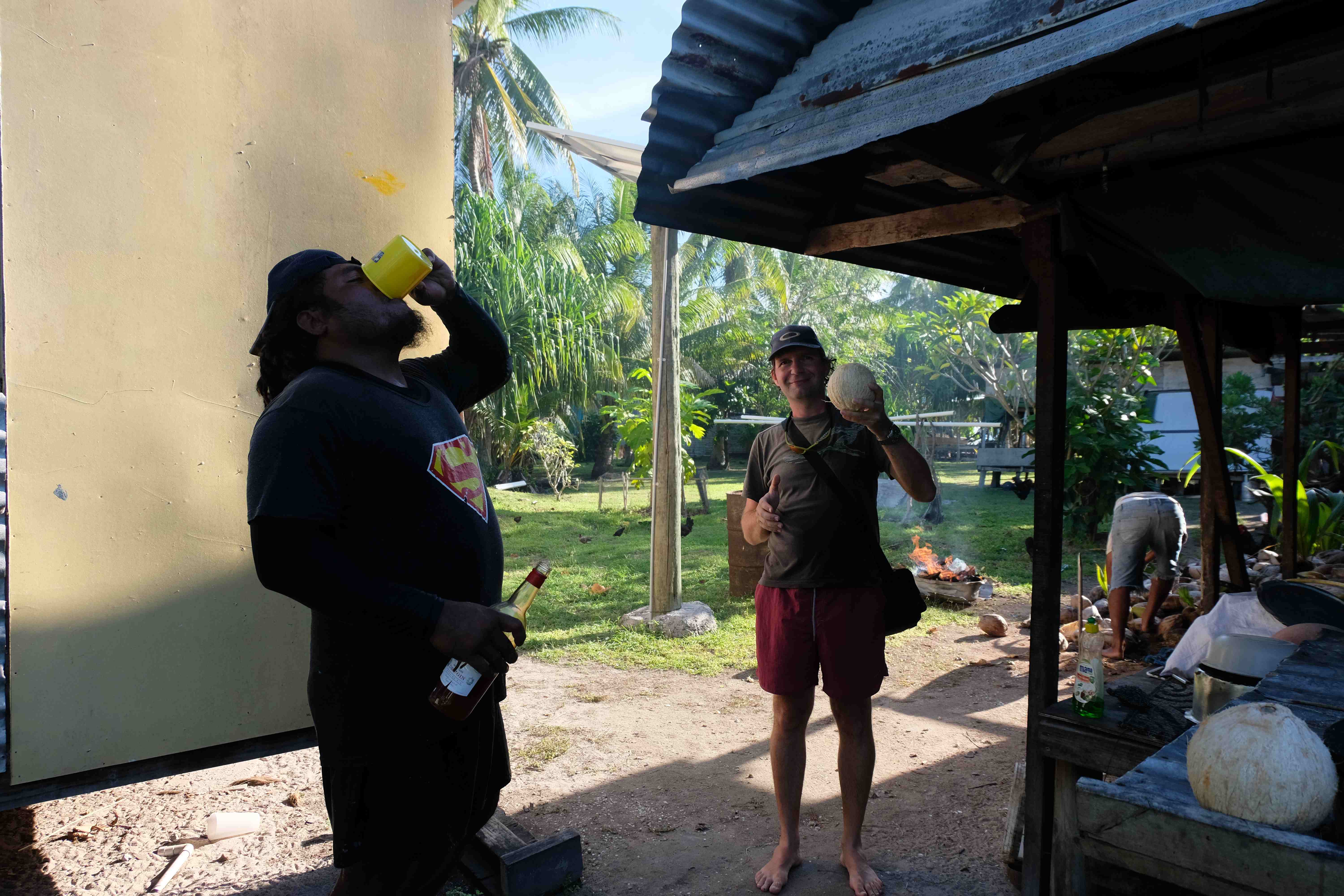 Nicht nur unglaubliche Taucherfahrungen und gratis Kokosnuss-Lieferdienst erhielten wir von unseren zwei Tour Leitern, sondern auch nützliche Ratschläge bezüglich ihrer Nachbarn: während wir uns vor den „Fijians“ und den „Kirbats“ in Acht nehmen sollten, da sie keine guten Menschen waren, sollten Staaten wie Samoa oder  Tonga kein Problem darstellen. Ihre Beschützer-Rolle verwandelte sich langsam in ein Freundschaftsangebot, welches sie unbedingt mit einem Geschenk markieren wollten. Erinnert ihr euch an den Red Toddy, den gekochten Palmensaft? Nun ja, wir sollten eine Flasche davon von ihnen erhalten. Allerdings teilten sie uns sehr seriös mit, dass wir ein offizielles Papier bräuchten, um diese bis in die Schweiz zu transportieren – nämlich eine Bestätigung von dem Landwirtschaftsministeriums Tuvalus für allfällige Zollkontrollen, dass wir berechtigt sind, dies mitzuführen. 🙂