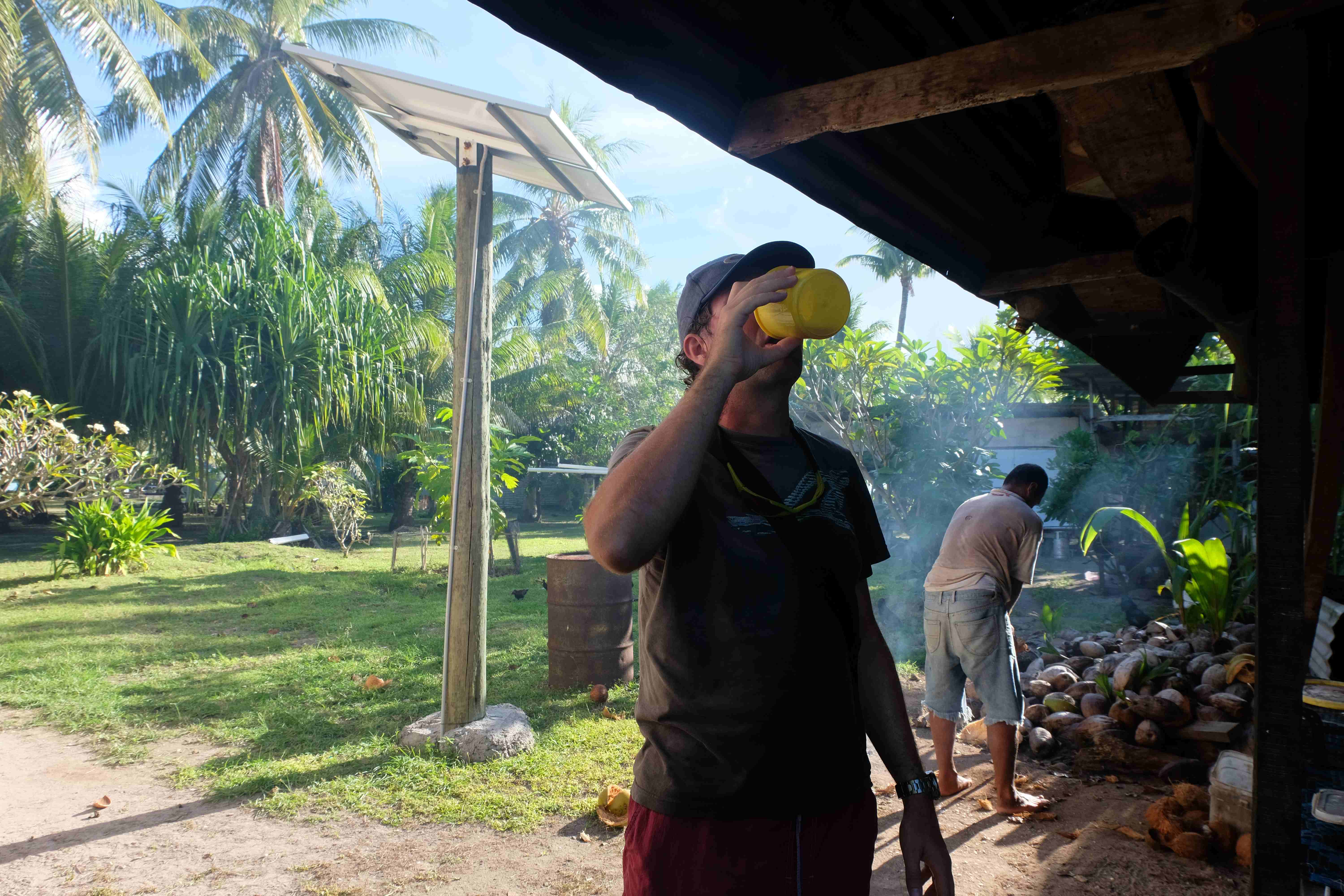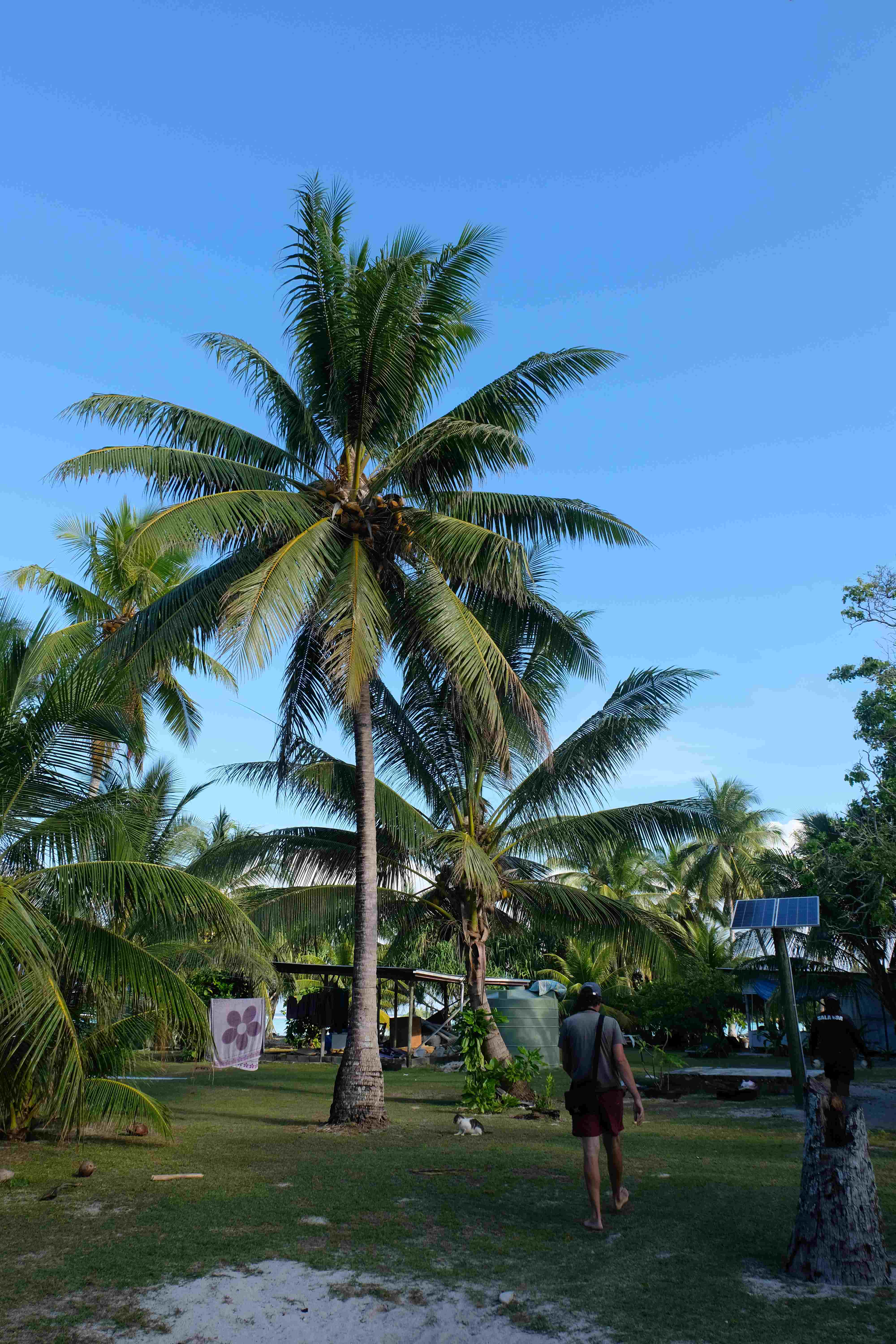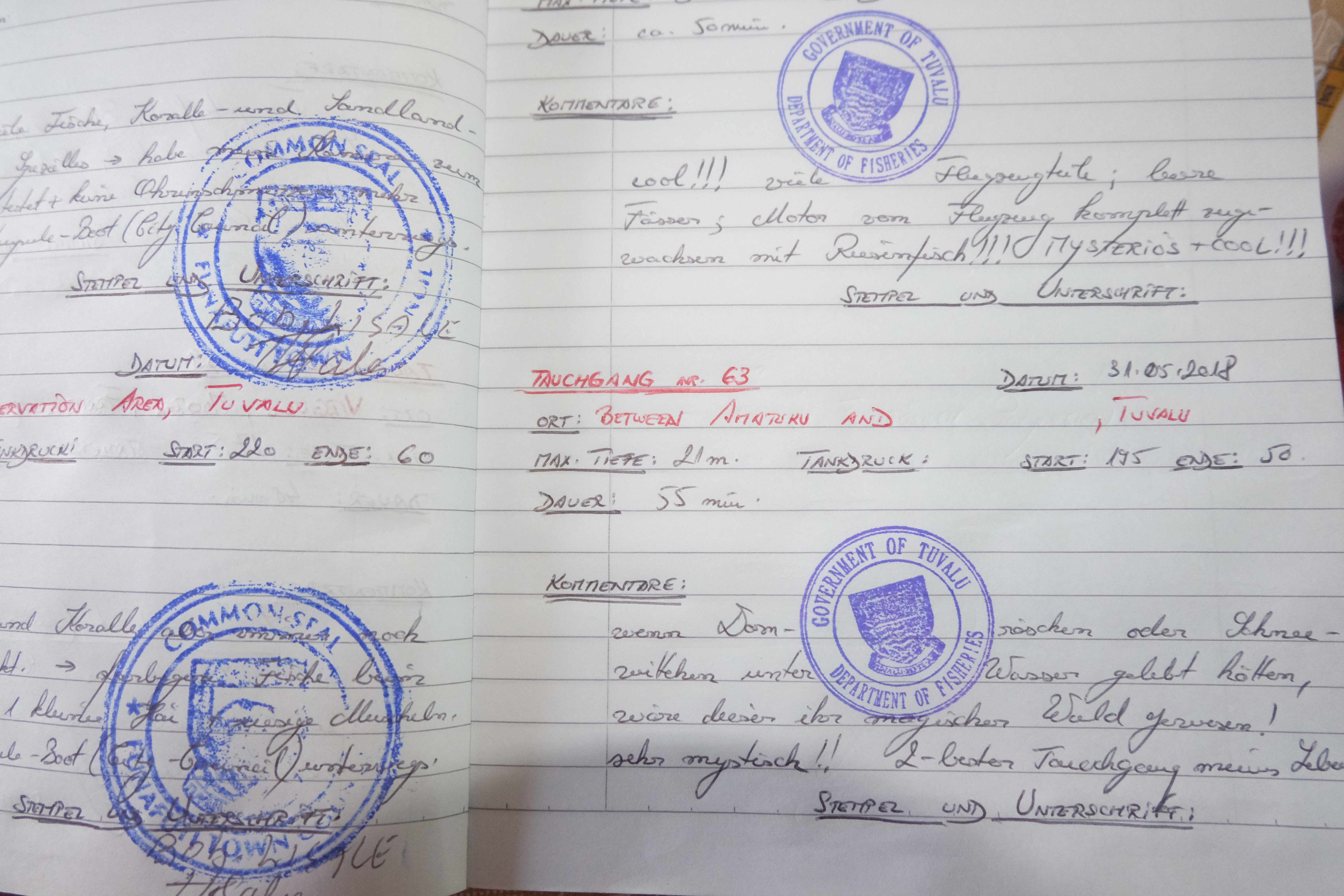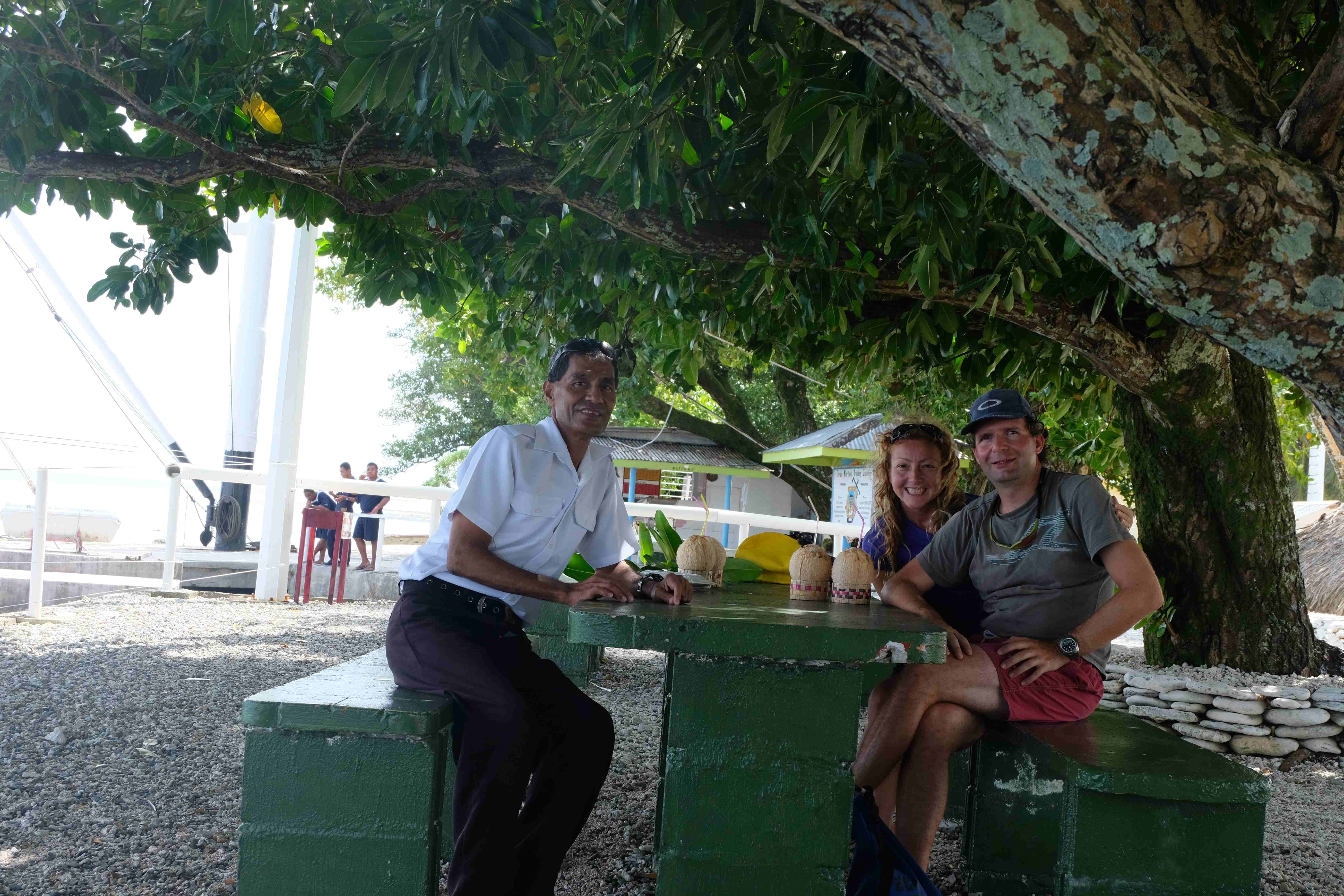 Nicht nur unglaubliche Taucherfahrungen und gratis Kokosnuss-Lieferdienst erhielten wir von unseren zwei Tour Leitern, sondern auch nützliche Ratschläge bezüglich ihrer Nachbarn: während wir uns vor den „Fijians“ und den „Kirbats“ in Acht nehmen sollten, da sie keine guten Menschen waren, sollten Staaten wie Samoa oder  Tonga kein Problem darstellen. Ihre Beschützer-Rolle verwandelte sich langsam in ein Freundschaftsangebot, welches sie unbedingt mit einem Geschenk markieren wollten. Erinnert ihr euch an den Red Toddy, den gekochten Palmensaft? Nun ja, wir sollten eine Flasche davon von ihnen erhalten. Allerdings teilten sie uns sehr seriös mit, dass wir ein offizielles Papier bräuchten, um diese bis in die Schweiz zu transportieren – nämlich eine Bestätigung von dem Landwirtschaftsministeriums Tuvalus für allfällige Zollkontrollen, dass wir berechtigt sind, dies mitzuführen. 🙂