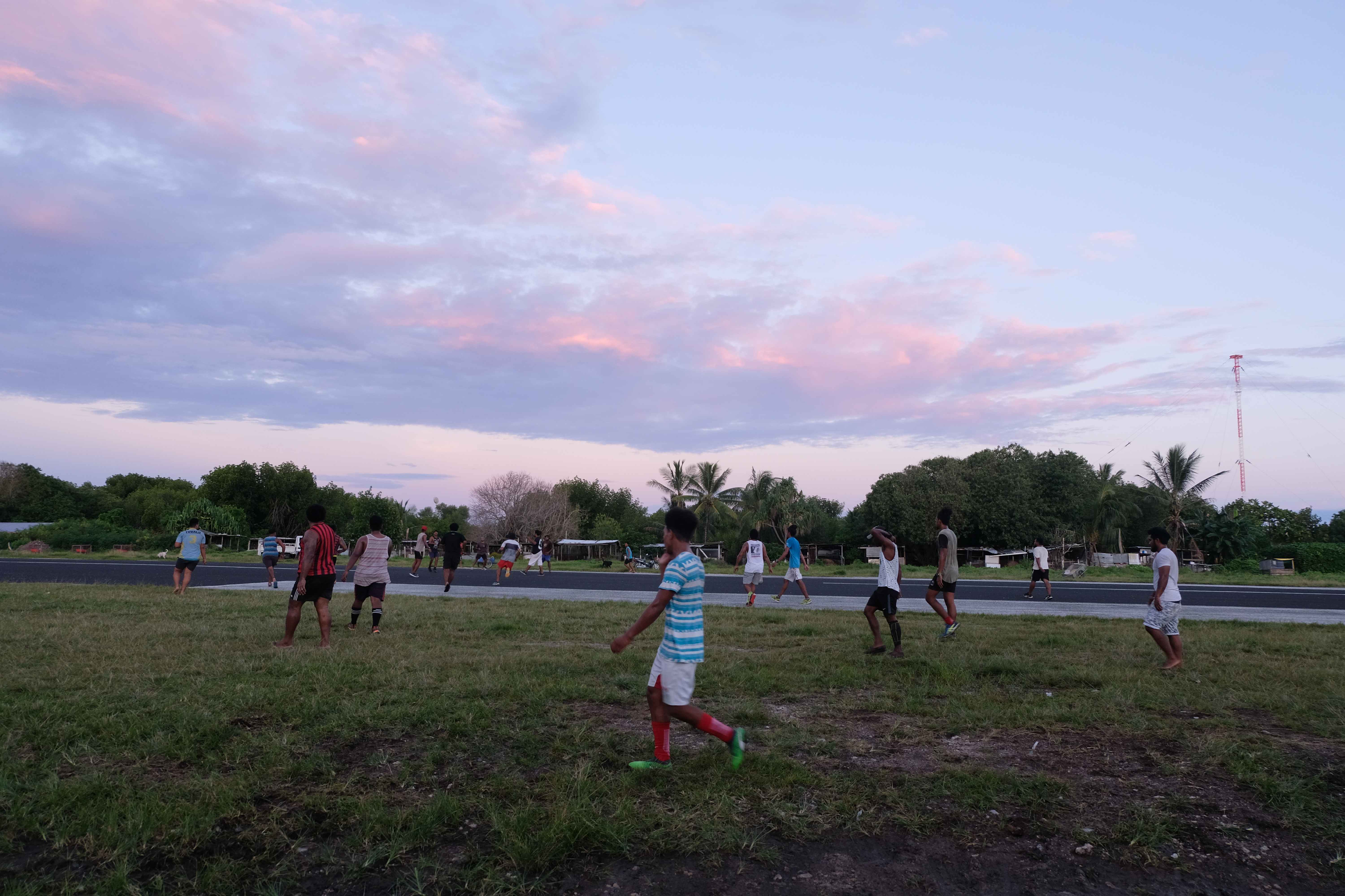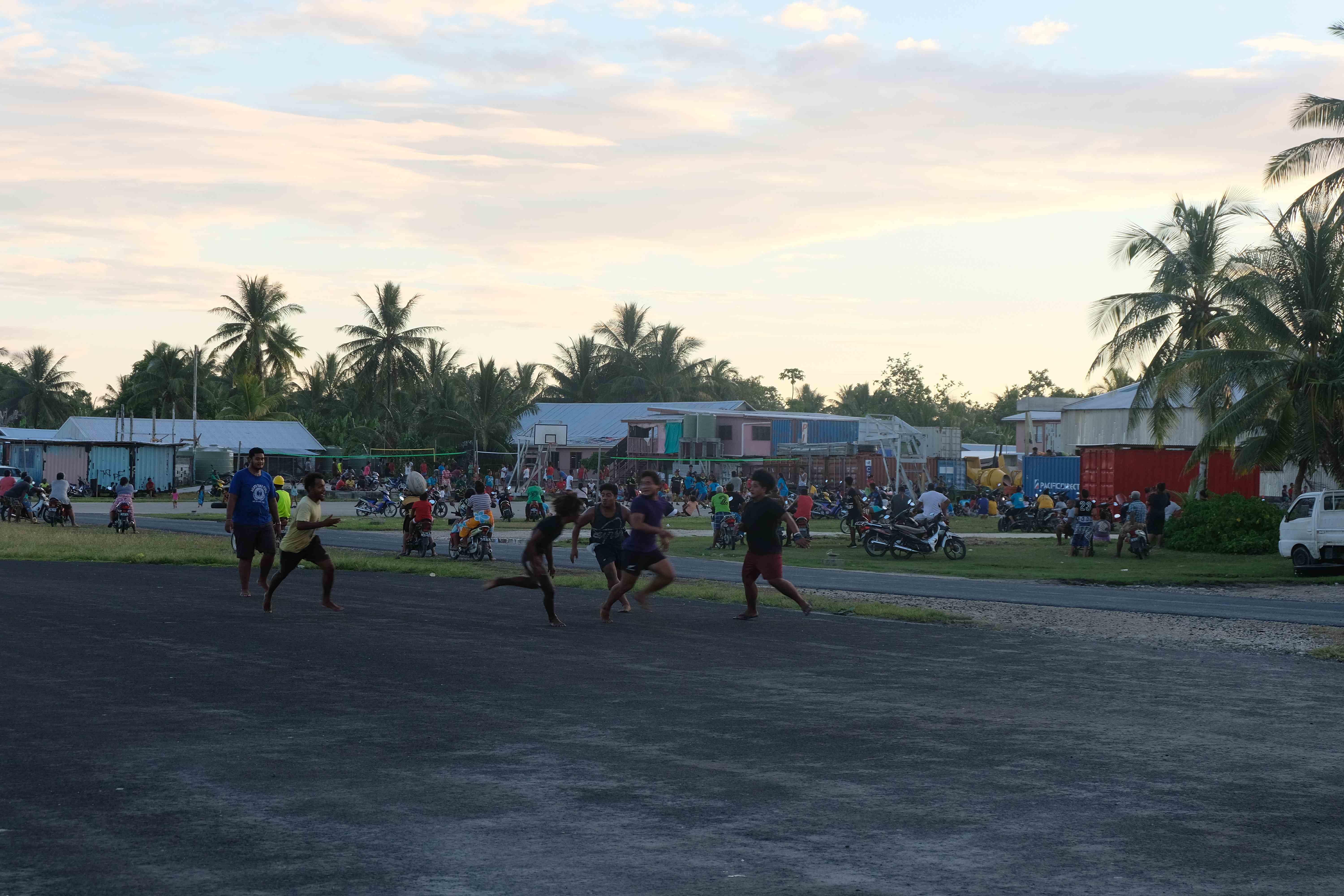 Der Versuch abzukühlen führte uns am Tag darauf ins Zentrum und den Rafi eigentlich auf konkrete Suche nach seiner neuen Liebe (ich wurde mittlerweile zu seiner alten deklassiert! :-)), nämlich frischem Kokosnusswasser. Dass wir dabei von einem einheimischen Journalisten aufgehalten wurden, welche uns interviewte und dies sogar mit einem Foto belegen wollte wird erst dann lustig zu erzählen, wenn wir in der tuvaluischen Lokalzeitung (welche er versprach uns via Email zuzusenden) verewigt werden! 🙂 Aber zurück zu unserer Alltagsbeschäftigung, der Kokosnusswasserjagd. Man stelle sich einen gierigen Rafi vor, welcher um sich herum lediglich kokosnussbeladene Palmen erblickte und bei mehreren Verkaufsständen und Lokalen solange danach fragte, bis ihm die beste Antwort aller Zeiten geliefert wurde: „Kokosnüsse werden hier nicht verkauft, Sie müssen jemanden bitten schnell rauf zu klettern und ihnen welche zu holen.“ 🙂 Spätestens wenn einem dies gesagt wird, realisiert man, wo man sich befindet! Wo sich jedoch die anderen – und damit ist die Mehrheit der sonst trotz der Hitze täglich fleissig arbeitenden Inselbevölkerung – nach 16 Uhr befanden, dies wussten wir nicht, bis wir der kühlen Brise und dem angenehmen Wind folgten und entlang der Landepiste/Autobahn/grösstem offenen Platz der Insel 90% der Bevölkerung antrafen. Während die jüngere Generation sich in zahlreichen Gruppen aufteilte und den Ballspielen widmete: Volleyball, Rugby, Fussball und weitere sportliche Betätigungen bildete die ältere Generation eher die – meistens auf den Motorrädern sitzende – Fankurve. Es war ein einmaliger Anblick und eine unglaubliche Entdeckung: man bog nur von der Strasse ab und man fand das ganze Dorf am Leben! Während es in den Metropolen der Welt an Zeit, Lust oder schlichtweg Lebensfreude fehlt sich zu versammeln, schaffte es die Bevölkerung einer knapp 12 km langen und an ihrer breitesten Stelle vermutlich höchstens 400 m breiten Insel das Leben viel stärker und krasser zu zelebrieren als manch andere hochentwickelte Gesellschaften! Wow ist vermutlich der beste Ausdruck dafür!