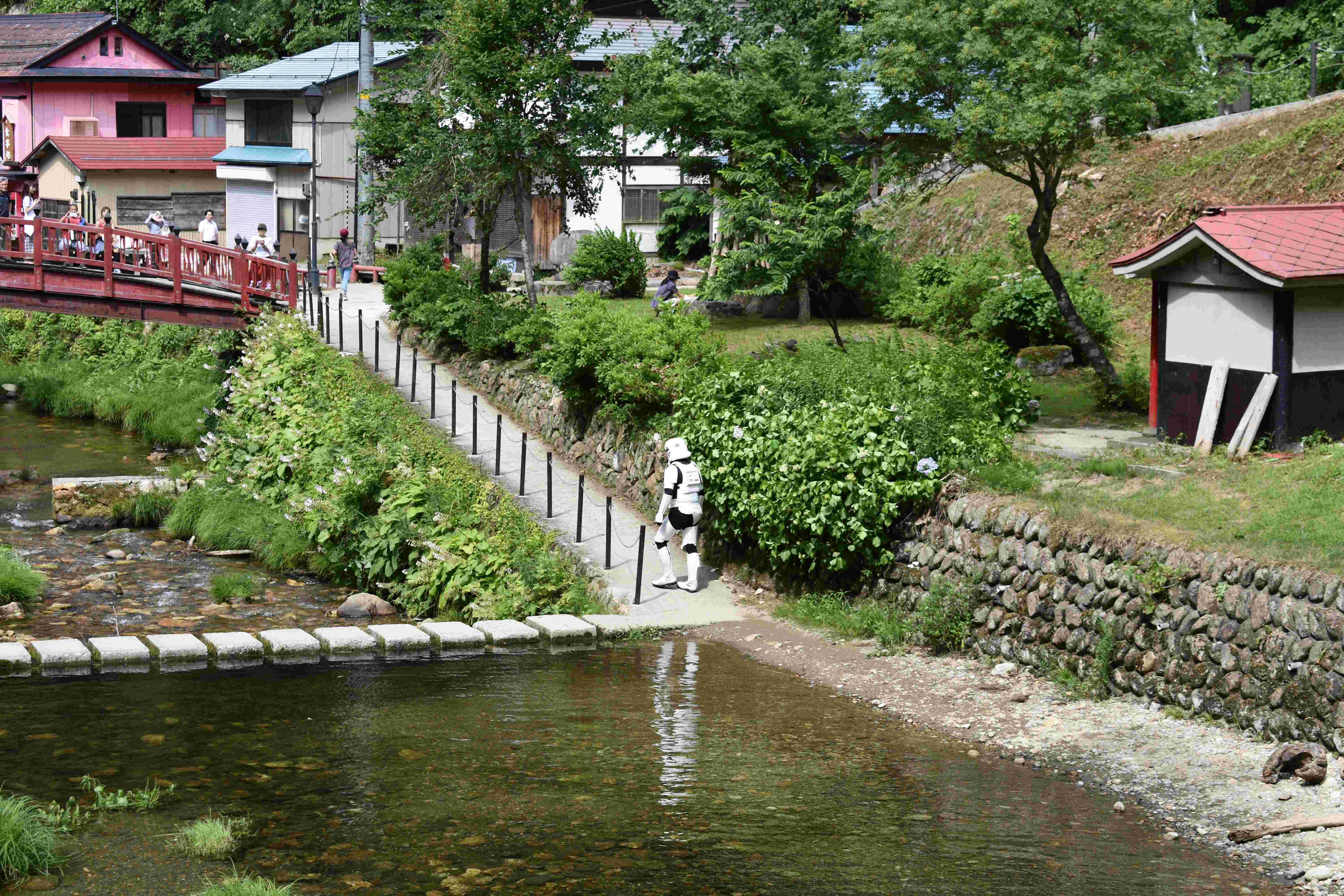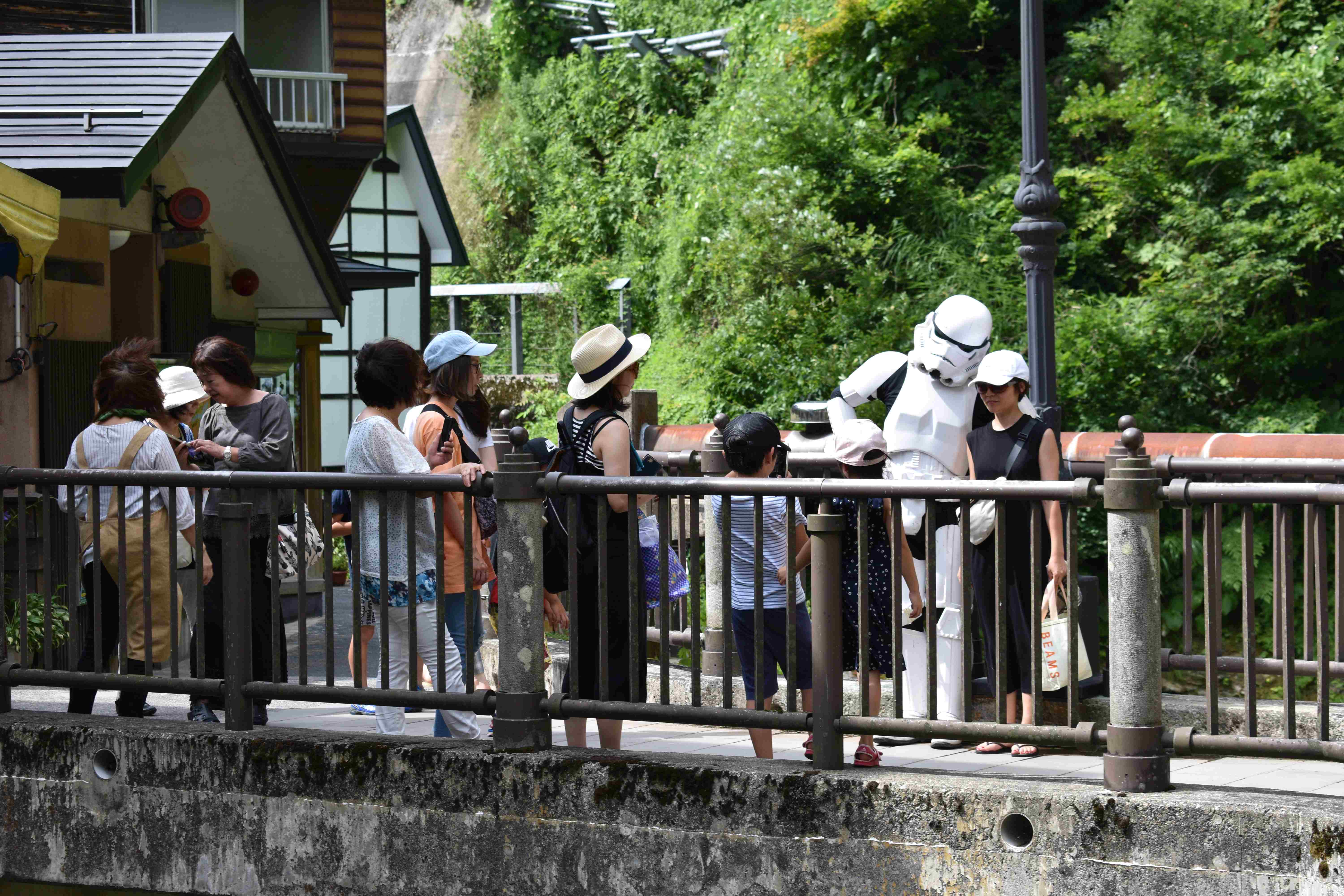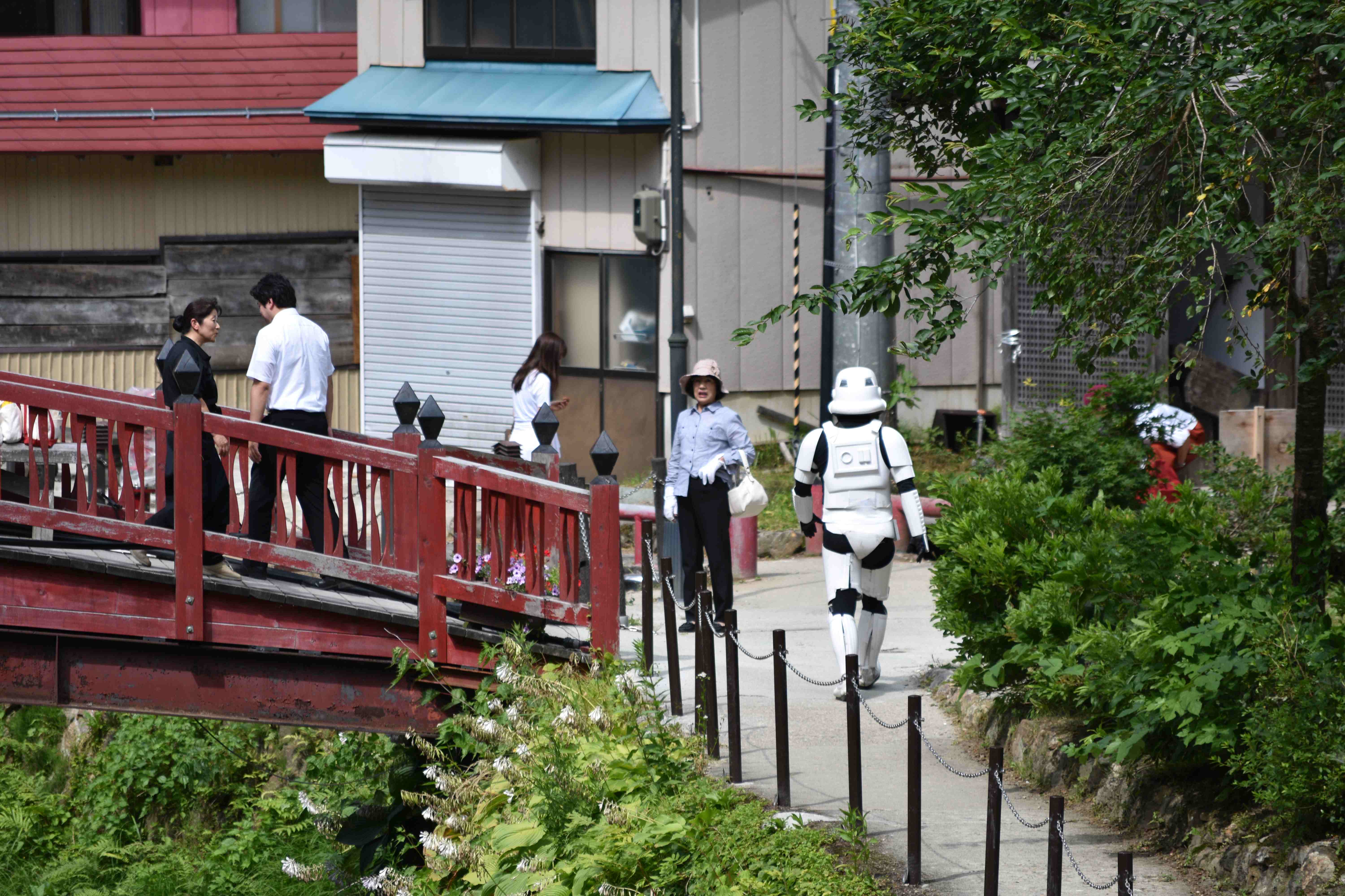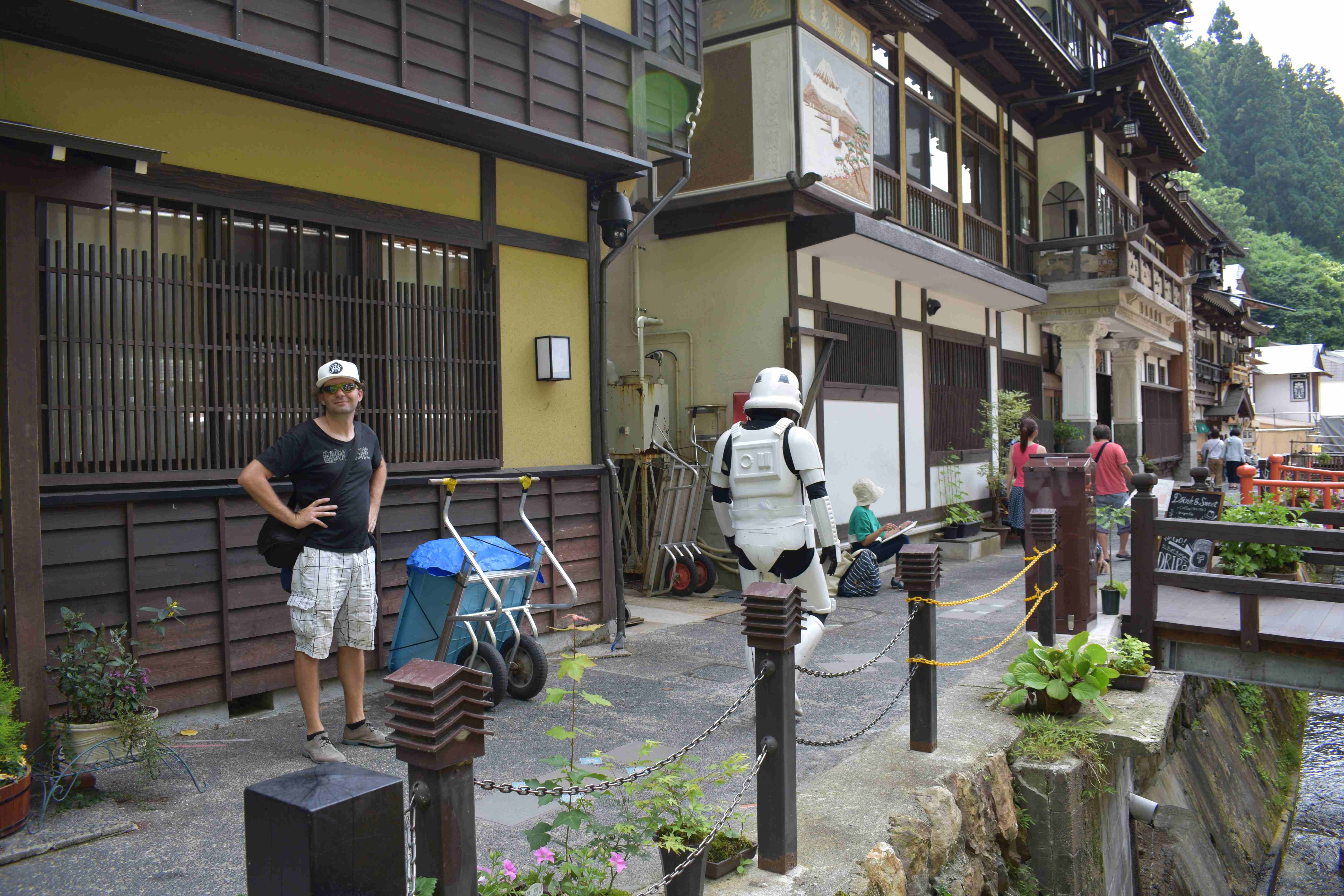 Aber zurück zu unserem Vorhaben: der lange Tagesausflug. Da wir bisher nur Städte und urbane Gegenden gesehen hatten, hatten wir mal Lust die etwas ländlichere und naturreichere Seite Japans zu erleben. Daher entschieden wir uns nach Ginzan Onsen zu gehen. Ginzan Onsen ist ein kleines idyllisches Örtchen, vor allem als Winter-Thermal-Kurort bekannt. Da kann man noch einen Hauch vom alten Japan erleben und die ansonsten meistens verloren gegangene Architektur bewundern. Und siehe da, genau dann, wenn man die Hoffnung aufgegeben hat, läuft einem ein spazierender Robocop über den Weg! 🙂